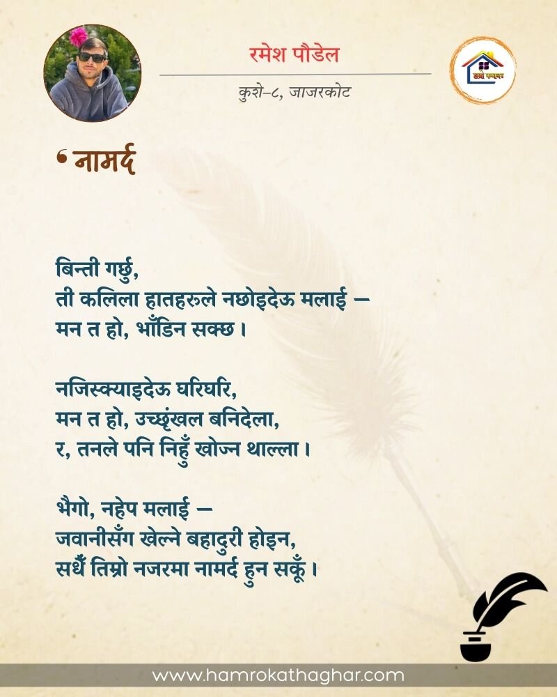 नेपाली भाषा साहित्यलाई माया गरेर यहाँसम्म आइ, यहाँ प्रकाशित लेख/रचनाहरू पढिदिनु भएकोमा तपाईँलाई धेरै धेरै धन्यवाद। तपाईँले भर्खरै माथि पढेको लेख/रचना कस्तो लाग्यो कमेन्ट बक्समा आफ्नो प्रतिक्रिया राख्न सक्नु हुनेछ। आफ्नो मनमा लागेको प्रतिक्रिया राख्न तपाईँ स्वतन्त्र हुनुहुन्छ। यदि तपाईँ पनि नेपाली भाषा साहित्यमा कलम चलाउनु हुन्छ भने आफ्नो छोटो परिचय र एक प्रति अनुहार चिनिने तस्बिर सहित आफ्ना लेख/रचनाहरू हामीलाई hamrokathaghar@gmail.com मा पठाउन सक्नु हुनेछ। अन्य कुनै पनि जानकारीका लागि +९१८७३८०९३५७३ नम्बरमा ह्वाट्सएप गर्न सक्नु हुनेछ। धन्यवाद । नोट: यहाँ प्रकाशित कुनै पनि लेख/रचनाहरू लेखकको वा 'हाम्रो कथा घर' को अनुमति बिना कुनै पनि माध्यमबाट प्रकाशन प्रसारण गर्न पाइने छैन । अन्यथा, यस्तो गरिएको पाएमा प्रचलित कानुन बमोजिम कारबाही गरिने जानकारी गराउँदछौ।