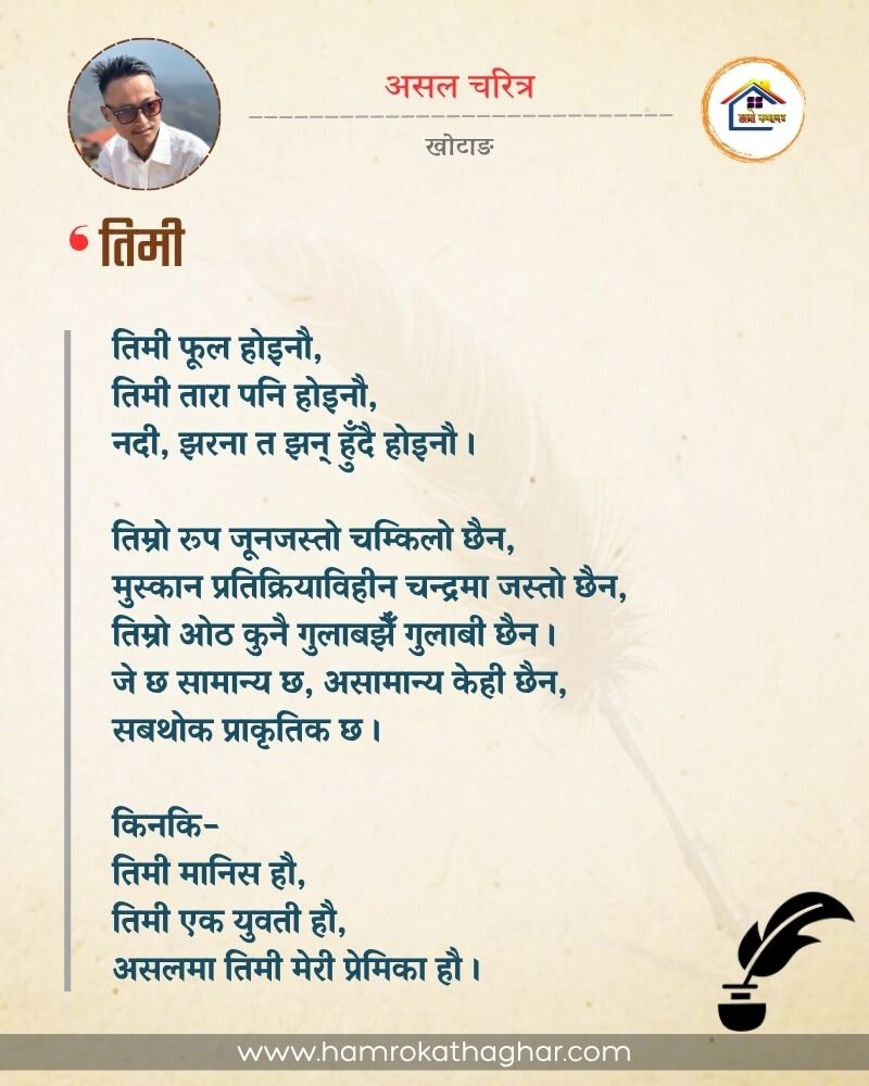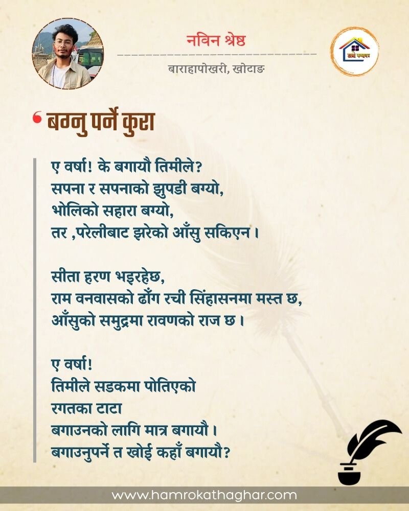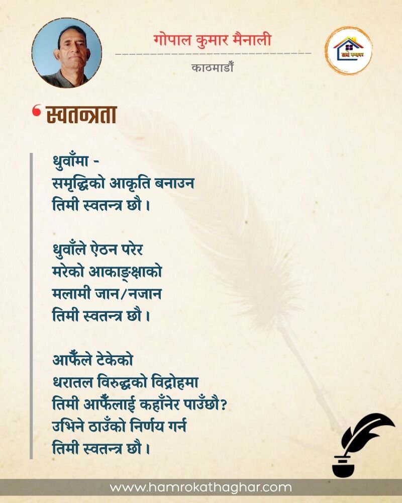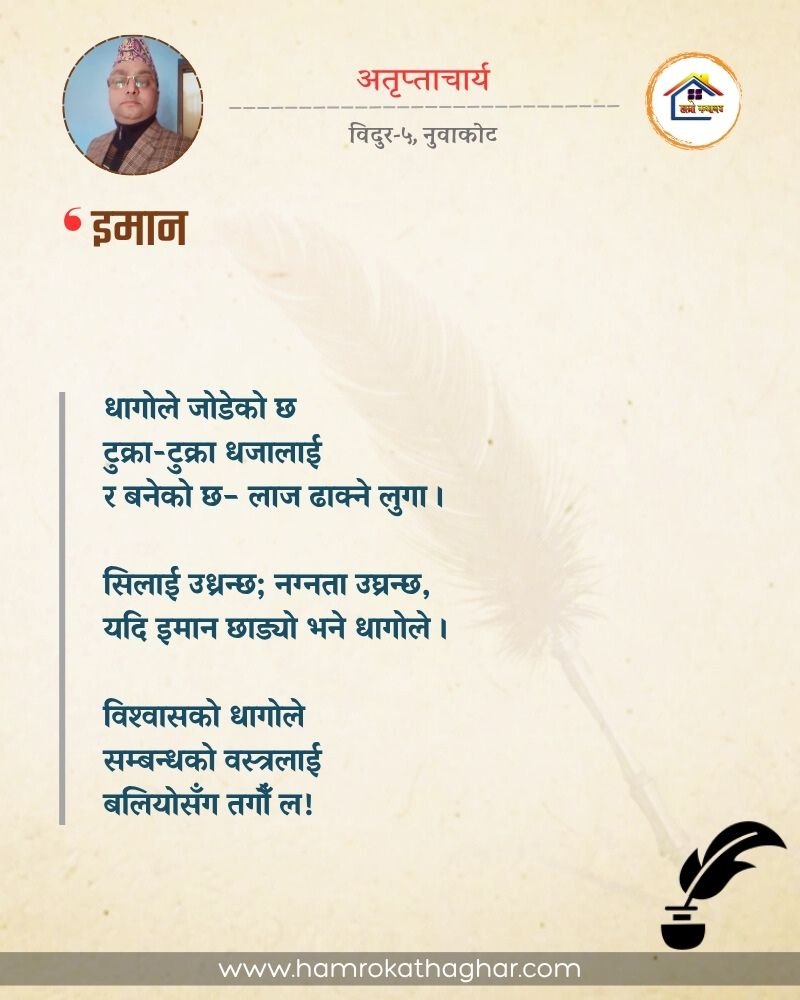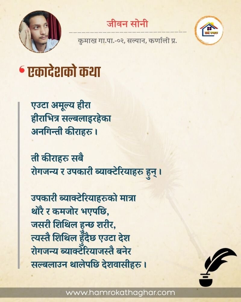 नेपाली भाषा साहित्यलाई माया गरेर यहाँसम्म आइ, यहाँ प्रकाशित लेख/रचनाहरू पढिदिनु भएकोमा तपाईँलाई धेरै धेरै धन्यवाद। तपाईँले भर्खरै माथि पढेको लेख/रचना कस्तो लाग्यो कमेन्ट बक्समा आफ्नो प्रतिक्रिया राख्न सक्नु हुनेछ। आफ्नो मनमा लागेको प्रतिक्रिया राख्न तपाईँ स्वतन्त्र हुनुहुन्छ। यदि तपाईँ पनि नेपाली भाषा साहित्यमा कलम चलाउनु हुन्छ भने आफ्नो छोटो परिचय र एक प्रति अनुहार चिनिने तस्बिर सहित आफ्ना लेख/रचनाहरू हामीलाई hamrokathaghar@gmail.com मा पठाउन सक्नु हुनेछ। अन्य कुनै पनि जानकारीका लागि +९१८७३८०९३५७३ नम्बरमा ह्वाट्सएप गर्न सक्नु हुनेछ। धन्यवाद । नोट: यहाँ प्रकाशित कुनै पनि लेख/रचनाहरू लेखकको वा 'हाम्रो कथा घर' को अनुमति बिना कुनै पनि माध्यमबाट प्रकाशन प्रसारण गर्न पाइने छैन । अन्यथा, यस्तो गरिएको पाएमा प्रचलित कानुन बमोजिम कारबाही गरिने जानकारी गराउँदछौ।