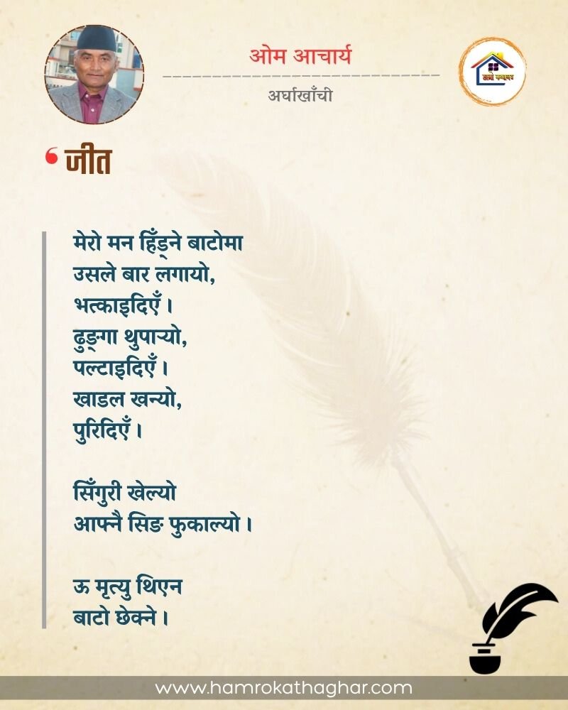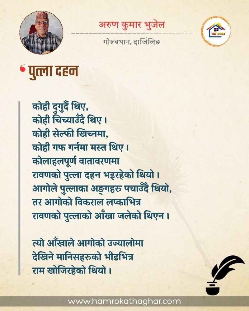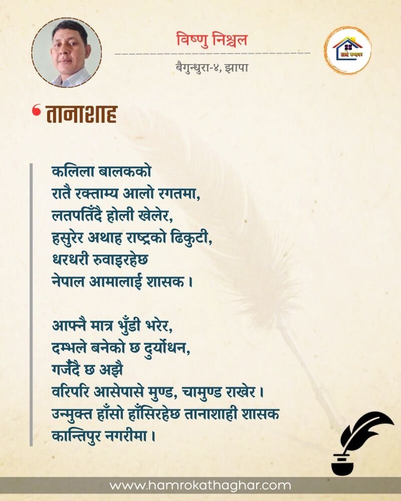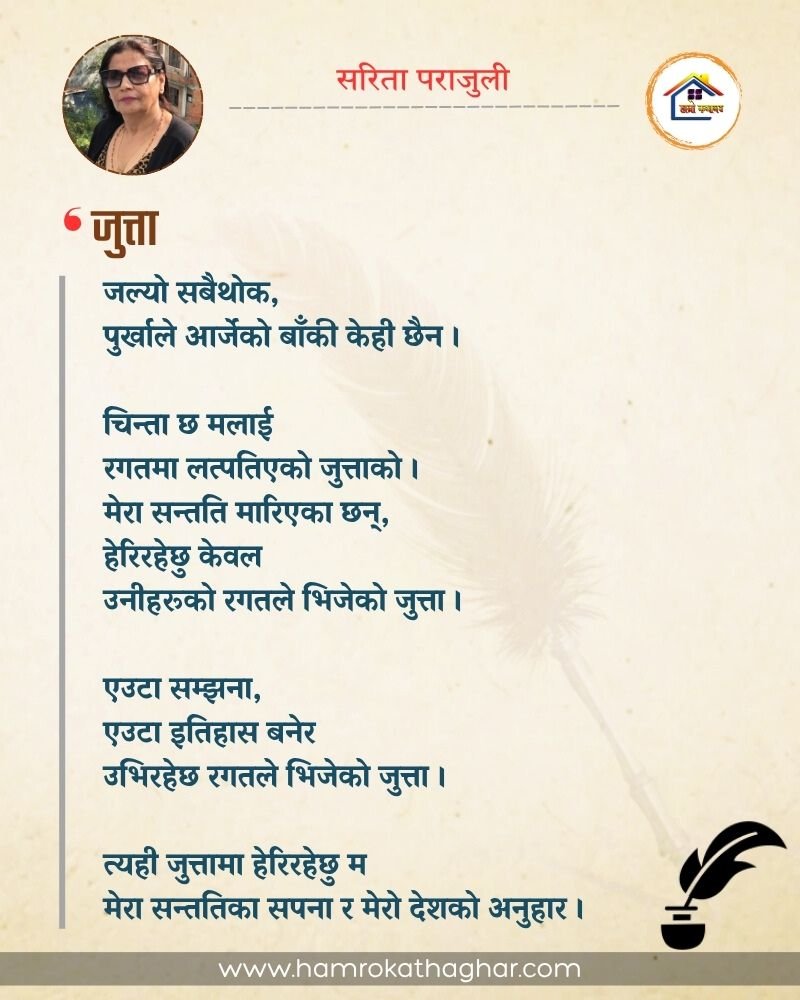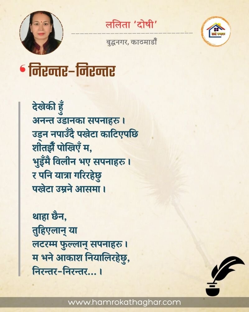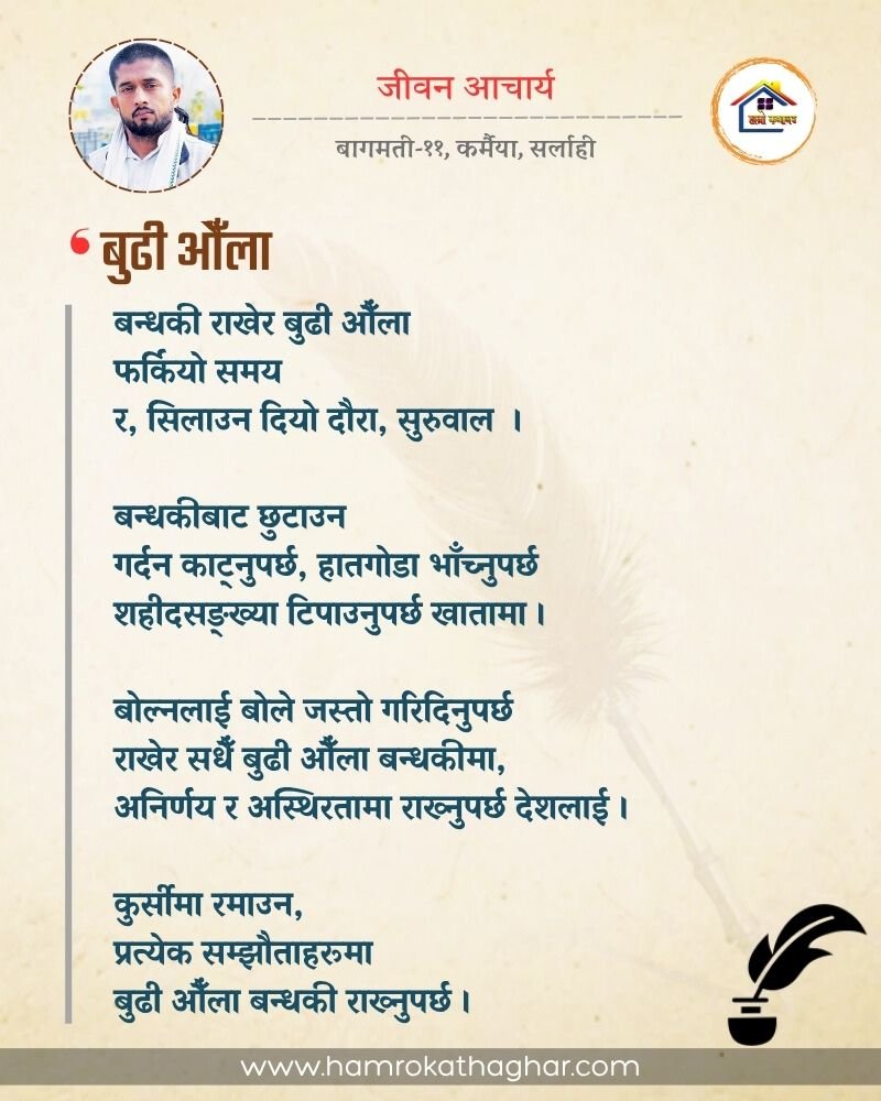 नेपाली भाषा साहित्यलाई माया गरेर यहाँसम्म आइ, यहाँ प्रकाशित लेख/रचनाहरू पढिदिनु भएकोमा तपाईँलाई धेरै धेरै धन्यवाद। तपाईँले भर्खरै माथि पढेको लेख/रचना कस्तो लाग्यो कमेन्ट बक्समा आफ्नो प्रतिक्रिया राख्न सक्नु हुनेछ। आफ्नो मनमा लागेको प्रतिक्रिया राख्न तपाईँ स्वतन्त्र हुनुहुन्छ। यदि तपाईँ पनि नेपाली भाषा साहित्यमा कलम चलाउनु हुन्छ भने आफ्नो छोटो परिचय र एक प्रति अनुहार चिनिने तस्बिर सहित आफ्ना लेख/रचनाहरू हामीलाई hamrokathaghar@gmail.com मा पठाउन सक्नु हुनेछ। अन्य कुनै पनि जानकारीका लागि +९१८७३८०९३५७३ नम्बरमा ह्वाट्सएप गर्न सक्नु हुनेछ। धन्यवाद । नोट: यहाँ प्रकाशित कुनै पनि लेख/रचनाहरू लेखकको वा 'हाम्रो कथा घर' को अनुमति बिना कुनै पनि माध्यमबाट प्रकाशन प्रसारण गर्न पाइने छैन । अन्यथा, यस्तो गरिएको पाएमा प्रचलित कानुन बमोजिम कारबाही गरिने जानकारी गराउँदछौ।