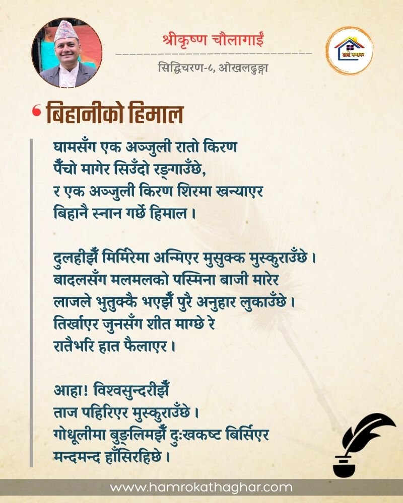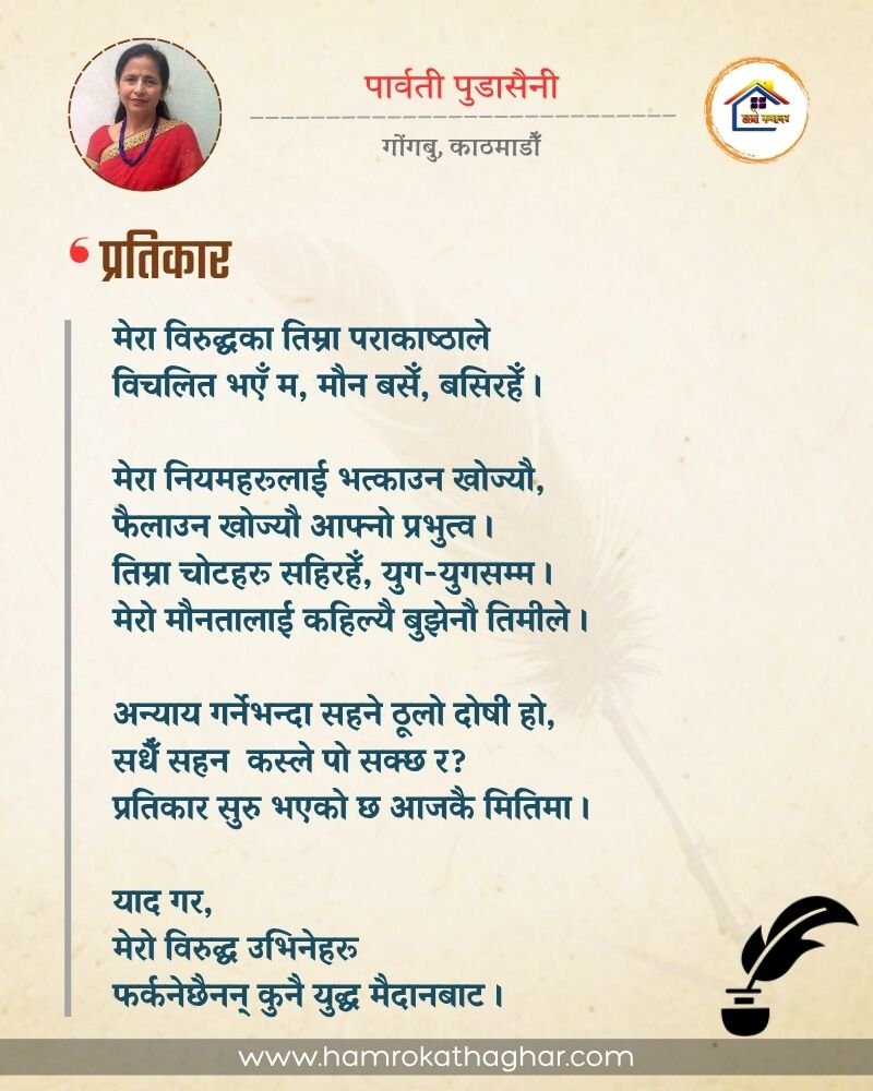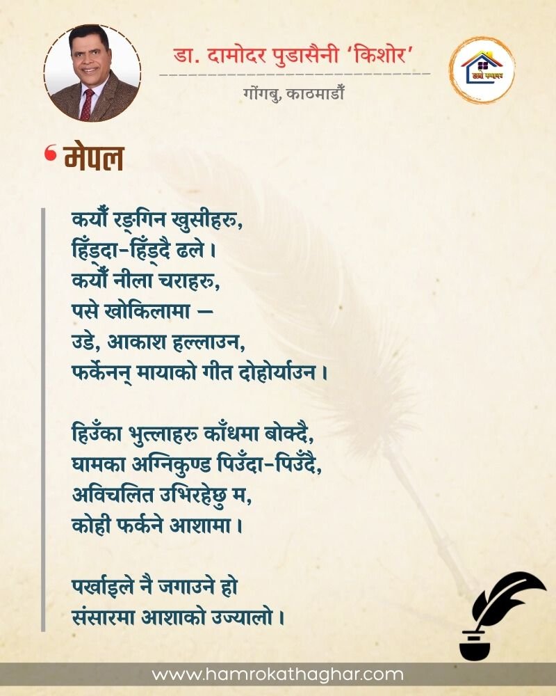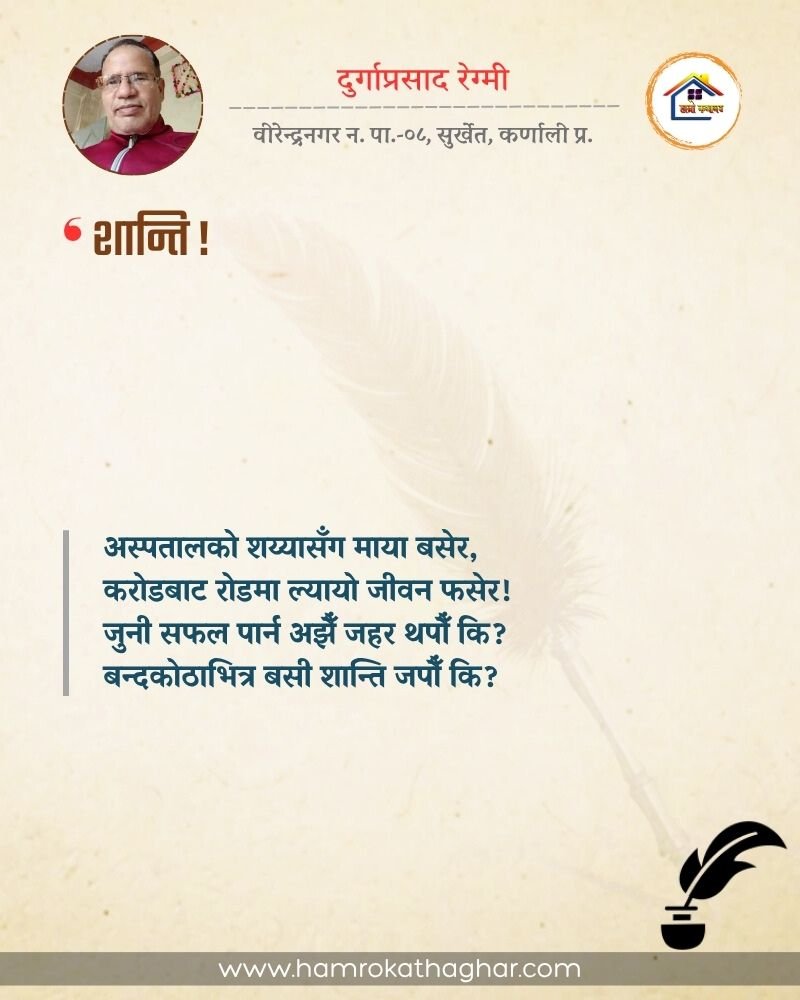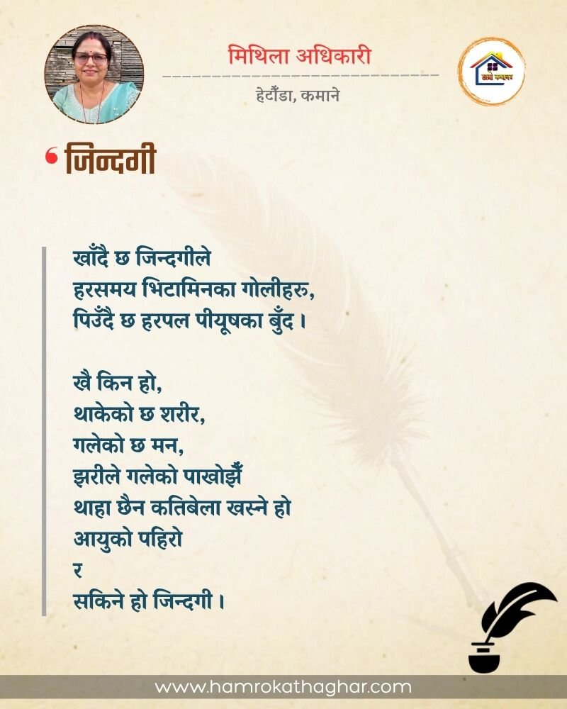 नेपाली भाषा साहित्यलाई माया गरेर यहाँसम्म आइ, यहाँ प्रकाशित लेख/रचनाहरू पढिदिनु भएकोमा तपाईँलाई धेरै धेरै धन्यवाद। तपाईँले भर्खरै माथि पढेको लेख/रचना कस्तो लाग्यो कमेन्ट बक्समा आफ्नो प्रतिक्रिया राख्न सक्नु हुनेछ। आफ्नो मनमा लागेको प्रतिक्रिया राख्न तपाईँ स्वतन्त्र हुनुहुन्छ। यदि तपाईँ पनि नेपाली भाषा साहित्यमा कलम चलाउनु हुन्छ भने आफ्नो छोटो परिचय र एक प्रति अनुहार चिनिने तस्बिर सहित आफ्ना लेख/रचनाहरू हामीलाई hamrokathaghar@gmail.com मा पठाउन सक्नु हुनेछ। अन्य कुनै पनि जानकारीका लागि +९१८७३८०९३५७३ नम्बरमा ह्वाट्सएप गर्न सक्नु हुनेछ। धन्यवाद । नोट: यहाँ प्रकाशित कुनै पनि लेख/रचनाहरू लेखकको वा 'हाम्रो कथा घर' को अनुमति बिना कुनै पनि माध्यमबाट प्रकाशन प्रसारण गर्न पाइने छैन । अन्यथा, यस्तो गरिएको पाएमा प्रचलित कानुन बमोजिम कारबाही गरिने जानकारी गराउँदछौ।
