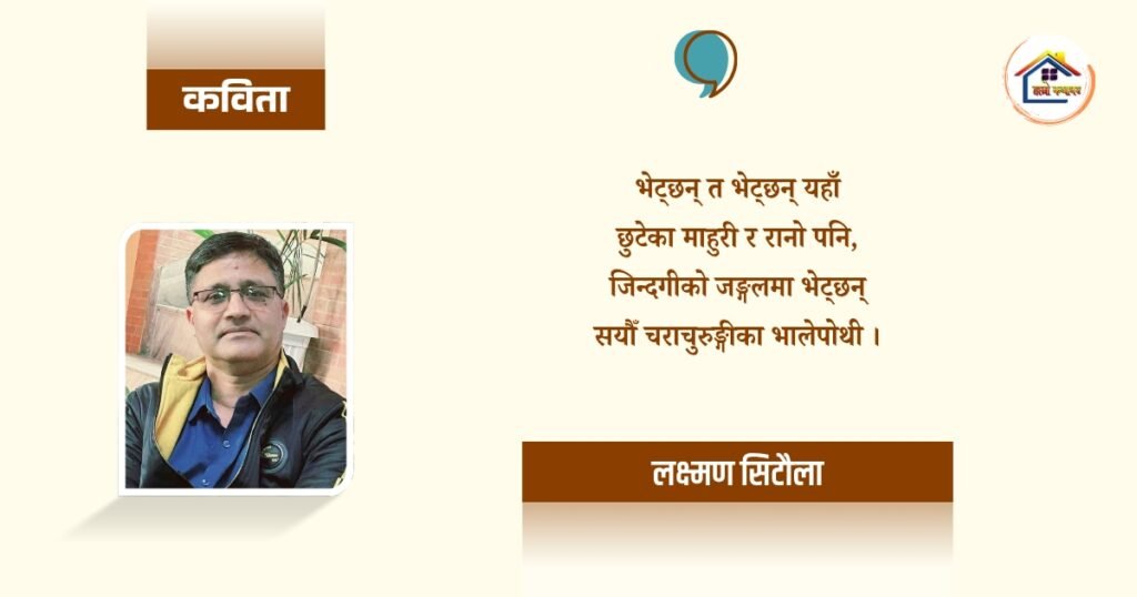 नेपाली भाषा साहित्यलाई माया गरेर यहाँसम्म आइ, यहाँ प्रकाशित लेख/रचनाहरू पढिदिनु भएकोमा तपाईँलाई धेरै धेरै धन्यवाद। तपाईँले भर्खरै माथि पढेको लेख/रचना कस्तो लाग्यो कमेन्ट बक्समा आफ्नो प्रतिक्रिया राख्न सक्नु हुनेछ। आफ्नो मनमा लागेको प्रतिक्रिया राख्न तपाईँ स्वतन्त्र हुनुहुन्छ। यदि तपाईँ पनि नेपाली भाषा साहित्यमा कलम चलाउनु हुन्छ भने आफ्नो छोटो परिचय र एक प्रति अनुहार चिनिने तस्बिर सहित आफ्ना लेख/रचनाहरू हामीलाई hamrokathaghar@gmail.com मा पठाउन सक्नु हुनेछ। अन्य कुनै पनि जानकारीका लागि +९१८७३८०९३५७३ नम्बरमा ह्वाट्सएप गर्न सक्नु हुनेछ। धन्यवाद । नोट: यहाँ प्रकाशित कुनै पनि लेख/रचनाहरू लेखकको वा 'हाम्रो कथा घर' को अनुमति बिना कुनै पनि माध्यमबाट प्रकाशन प्रसारण गर्न पाइने छैन । अन्यथा, यस्तो गरिएको पाएमा प्रचलित कानुन बमोजिम कारबाही गरिने जानकारी गराउँदछौ।