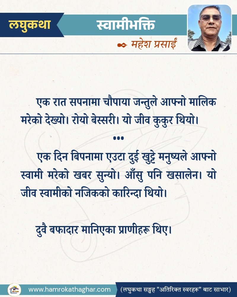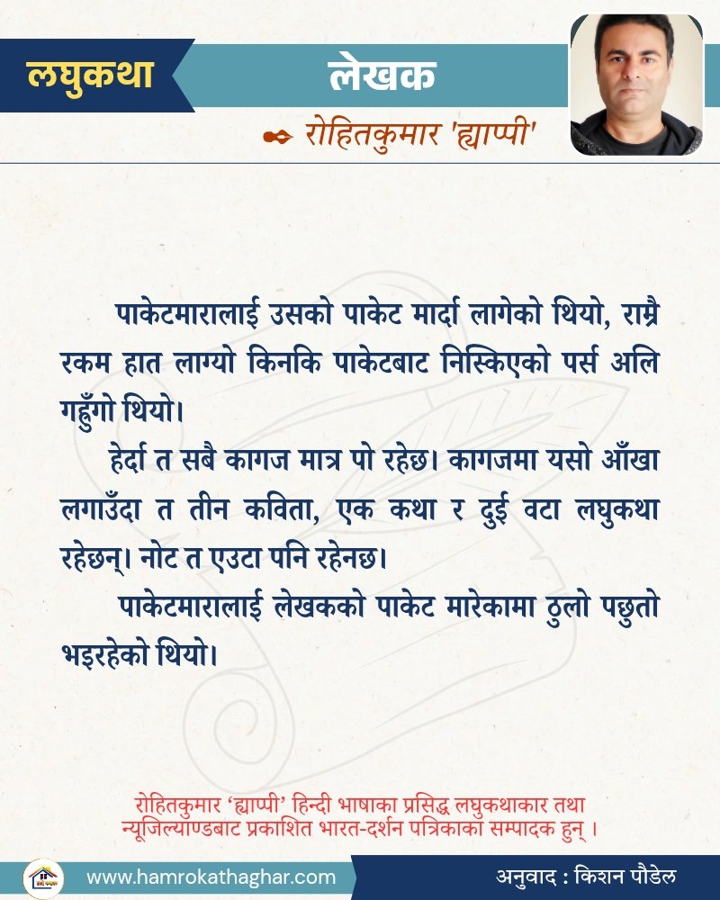हाम्रो कथाघरको यस ‘स्मार्ट लघुकथा’ स्तम्भका संयोजक तथा सम्पादक हेटौँडाका कवि एवम् लघुकथाकार किशन पौडेल हुनुहुन्छ। यस स्तम्भमा नेपाली लघुकथाका साथै देश-विदेशका लेखकहरूका छोटा, गहन र मानवीय संवेदनाले ओतप्रोत सामाजिक विषयका लघुकथाहरू प्रकाशन गरिनेछ।