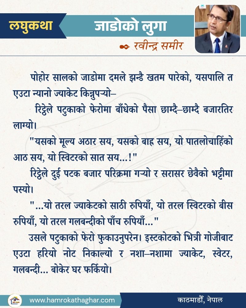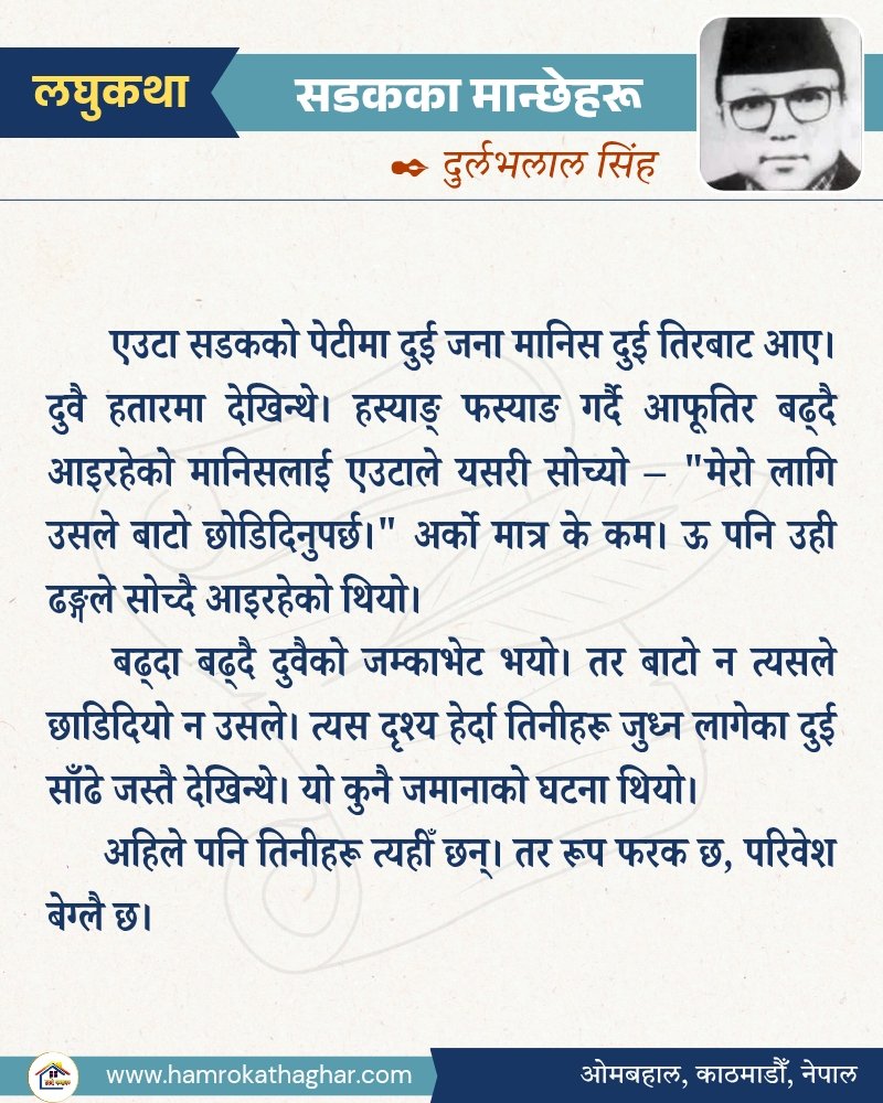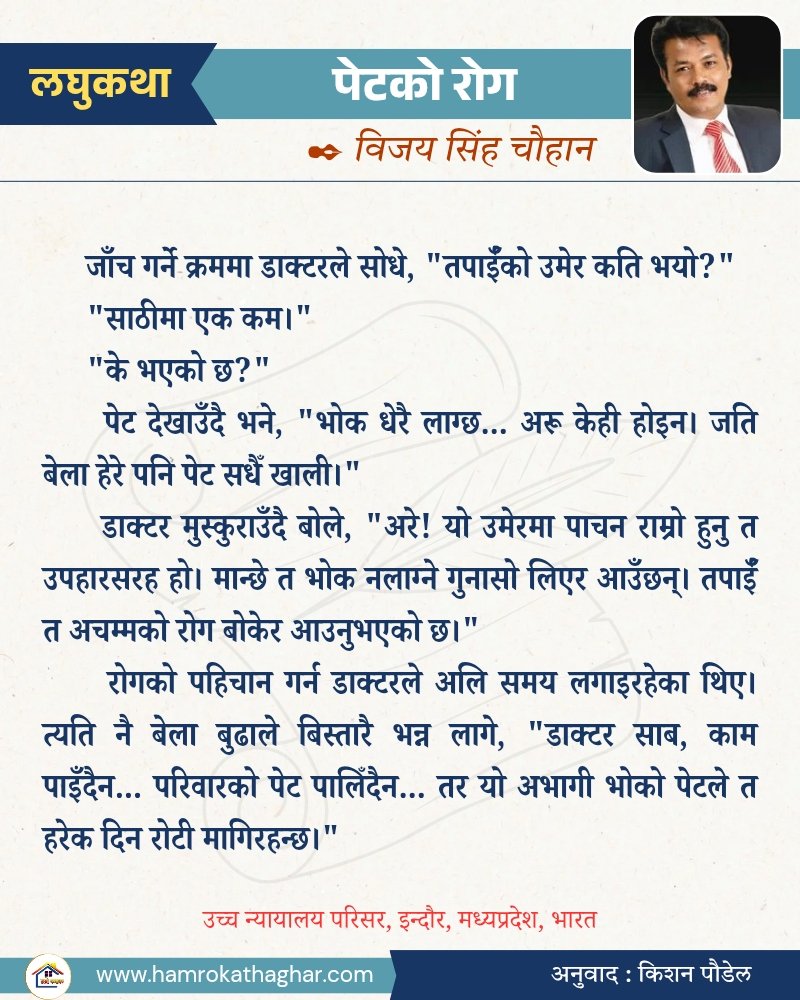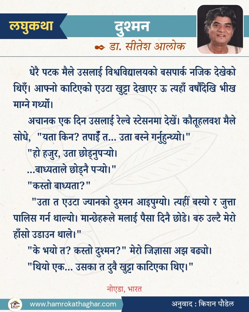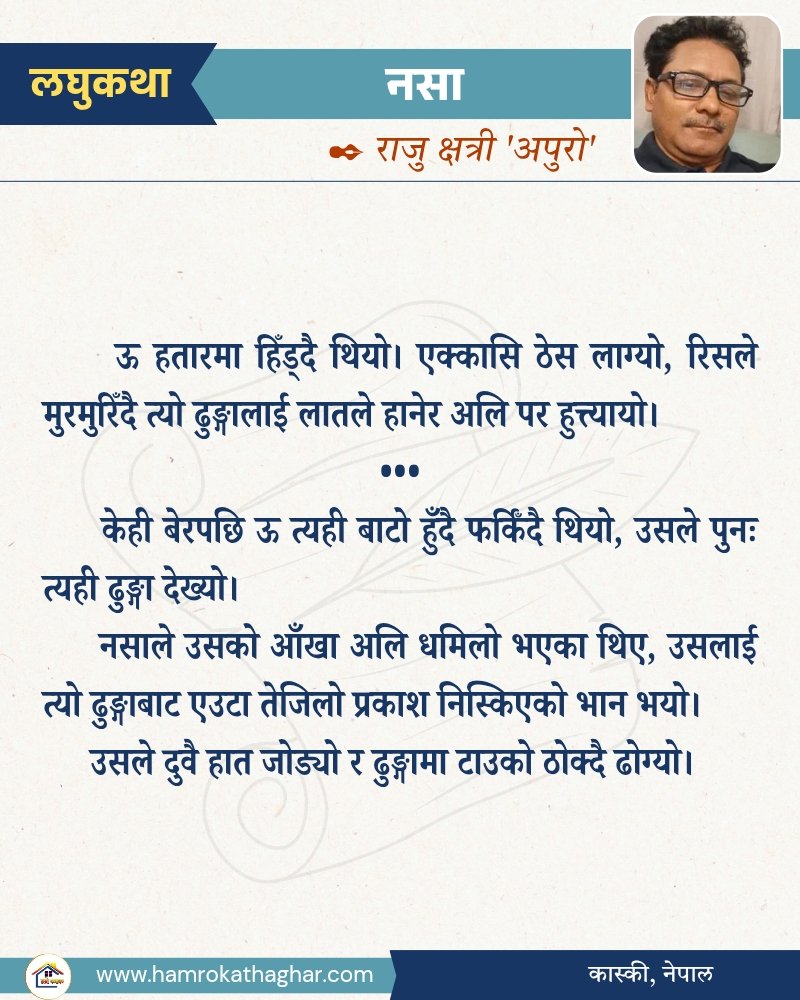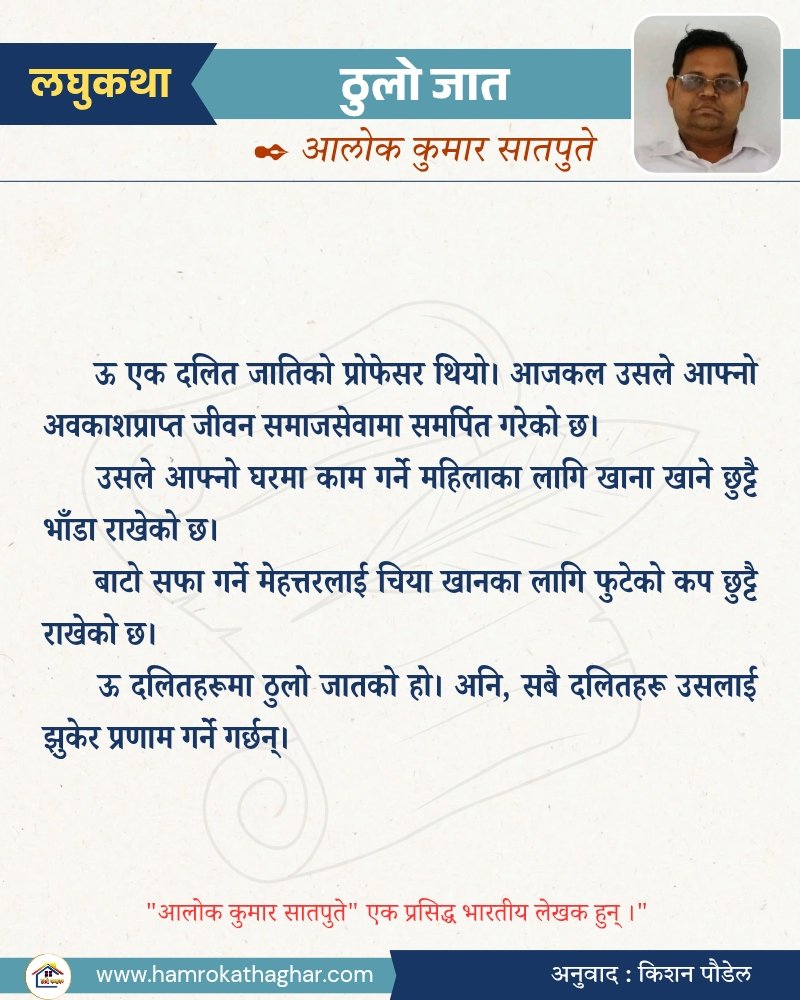 नेपाली भाषा साहित्यलाई माया गरेर यहाँसम्म आइ, यहाँ प्रकाशित लेख/रचनाहरू पढिदिनु भएकोमा तपाईँलाई धेरै धेरै धन्यवाद। तपाईँले भर्खरै माथि पढेको लेख/रचना कस्तो लाग्यो कमेन्ट बक्समा आफ्नो प्रतिक्रिया राख्न सक्नु हुनेछ। आफ्नो मनमा लागेको प्रतिक्रिया राख्न तपाईँ स्वतन्त्र हुनुहुन्छ। यदि तपाईँ पनि नेपाली भाषा साहित्यमा कलम चलाउनु हुन्छ भने आफ्नो छोटो परिचय र एक प्रति अनुहार चिनिने तस्बिर सहित आफ्ना लेख/रचनाहरू हामीलाई hamrokathaghar@gmail.com मा पठाउन सक्नु हुनेछ। अन्य कुनै पनि जानकारीका लागि +९१८७३८०९३५७३ नम्बरमा ह्वाट्सएप गर्न सक्नु हुनेछ। धन्यवाद । नोट: यहाँ प्रकाशित कुनै पनि लेख/रचनाहरू लेखकको वा 'हाम्रो कथा घर' को अनुमति बिना कुनै पनि माध्यमबाट प्रकाशन प्रसारण गर्न पाइने छैन । अन्यथा, यस्तो गरिएको पाएमा प्रचलित कानुन बमोजिम कारबाही गरिने जानकारी गराउँदछौ।