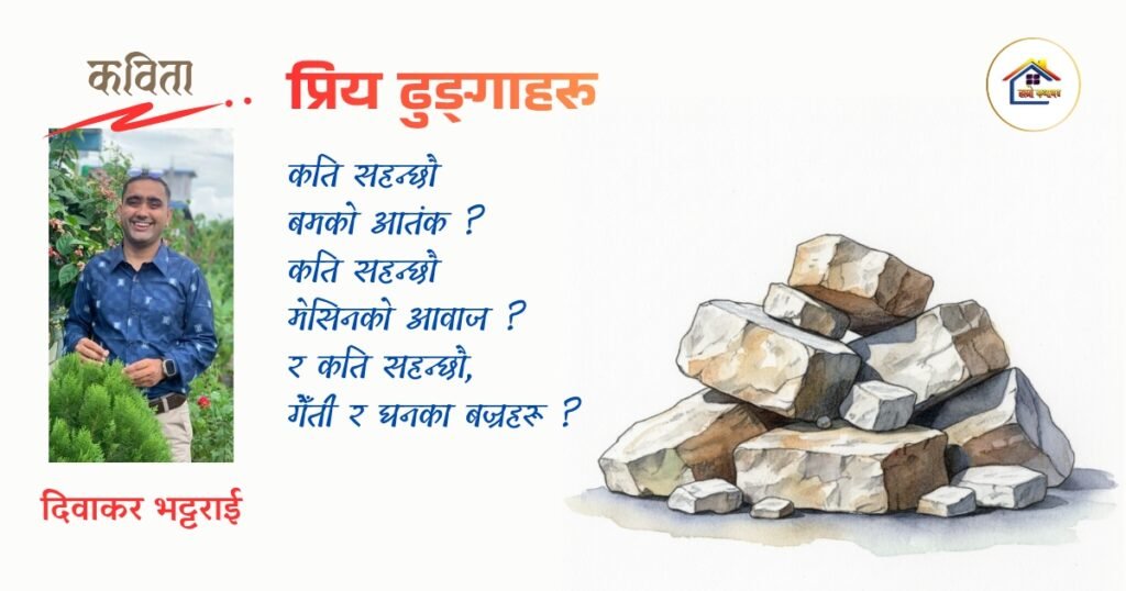 नेपाली भाषा साहित्यलाई माया गरेर यहाँसम्म आइ, यहाँ प्रकाशित लेख/रचनाहरू पढिदिनु भएकोमा तपाईँलाई धेरै धेरै धन्यवाद। तपाईँले भर्खरै माथि पढेको लेख/रचना कस्तो लाग्यो कमेन्ट बक्समा आफ्नो प्रतिक्रिया राख्न सक्नु हुनेछ। आफ्नो मनमा लागेको प्रतिक्रिया राख्न तपाईँ स्वतन्त्र हुनुहुन्छ। यदि तपाईँ पनि नेपाली भाषा साहित्यमा कलम चलाउनु हुन्छ भने आफ्नो छोटो परिचय र एक प्रति अनुहार चिनिने तस्बिर सहित आफ्ना लेख/रचनाहरू हामीलाई hamrokathaghar@gmail.com मा पठाउन सक्नु हुनेछ। अन्य कुनै पनि जानकारीका लागि +९१८७३८०९३५७३ नम्बरमा ह्वाट्सएप गर्न सक्नु हुनेछ। धन्यवाद । नोट: यहाँ प्रकाशित कुनै पनि लेख/रचनाहरू लेखकको वा 'हाम्रो कथा घर' को अनुमति बिना कुनै पनि माध्यमबाट प्रकाशन प्रसारण गर्न पाइने छैन । अन्यथा, यस्तो गरिएको पाएमा प्रचलित कानुन बमोजिम कारबाही गरिने जानकारी गराउँदछौ।