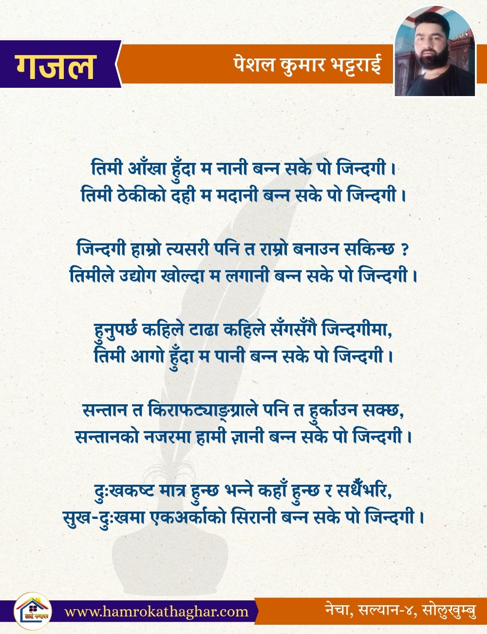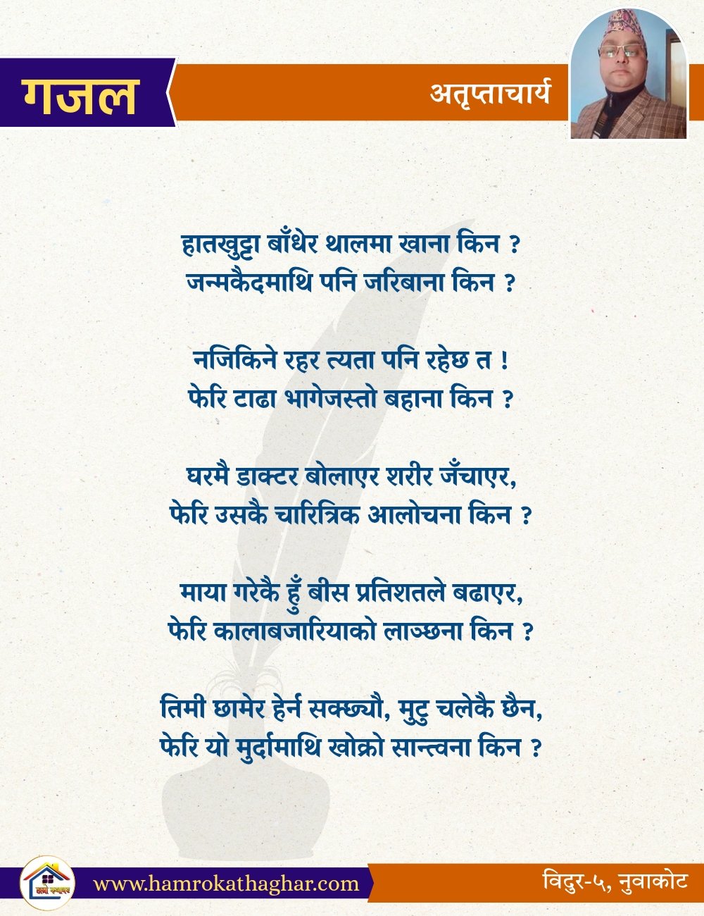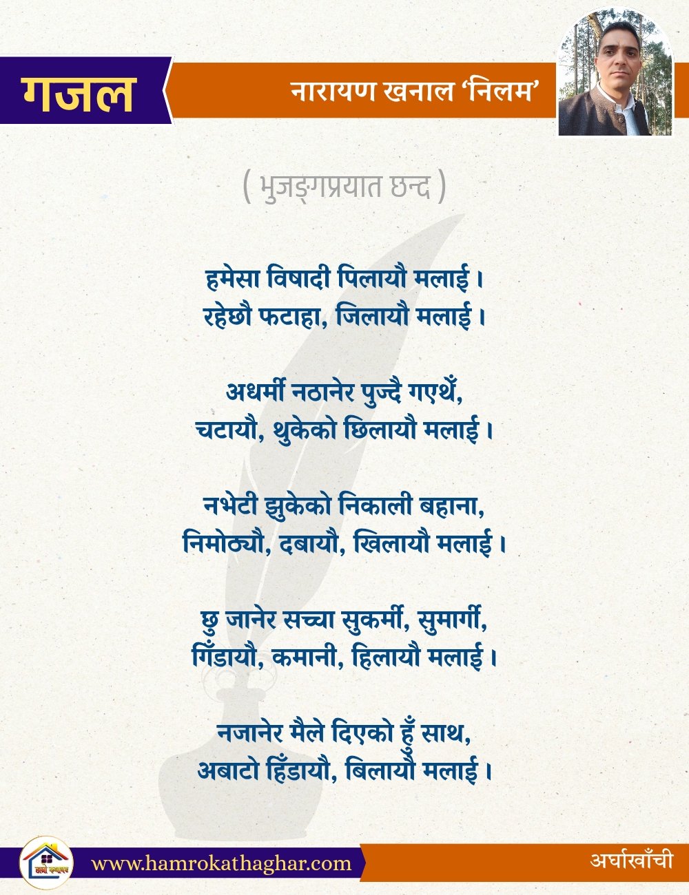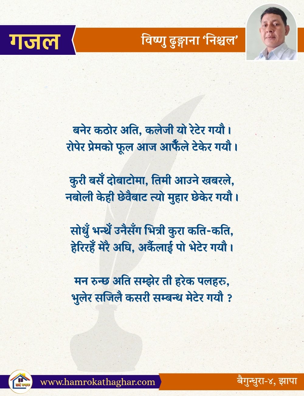 नेपाली भाषा साहित्यलाई माया गरेर यहाँसम्म आइ, यहाँ प्रकाशित लेख/रचनाहरू पढिदिनु भएकोमा तपाईँलाई धेरै धेरै धन्यवाद। तपाईँले भर्खरै माथि पढेको लेख/रचना कस्तो लाग्यो कमेन्ट बक्समा आफ्नो प्रतिक्रिया राख्न सक्नु हुनेछ। आफ्नो मनमा लागेको प्रतिक्रिया राख्न तपाईँ स्वतन्त्र हुनुहुन्छ। यदि तपाईँ पनि नेपाली भाषा साहित्यमा कलम चलाउनु हुन्छ भने आफ्नो छोटो परिचय र एक प्रति अनुहार चिनिने तस्बिर सहित आफ्ना लेख/रचनाहरू हामीलाई hamrokathaghar@gmail.com मा पठाउन सक्नु हुनेछ। अन्य कुनै पनि जानकारीका लागि +९१८७३८०९३५७३ नम्बरमा ह्वाट्सएप गर्न सक्नु हुनेछ। धन्यवाद । नोट: यहाँ प्रकाशित कुनै पनि लेख/रचनाहरू लेखकको वा 'हाम्रो कथा घर' को अनुमति बिना कुनै पनि माध्यमबाट प्रकाशन प्रसारण गर्न पाइने छैन । अन्यथा, यस्तो गरिएको पाएमा प्रचलित कानुन बमोजिम कारबाही गरिने जानकारी गराउँदछौ।