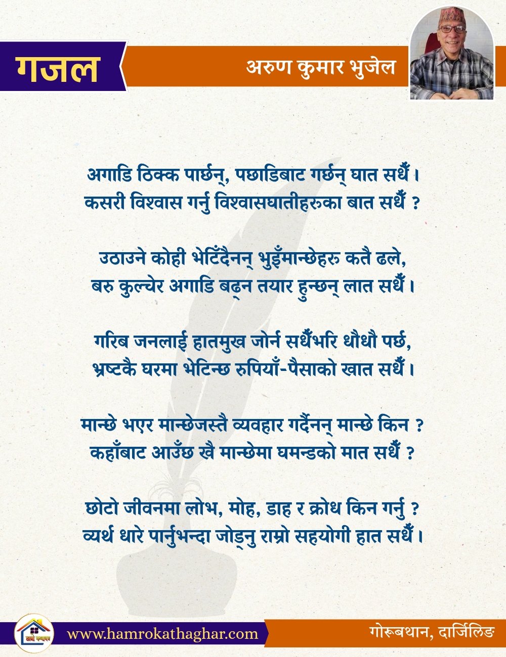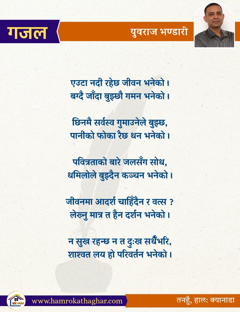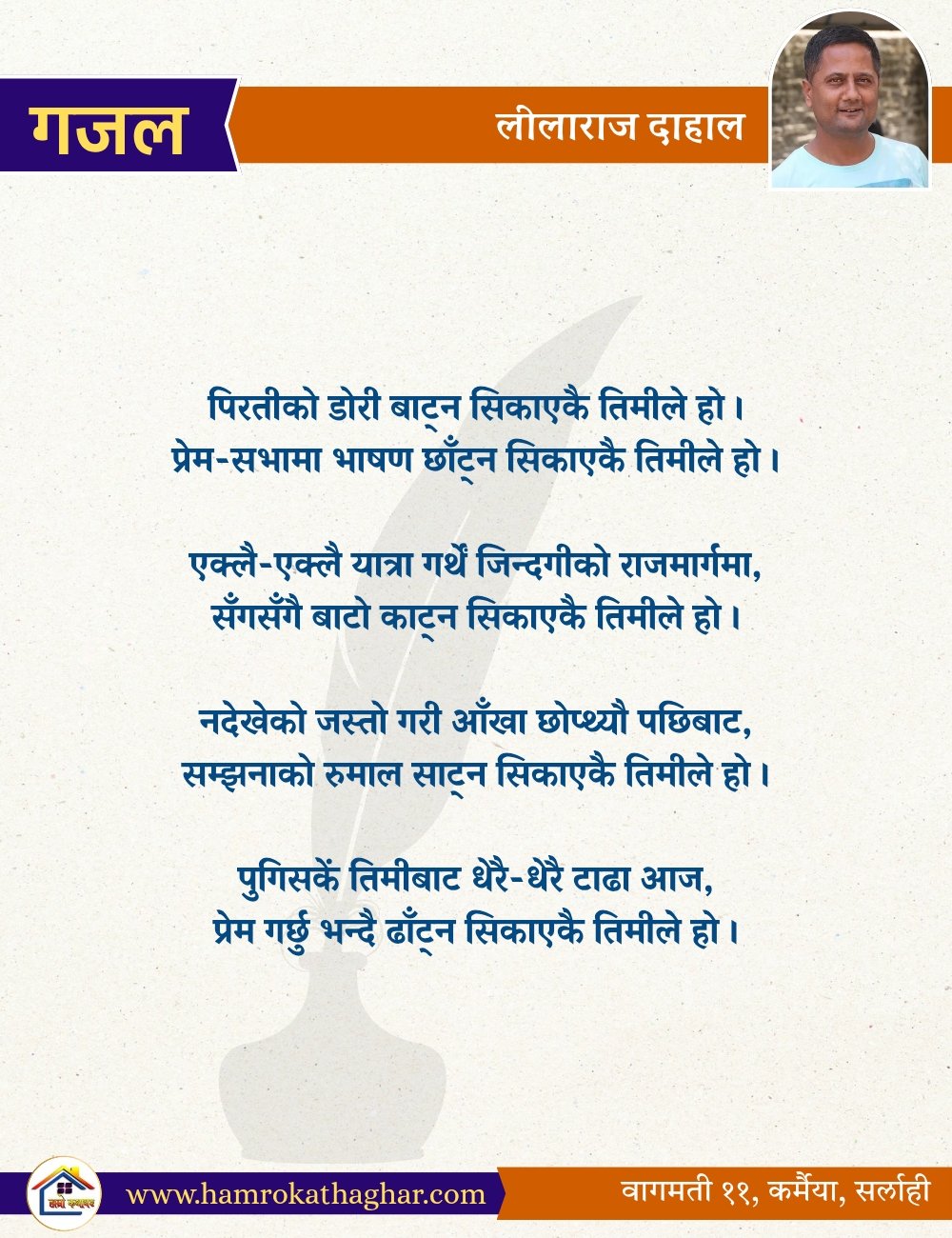 नेपाली भाषा साहित्यलाई माया गरेर यहाँसम्म आइ, यहाँ प्रकाशित लेख/रचनाहरू पढिदिनु भएकोमा तपाईँलाई धेरै धेरै धन्यवाद। तपाईँले भर्खरै माथि पढेको लेख/रचना कस्तो लाग्यो कमेन्ट बक्समा आफ्नो प्रतिक्रिया राख्न सक्नु हुनेछ। आफ्नो मनमा लागेको प्रतिक्रिया राख्न तपाईँ स्वतन्त्र हुनुहुन्छ। यदि तपाईँ पनि नेपाली भाषा साहित्यमा कलम चलाउनु हुन्छ भने आफ्नो छोटो परिचय र एक प्रति अनुहार चिनिने तस्बिर सहित आफ्ना लेख/रचनाहरू हामीलाई hamrokathaghar@gmail.com मा पठाउन सक्नु हुनेछ। अन्य कुनै पनि जानकारीका लागि +९१८७३८०९३५७३ नम्बरमा ह्वाट्सएप गर्न सक्नु हुनेछ। धन्यवाद । नोट: यहाँ प्रकाशित कुनै पनि लेख/रचनाहरू लेखकको वा 'हाम्रो कथा घर' को अनुमति बिना कुनै पनि माध्यमबाट प्रकाशन प्रसारण गर्न पाइने छैन । अन्यथा, यस्तो गरिएको पाएमा प्रचलित कानुन बमोजिम कारबाही गरिने जानकारी गराउँदछौ।