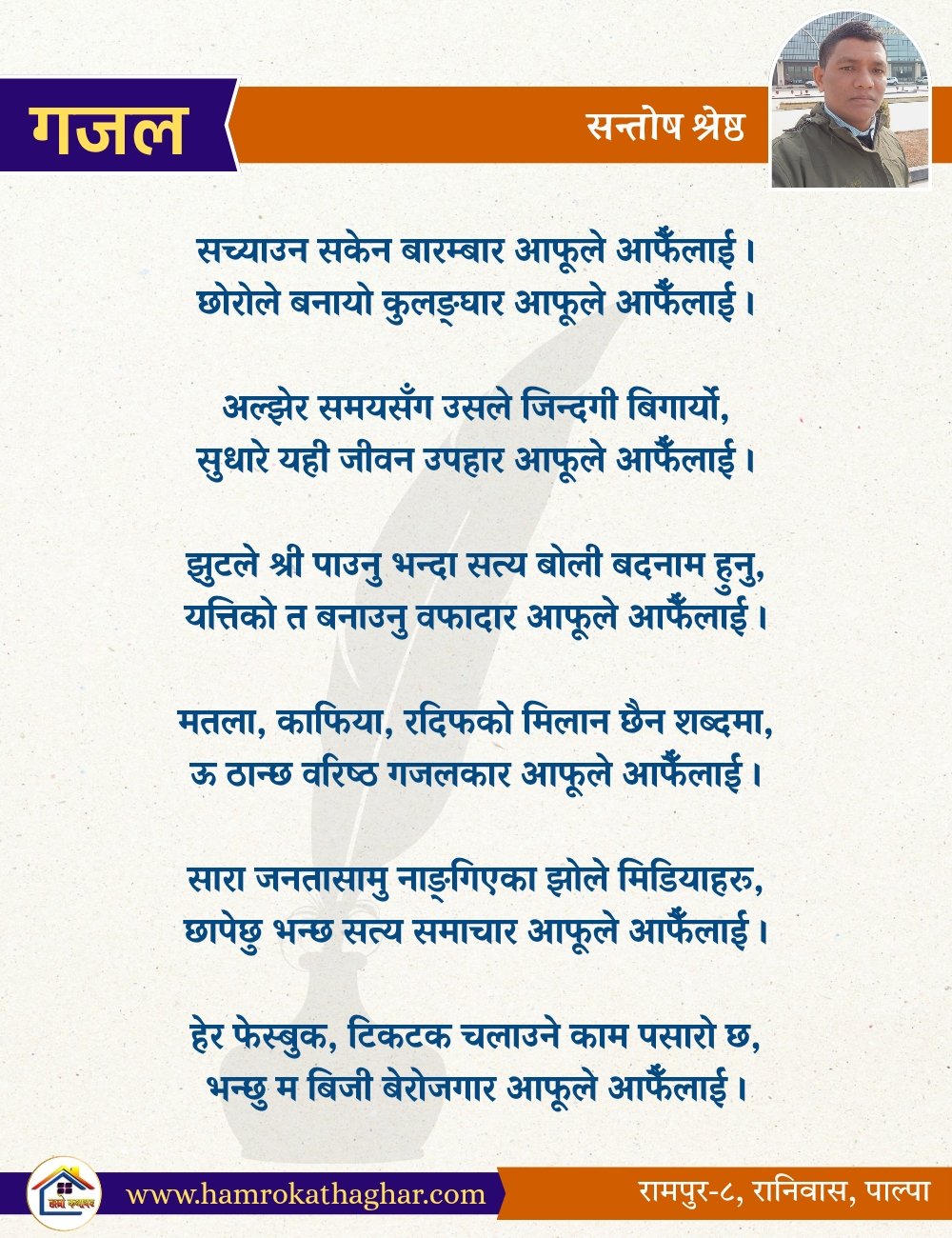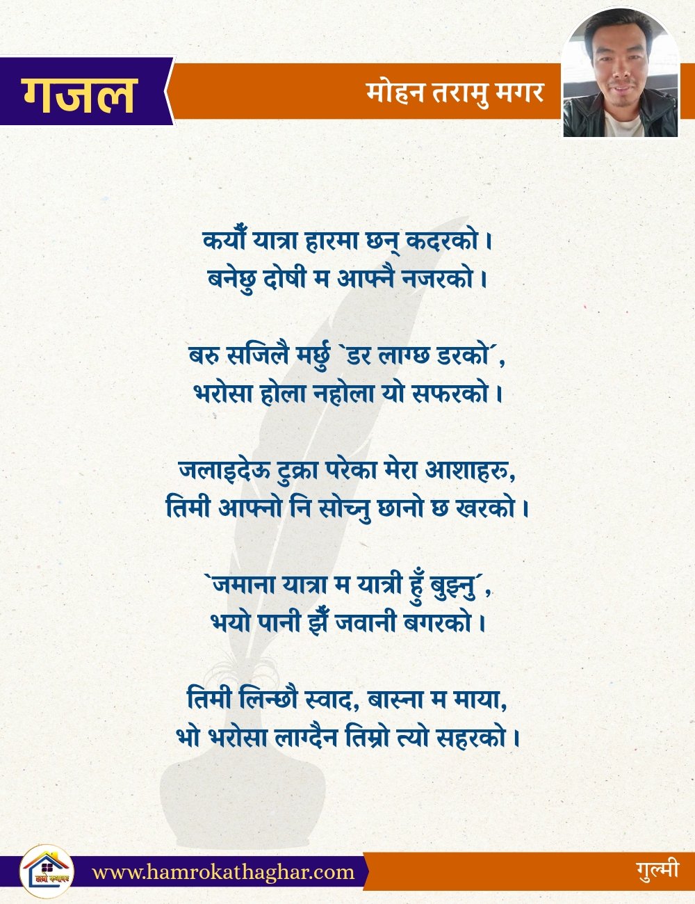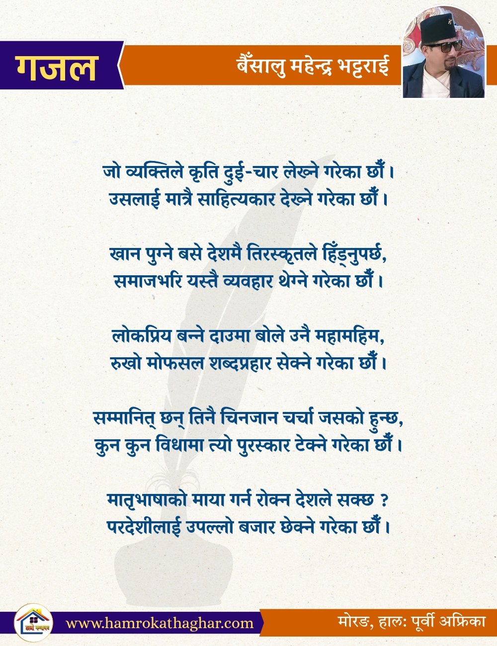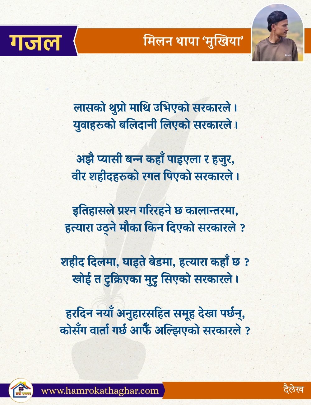 नेपाली भाषा साहित्यलाई माया गरेर यहाँसम्म आइ, यहाँ प्रकाशित लेख/रचनाहरू पढिदिनु भएकोमा तपाईँलाई धेरै धेरै धन्यवाद। तपाईँले भर्खरै माथि पढेको लेख/रचना कस्तो लाग्यो कमेन्ट बक्समा आफ्नो प्रतिक्रिया राख्न सक्नु हुनेछ। आफ्नो मनमा लागेको प्रतिक्रिया राख्न तपाईँ स्वतन्त्र हुनुहुन्छ। यदि तपाईँ पनि नेपाली भाषा साहित्यमा कलम चलाउनु हुन्छ भने आफ्नो छोटो परिचय र एक प्रति अनुहार चिनिने तस्बिर सहित आफ्ना लेख/रचनाहरू हामीलाई hamrokathaghar@gmail.com मा पठाउन सक्नु हुनेछ। अन्य कुनै पनि जानकारीका लागि +९१८७३८०९३५७३ नम्बरमा ह्वाट्सएप गर्न सक्नु हुनेछ। धन्यवाद । नोट: यहाँ प्रकाशित कुनै पनि लेख/रचनाहरू लेखकको वा 'हाम्रो कथा घर' को अनुमति बिना कुनै पनि माध्यमबाट प्रकाशन प्रसारण गर्न पाइने छैन । अन्यथा, यस्तो गरिएको पाएमा प्रचलित कानुन बमोजिम कारबाही गरिने जानकारी गराउँदछौ।