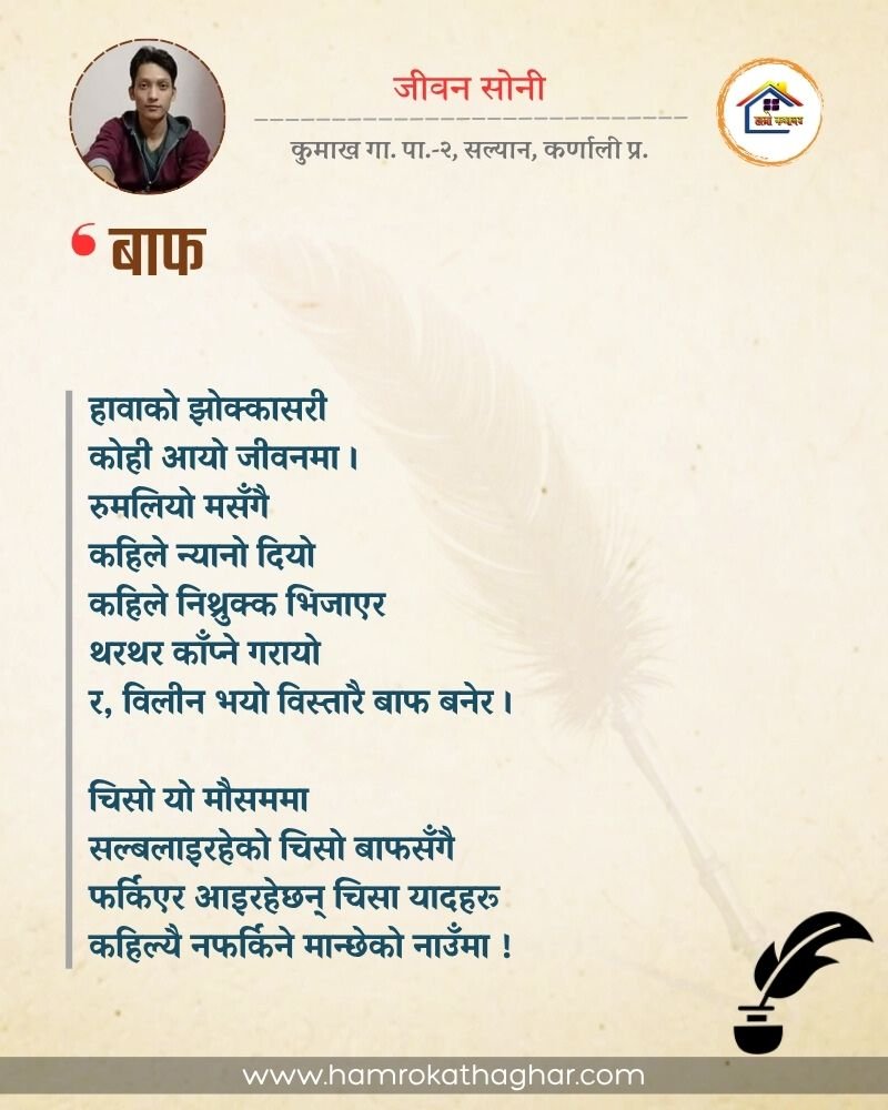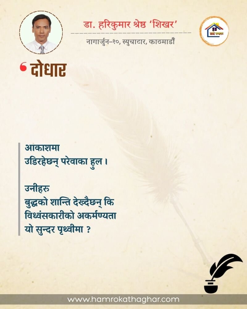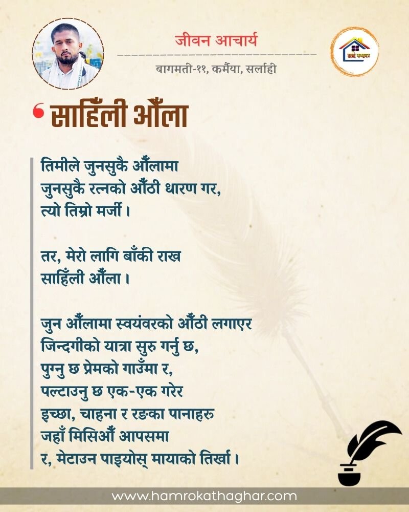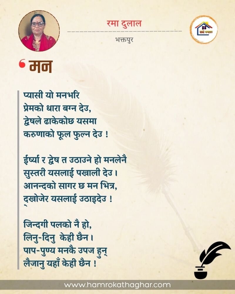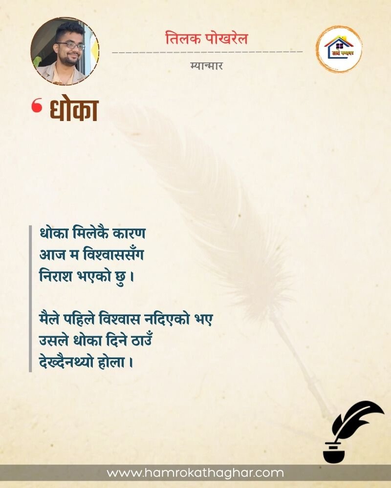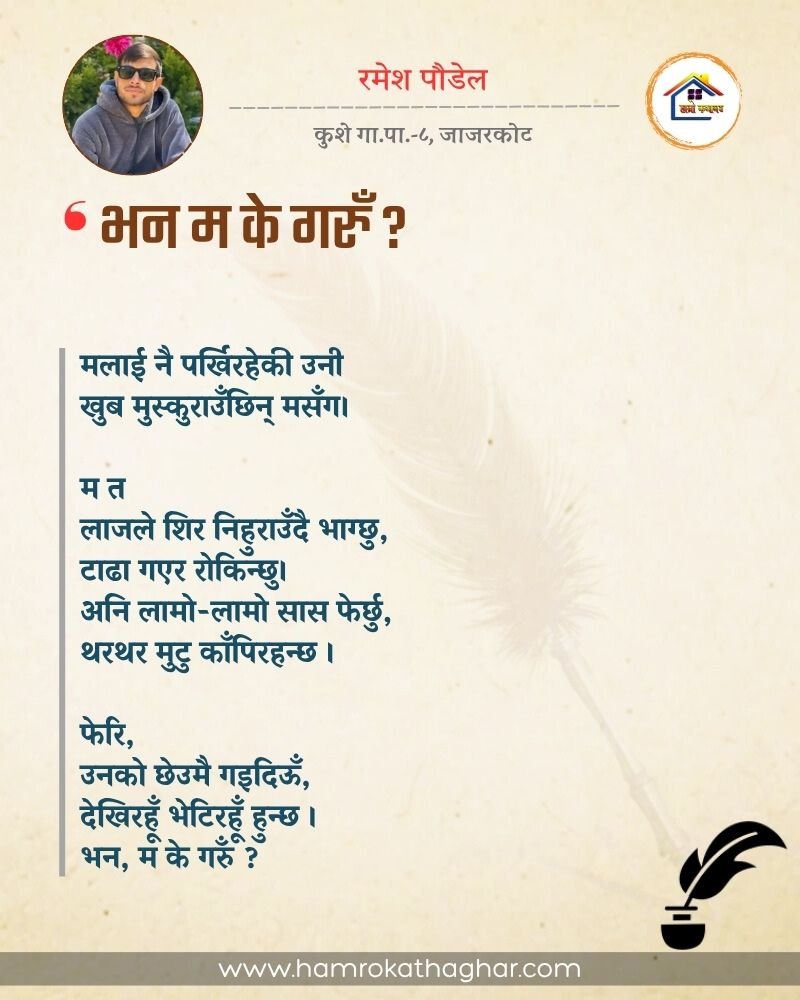 नेपाली भाषा साहित्यलाई माया गरेर यहाँसम्म आइ, यहाँ प्रकाशित लेख/रचनाहरू पढिदिनु भएकोमा तपाईँलाई धेरै धेरै धन्यवाद। तपाईँले भर्खरै माथि पढेको लेख/रचना कस्तो लाग्यो कमेन्ट बक्समा आफ्नो प्रतिक्रिया राख्न सक्नु हुनेछ। आफ्नो मनमा लागेको प्रतिक्रिया राख्न तपाईँ स्वतन्त्र हुनुहुन्छ। यदि तपाईँ पनि नेपाली भाषा साहित्यमा कलम चलाउनु हुन्छ भने आफ्नो छोटो परिचय र एक प्रति अनुहार चिनिने तस्बिर सहित आफ्ना लेख/रचनाहरू हामीलाई hamrokathaghar@gmail.com मा पठाउन सक्नु हुनेछ। अन्य कुनै पनि जानकारीका लागि +९१८७३८०९३५७३ नम्बरमा ह्वाट्सएप गर्न सक्नु हुनेछ। धन्यवाद । नोट: यहाँ प्रकाशित कुनै पनि लेख/रचनाहरू लेखकको वा 'हाम्रो कथा घर' को अनुमति बिना कुनै पनि माध्यमबाट प्रकाशन प्रसारण गर्न पाइने छैन । अन्यथा, यस्तो गरिएको पाएमा प्रचलित कानुन बमोजिम कारबाही गरिने जानकारी गराउँदछौ।