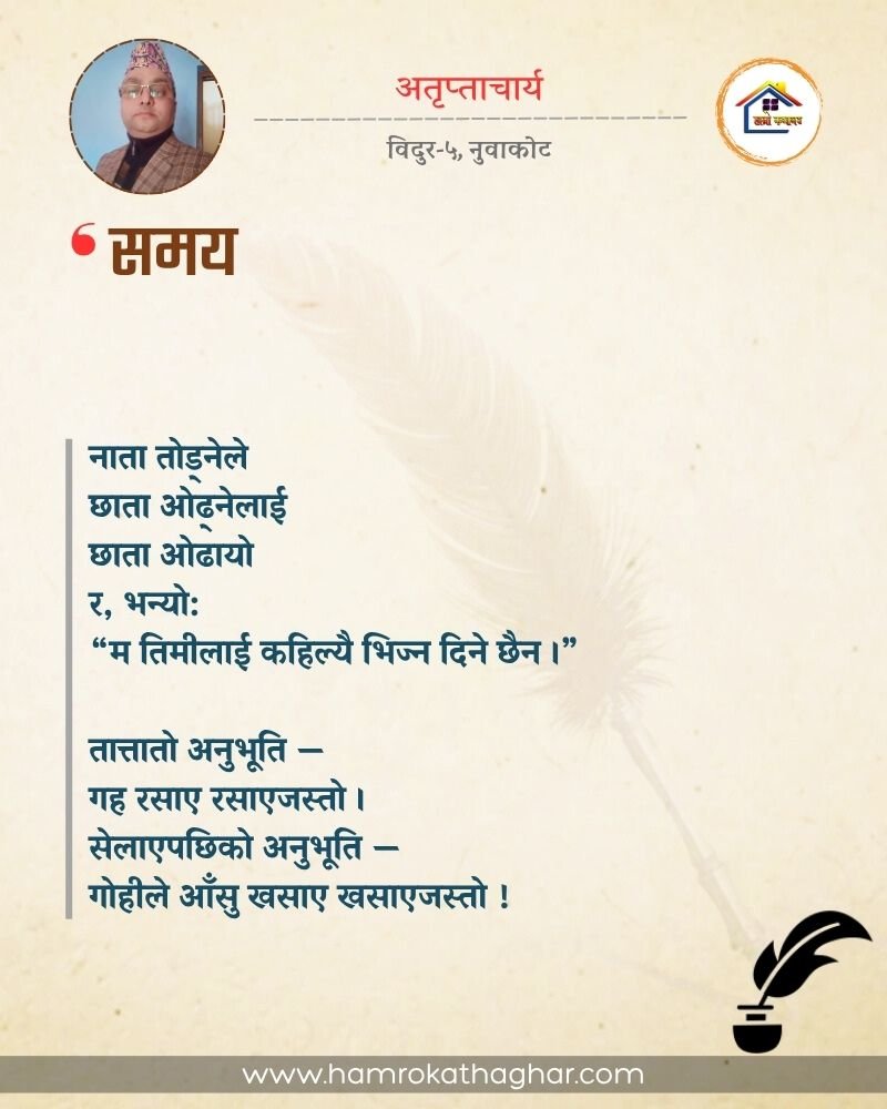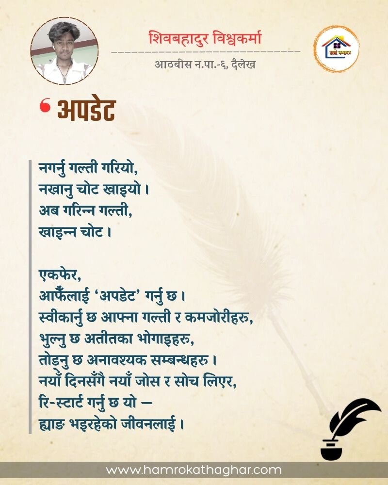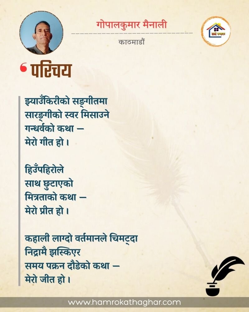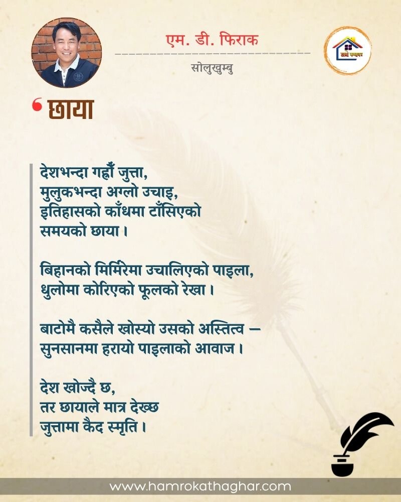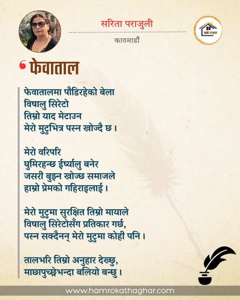नेपाली भाषा साहित्यलाई माया गरेर यहाँसम्म आइ, यहाँ प्रकाशित लेख/रचनाहरू पढिदिनु भएकोमा तपाईँलाई धेरै धेरै धन्यवाद। तपाईँले भर्खरै माथि पढेको लेख/रचना कस्तो लाग्यो कमेन्ट बक्समा आफ्नो प्रतिक्रिया राख्न सक्नु हुनेछ। आफ्नो मनमा लागेको प्रतिक्रिया राख्न तपाईँ स्वतन्त्र हुनुहुन्छ। यदि तपाईँ पनि नेपाली भाषा साहित्यमा कलम चलाउनु हुन्छ भने आफ्नो छोटो परिचय र एक प्रति अनुहार चिनिने तस्बिर सहित आफ्ना लेख/रचनाहरू हामीलाई hamrokathaghar@gmail.com मा पठाउन सक्नु हुनेछ। अन्य कुनै पनि जानकारीका लागि +९१८७३८०९३५७३ नम्बरमा ह्वाट्सएप गर्न सक्नु हुनेछ। धन्यवाद । नोट: यहाँ प्रकाशित कुनै पनि लेख/रचनाहरू लेखकको वा 'हाम्रो कथा घर' को अनुमति बिना कुनै पनि माध्यमबाट प्रकाशन प्रसारण गर्न पाइने छैन । अन्यथा, यस्तो गरिएको पाएमा प्रचलित कानुन बमोजिम कारबाही गरिने जानकारी गराउँदछौ।