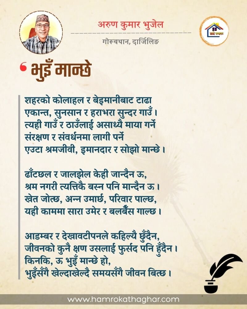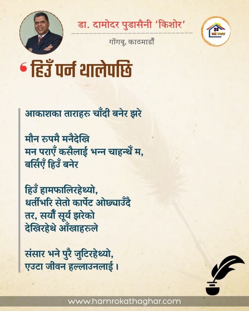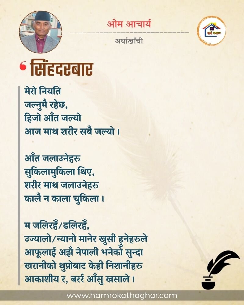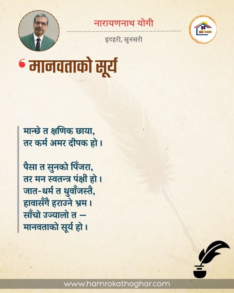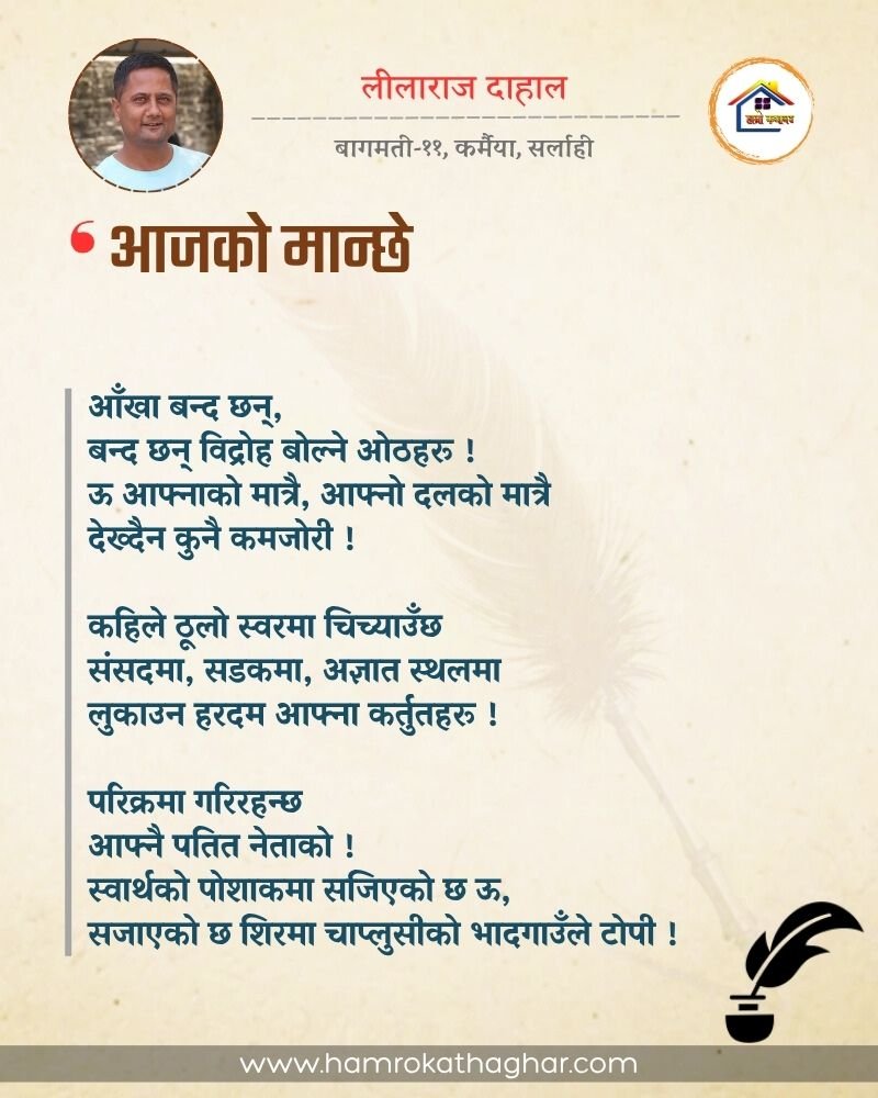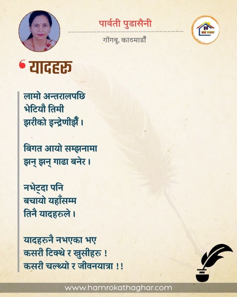 नेपाली भाषा साहित्यलाई माया गरेर यहाँसम्म आइ, यहाँ प्रकाशित लेख/रचनाहरू पढिदिनु भएकोमा तपाईँलाई धेरै धेरै धन्यवाद। तपाईँले भर्खरै माथि पढेको लेख/रचना कस्तो लाग्यो कमेन्ट बक्समा आफ्नो प्रतिक्रिया राख्न सक्नु हुनेछ। आफ्नो मनमा लागेको प्रतिक्रिया राख्न तपाईँ स्वतन्त्र हुनुहुन्छ। यदि तपाईँ पनि नेपाली भाषा साहित्यमा कलम चलाउनु हुन्छ भने आफ्नो छोटो परिचय र एक प्रति अनुहार चिनिने तस्बिर सहित आफ्ना लेख/रचनाहरू हामीलाई hamrokathaghar@gmail.com मा पठाउन सक्नु हुनेछ। अन्य कुनै पनि जानकारीका लागि +९१८७३८०९३५७३ नम्बरमा ह्वाट्सएप गर्न सक्नु हुनेछ। धन्यवाद । नोट: यहाँ प्रकाशित कुनै पनि लेख/रचनाहरू लेखकको वा 'हाम्रो कथा घर' को अनुमति बिना कुनै पनि माध्यमबाट प्रकाशन प्रसारण गर्न पाइने छैन । अन्यथा, यस्तो गरिएको पाएमा प्रचलित कानुन बमोजिम कारबाही गरिने जानकारी गराउँदछौ।