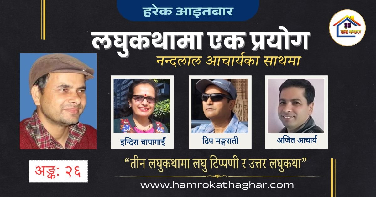 यसै प्रयोगलाई निरन्तरता दिँदै उहाँले हाम्रो कथाघरको “लघुकथामा एक प्रयोग” स्तम्भ सञ्चालन गर्दै आउनुभएको छ। यस स्तम्भमा उहाँले प्रत्येक पटक तीन स्रष्टाका लघुकथा छनोट गरी तिनको विश्लेषणात्मक समीक्षा गर्नुका साथै तिनै कथामा आधारित उत्तरकथाहरू पनि सिर्जना गर्नुहुन्छ। यसरी उहाँले समीक्षा र सिर्जनालाई एकैसाथ अगाडि बढाउँदै नेपाली लघुकथामा एउटा नवीन र महत्वपूर्ण आयाम थप्नुभएको छ।