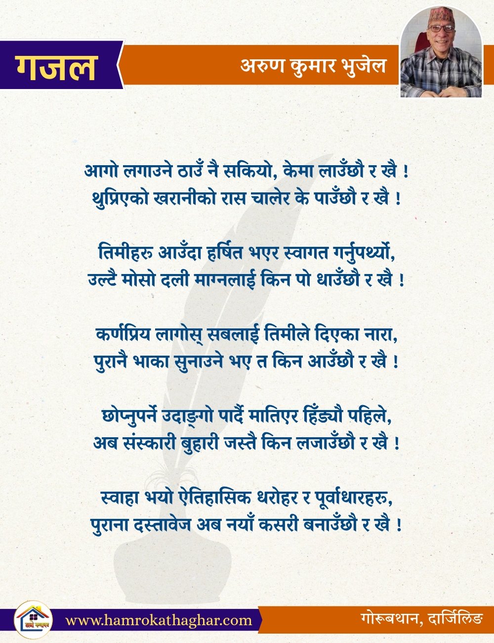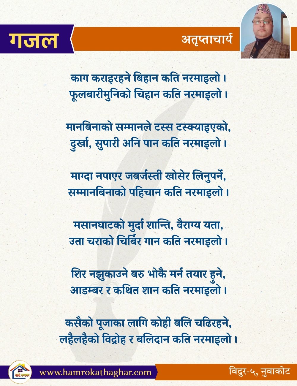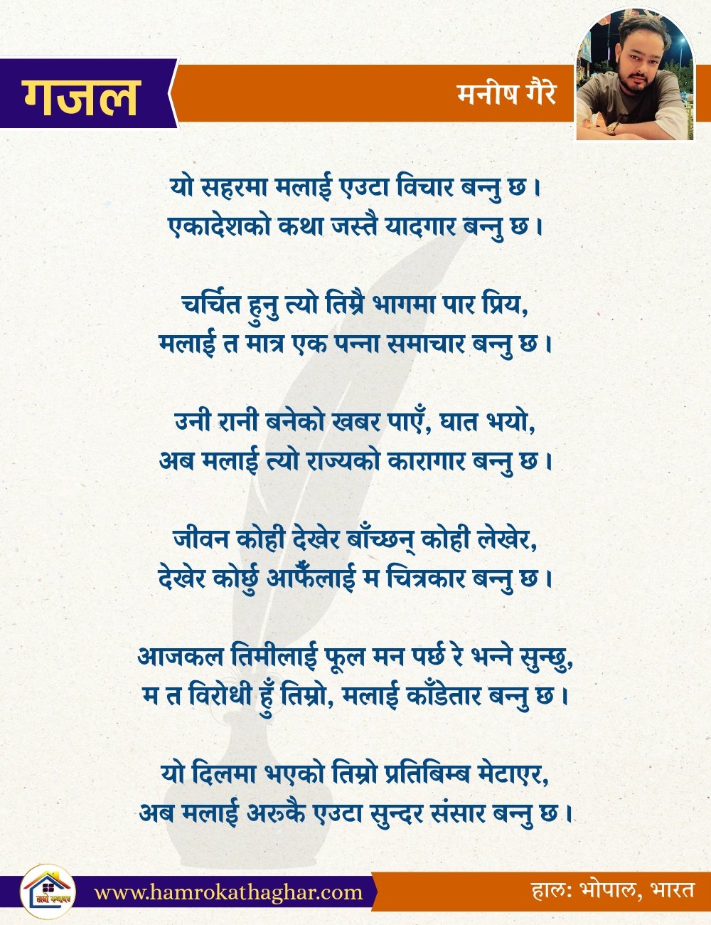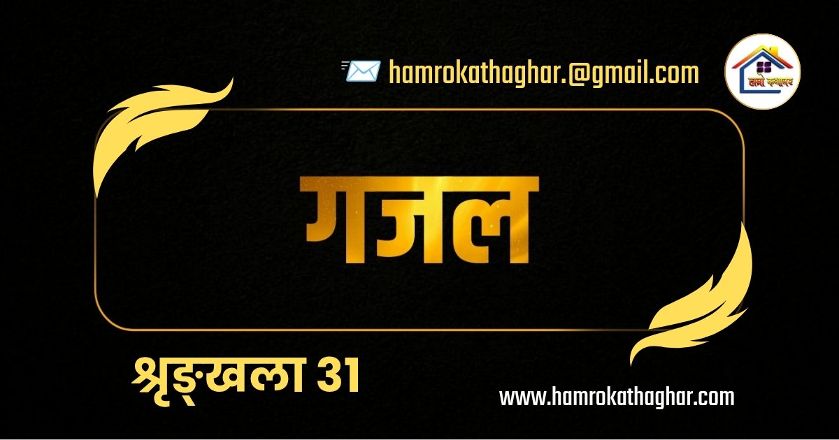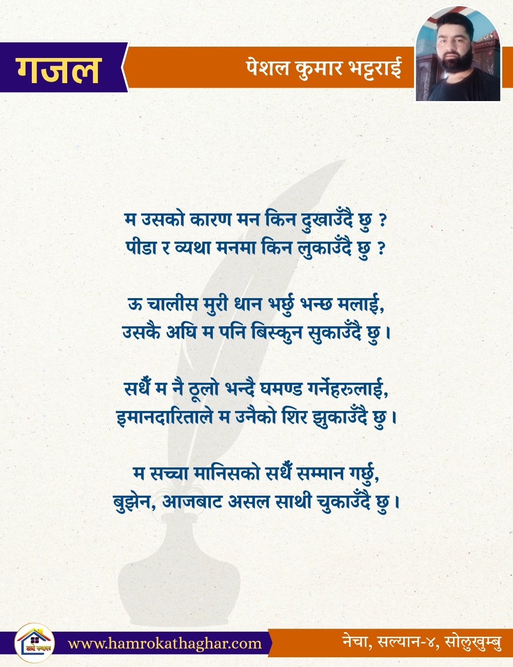 नेपाली भाषा साहित्यलाई माया गरेर यहाँसम्म आइ, यहाँ प्रकाशित लेख/रचनाहरू पढिदिनु भएकोमा तपाईँलाई धेरै धेरै धन्यवाद। तपाईँले भर्खरै माथि पढेको लेख/रचना कस्तो लाग्यो कमेन्ट बक्समा आफ्नो प्रतिक्रिया राख्न सक्नु हुनेछ। आफ्नो मनमा लागेको प्रतिक्रिया राख्न तपाईँ स्वतन्त्र हुनुहुन्छ। यदि तपाईँ पनि नेपाली भाषा साहित्यमा कलम चलाउनु हुन्छ भने आफ्नो छोटो परिचय र एक प्रति अनुहार चिनिने तस्बिर सहित आफ्ना लेख/रचनाहरू हामीलाई hamrokathaghar@gmail.com मा पठाउन सक्नु हुनेछ। अन्य कुनै पनि जानकारीका लागि +९१८७३८०९३५७३ नम्बरमा ह्वाट्सएप गर्न सक्नु हुनेछ। धन्यवाद । नोट: यहाँ प्रकाशित कुनै पनि लेख/रचनाहरू लेखकको वा 'हाम्रो कथा घर' को अनुमति बिना कुनै पनि माध्यमबाट प्रकाशन प्रसारण गर्न पाइने छैन । अन्यथा, यस्तो गरिएको पाएमा प्रचलित कानुन बमोजिम कारबाही गरिने जानकारी गराउँदछौ।