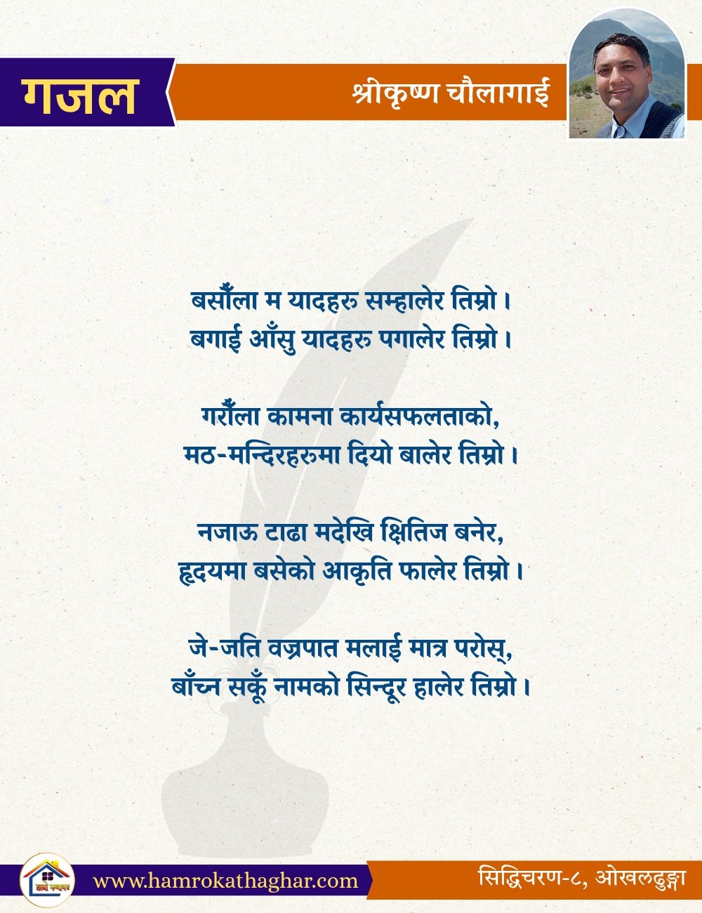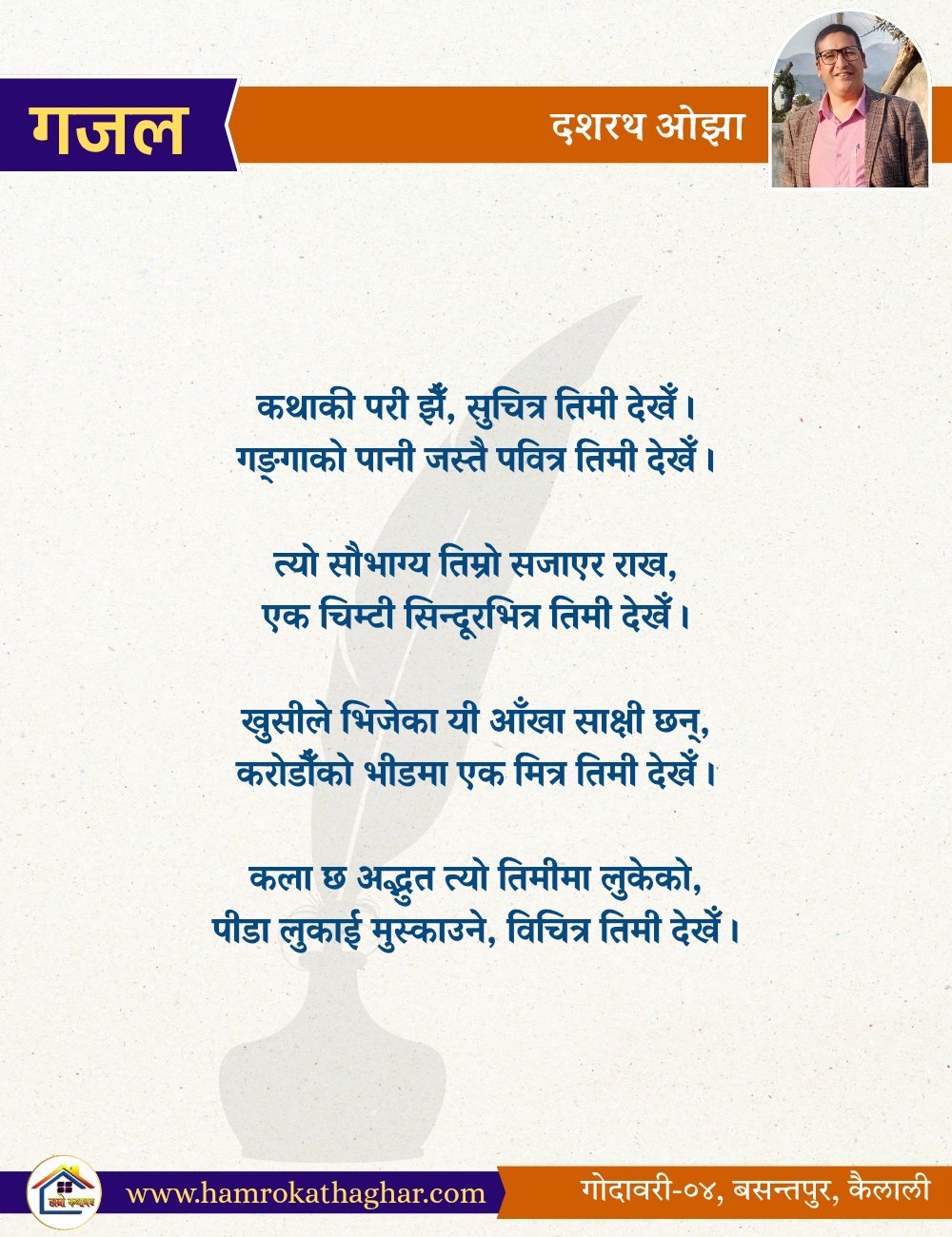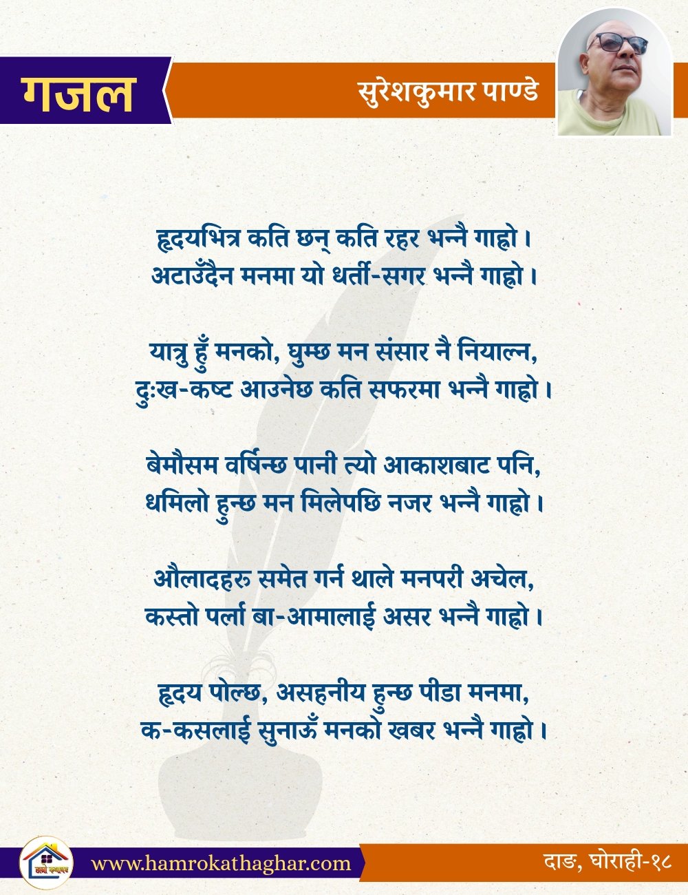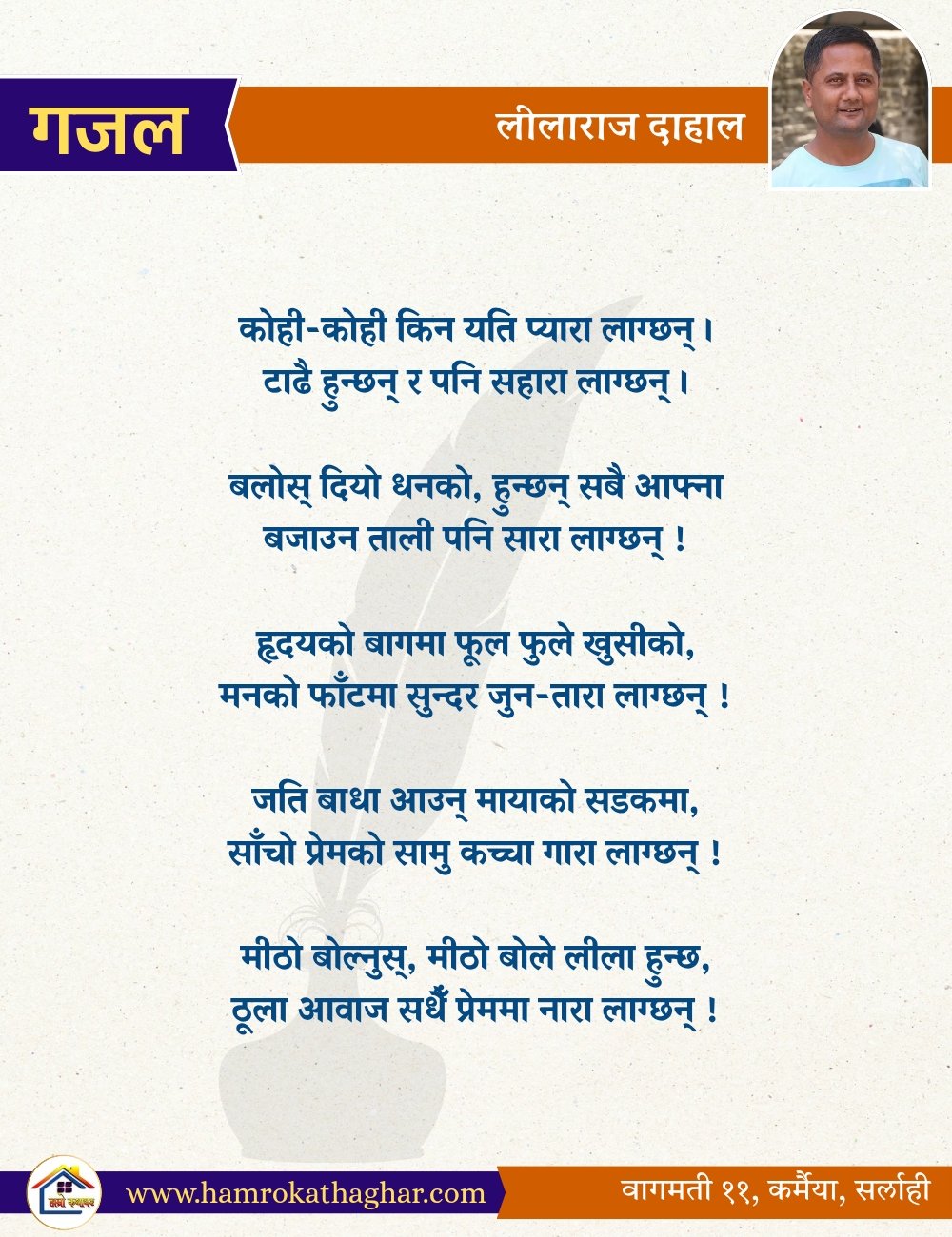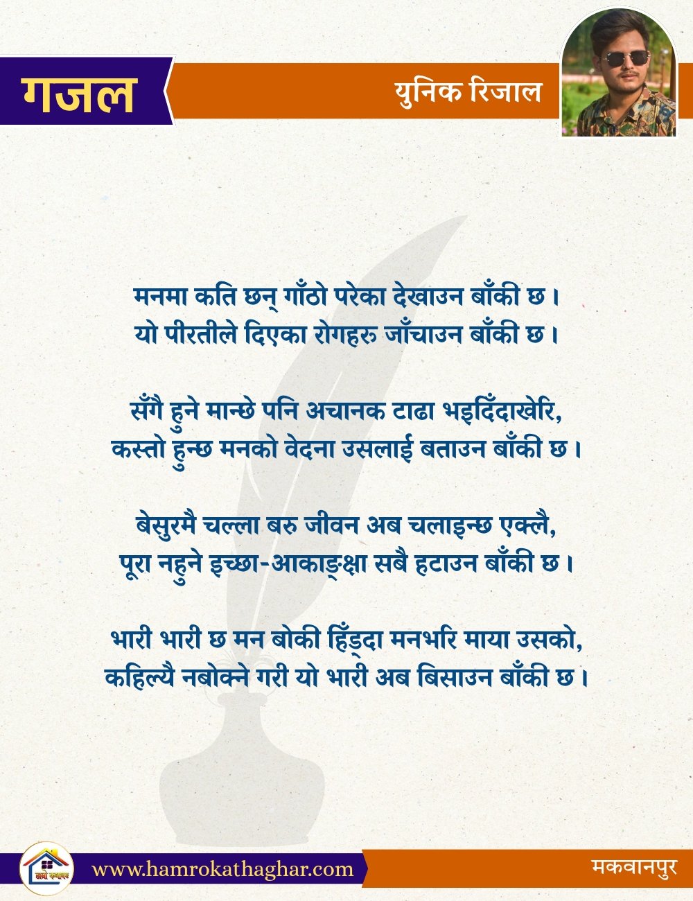 नेपाली भाषा साहित्यलाई माया गरेर यहाँसम्म आइ, यहाँ प्रकाशित लेख/रचनाहरू पढिदिनु भएकोमा तपाईँलाई धेरै धेरै धन्यवाद। तपाईँले भर्खरै माथि पढेको लेख/रचना कस्तो लाग्यो कमेन्ट बक्समा आफ्नो प्रतिक्रिया राख्न सक्नु हुनेछ। आफ्नो मनमा लागेको प्रतिक्रिया राख्न तपाईँ स्वतन्त्र हुनुहुन्छ। यदि तपाईँ पनि नेपाली भाषा साहित्यमा कलम चलाउनु हुन्छ भने आफ्नो छोटो परिचय र एक प्रति अनुहार चिनिने तस्बिर सहित आफ्ना लेख/रचनाहरू हामीलाई hamrokathaghar@gmail.com मा पठाउन सक्नु हुनेछ। अन्य कुनै पनि जानकारीका लागि +९१८७३८०९३५७३ नम्बरमा ह्वाट्सएप गर्न सक्नु हुनेछ। धन्यवाद । नोट: यहाँ प्रकाशित कुनै पनि लेख/रचनाहरू लेखकको वा 'हाम्रो कथा घर' को अनुमति बिना कुनै पनि माध्यमबाट प्रकाशन प्रसारण गर्न पाइने छैन । अन्यथा, यस्तो गरिएको पाएमा प्रचलित कानुन बमोजिम कारबाही गरिने जानकारी गराउँदछौ।
