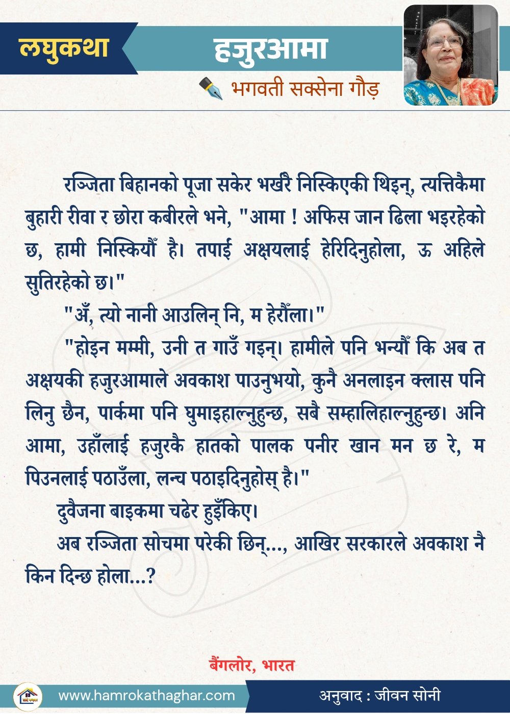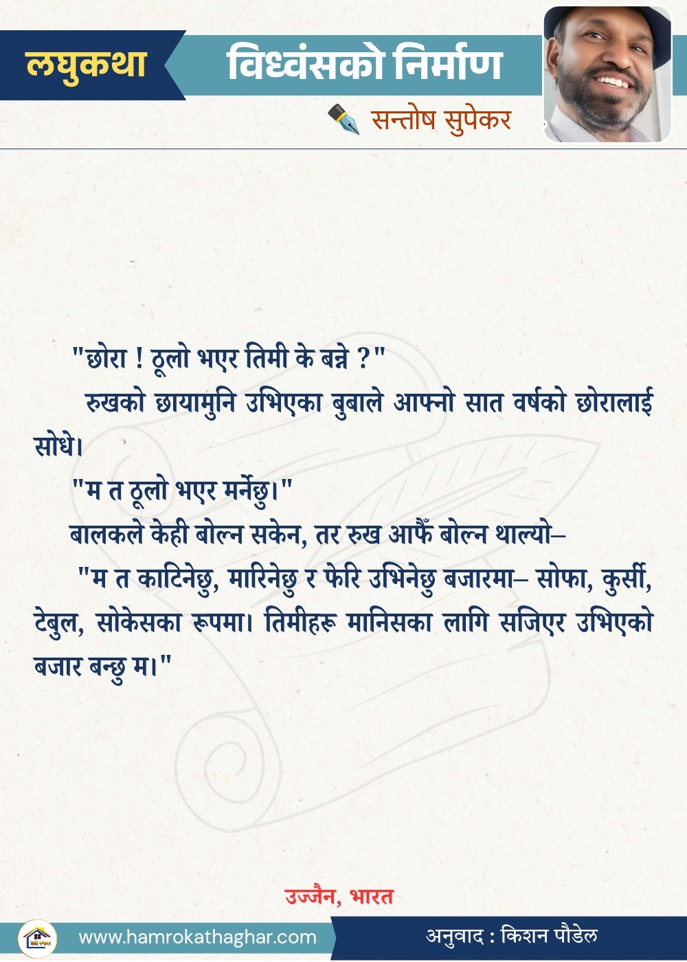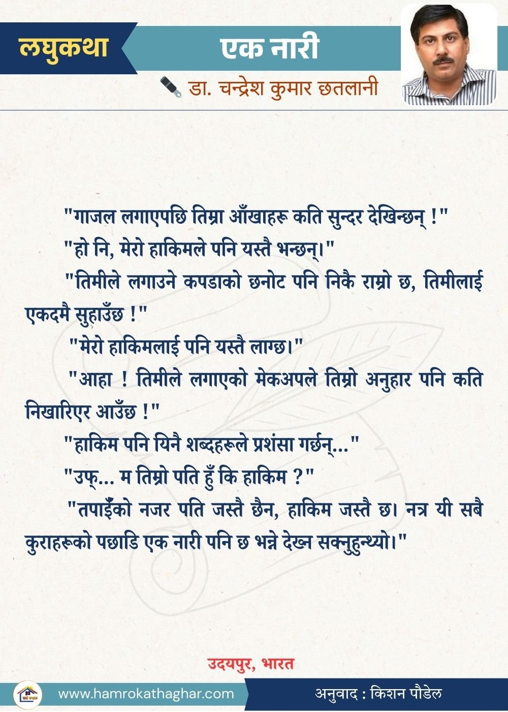 नेपाली भाषा साहित्यलाई माया गरेर यहाँसम्म आइ, यहाँ प्रकाशित लेख/रचनाहरू पढिदिनु भएकोमा तपाईँलाई धेरै धेरै धन्यवाद। तपाईँले भर्खरै माथि पढेको लेख/रचना कस्तो लाग्यो कमेन्ट बक्समा आफ्नो प्रतिक्रिया राख्न सक्नु हुनेछ। आफ्नो मनमा लागेको प्रतिक्रिया राख्न तपाईँ स्वतन्त्र हुनुहुन्छ। यदि तपाईँ पनि नेपाली भाषा साहित्यमा कलम चलाउनु हुन्छ भने आफ्नो छोटो परिचय र एक प्रति अनुहार चिनिने तस्बिर सहित आफ्ना लेख/रचनाहरू हामीलाई hamrokathaghar@gmail.com मा पठाउन सक्नु हुनेछ। अन्य कुनै पनि जानकारीका लागि +९१८७३८०९३५७३ नम्बरमा ह्वाट्सएप गर्न सक्नु हुनेछ। धन्यवाद । नोट: यहाँ प्रकाशित कुनै पनि लेख/रचनाहरू लेखकको वा 'हाम्रो कथा घर' को अनुमति बिना कुनै पनि माध्यमबाट प्रकाशन प्रसारण गर्न पाइने छैन । अन्यथा, यस्तो गरिएको पाएमा प्रचलित कानुन बमोजिम कारबाही गरिने जानकारी गराउँदछौ।