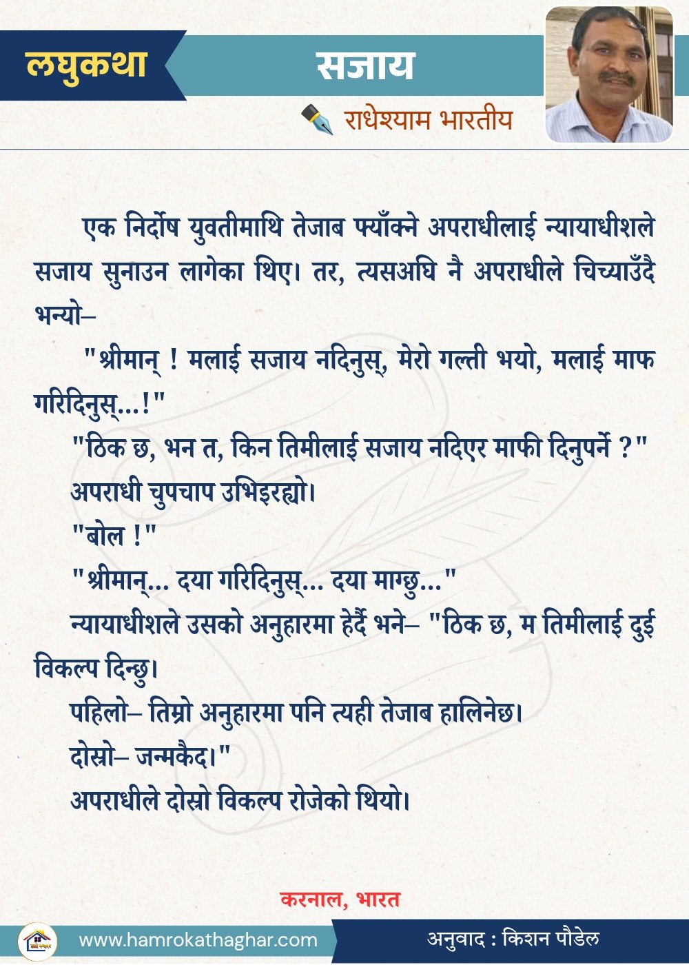 हाम्रो कथाघरको यस ‘स्मार्ट लघुकथा’ स्तम्भका संयोजक तथा सम्पादक हेटौँडाका कवि एवम् लघुकथाकार  किशन पौडेल हुनुहुन्छ। यस स्तम्भमा  नेपाली लघुकथाका साथै देश-विदेशका लेखकहरूका छोटा, गहन र मानवीय संवेदनाले ओतप्रोत सामाजिक विषयका लघुकथाहरू प्रकाशन गरिनेछ।