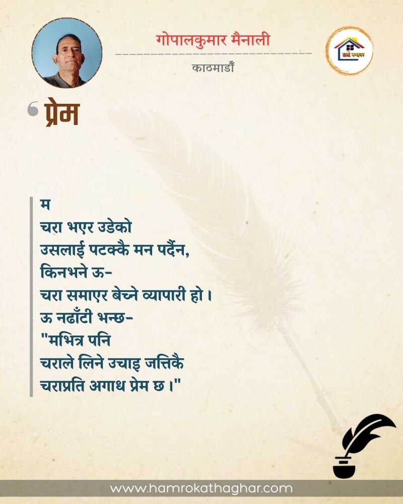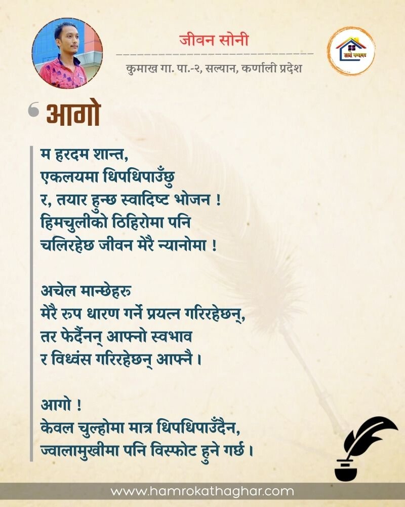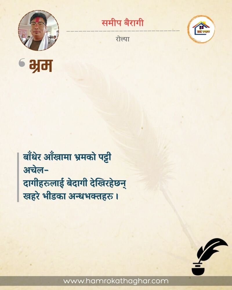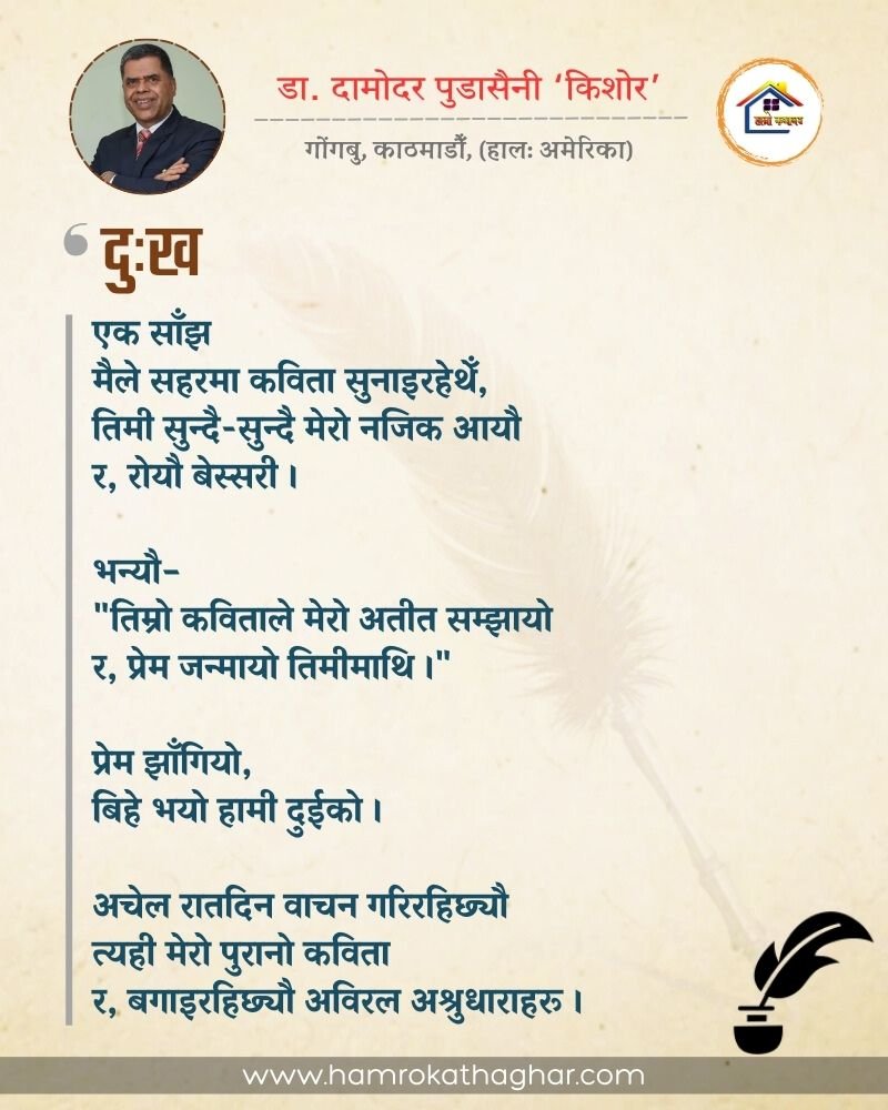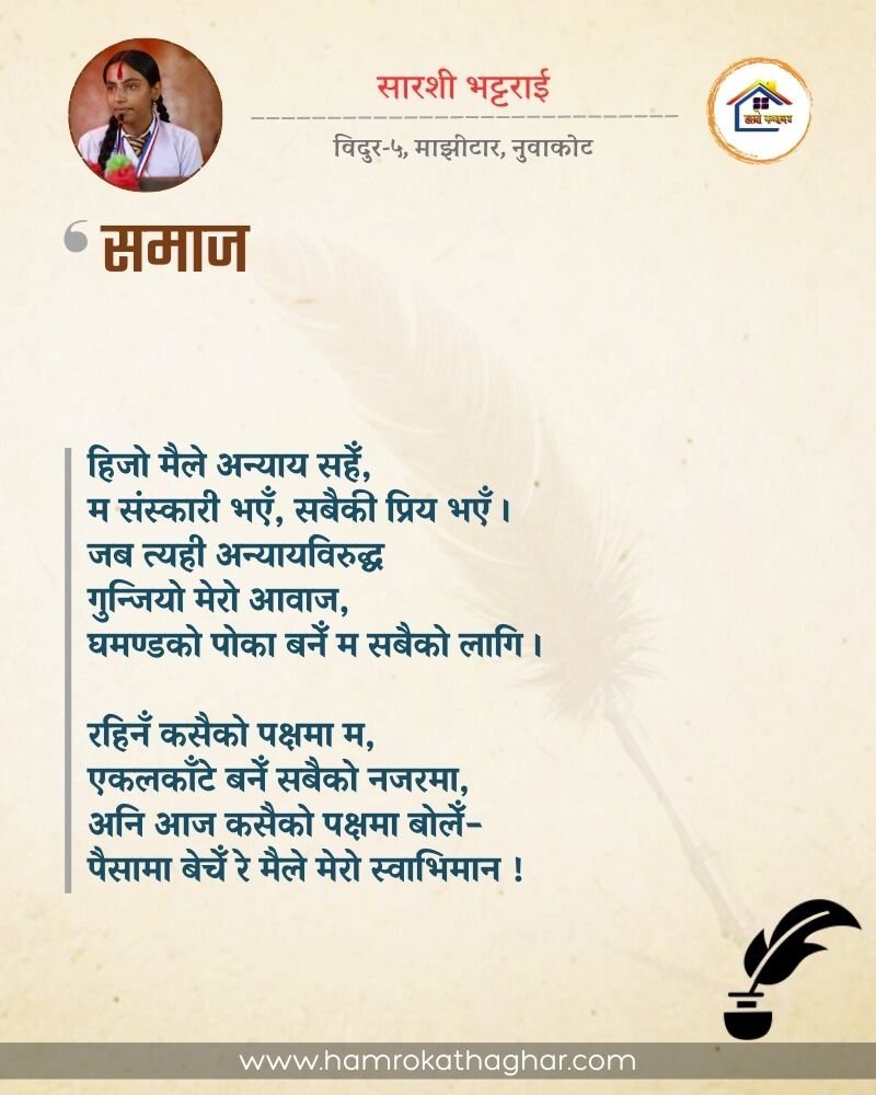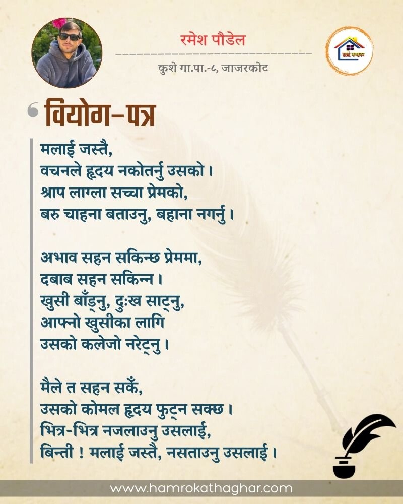नेपाली भाषा साहित्यलाई माया गरेर यहाँसम्म आइ, यहाँ प्रकाशित लेख/रचनाहरू पढिदिनु भएकोमा तपाईँलाई धेरै धेरै धन्यवाद। तपाईँले भर्खरै माथि पढेको लेख/रचना कस्तो लाग्यो कमेन्ट बक्समा आफ्नो प्रतिक्रिया राख्न सक्नु हुनेछ। आफ्नो मनमा लागेको प्रतिक्रिया राख्न तपाईँ स्वतन्त्र हुनुहुन्छ। यदि तपाईँ पनि नेपाली भाषा साहित्यमा कलम चलाउनु हुन्छ भने आफ्नो छोटो परिचय र एक प्रति अनुहार चिनिने तस्बिर सहित आफ्ना लेख/रचनाहरू हामीलाई hamrokathaghar@gmail.com मा पठाउन सक्नु हुनेछ। अन्य कुनै पनि जानकारीका लागि +९१८७३८०९३५७३ नम्बरमा ह्वाट्सएप गर्न सक्नु हुनेछ। धन्यवाद । नोट: यहाँ प्रकाशित कुनै पनि लेख/रचनाहरू लेखकको वा 'हाम्रो कथा घर' को अनुमति बिना कुनै पनि माध्यमबाट प्रकाशन प्रसारण गर्न पाइने छैन । अन्यथा, यस्तो गरिएको पाएमा प्रचलित कानुन बमोजिम कारबाही गरिने जानकारी गराउँदछौ।