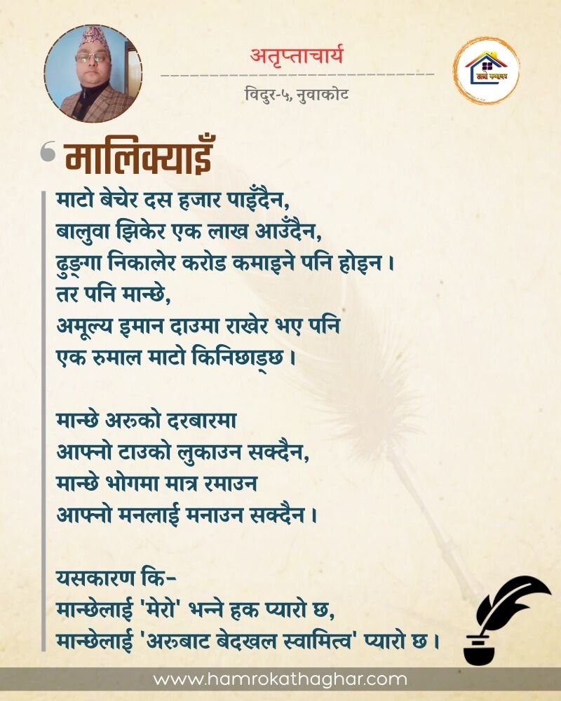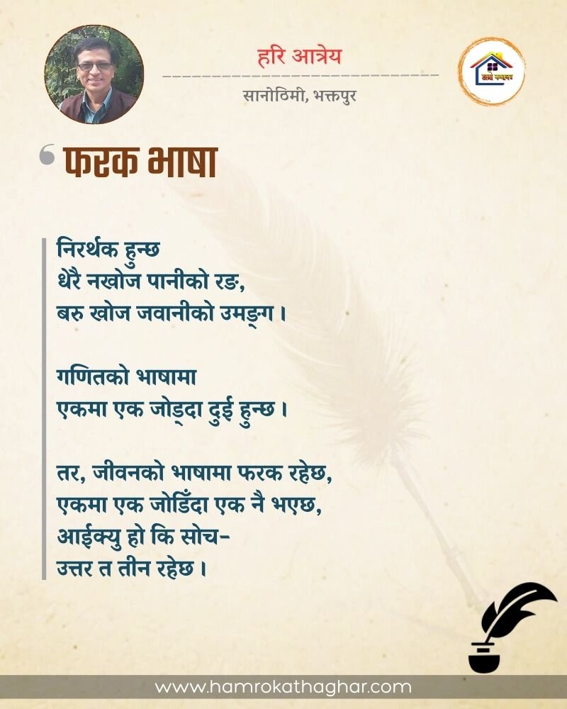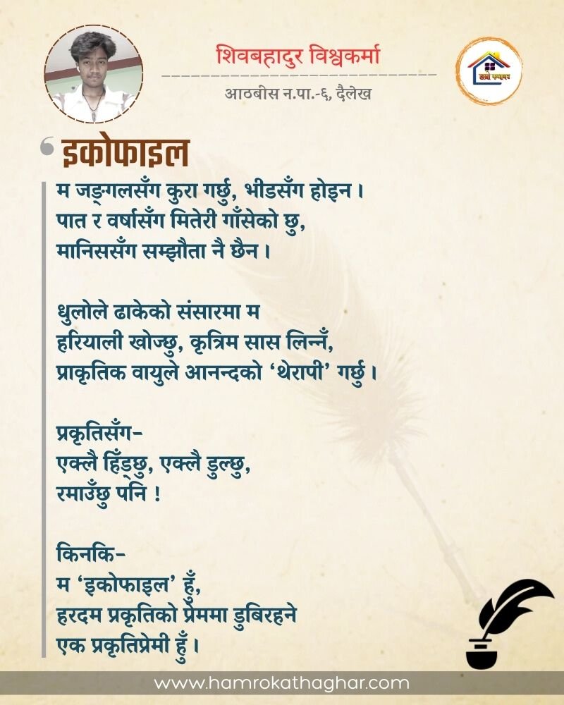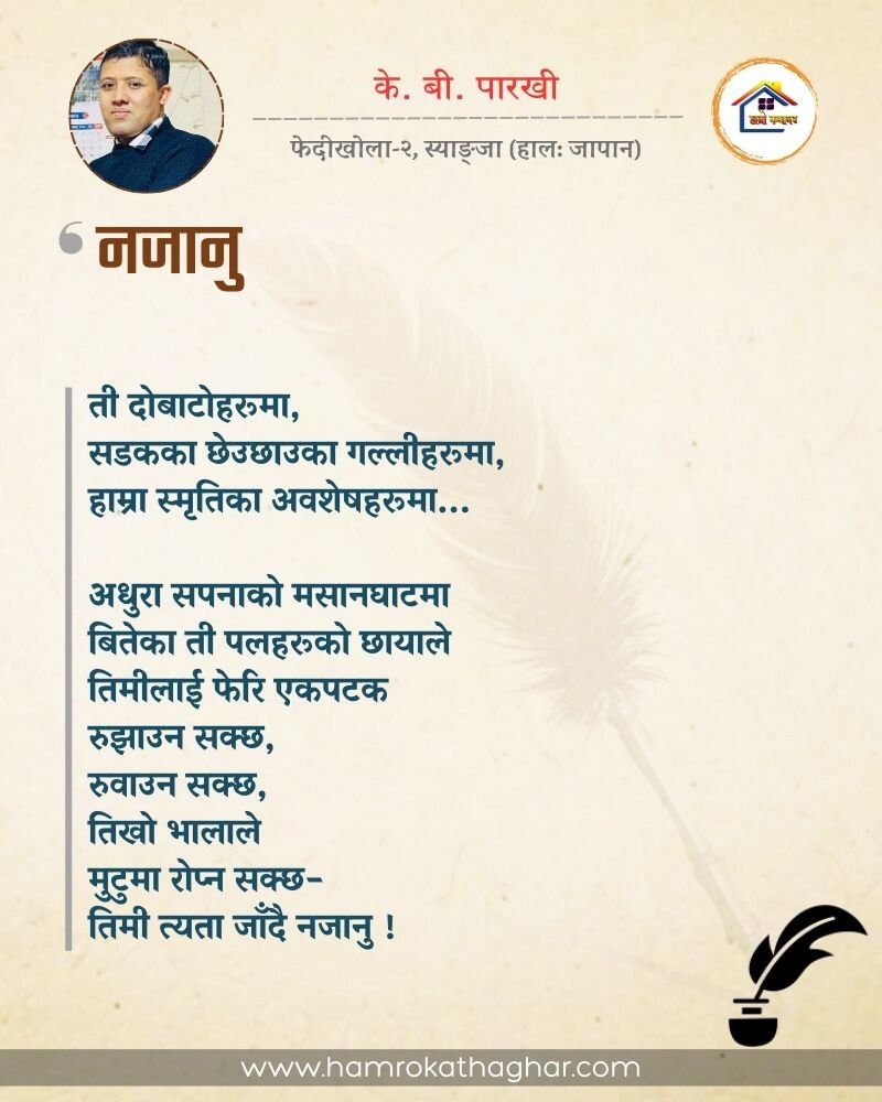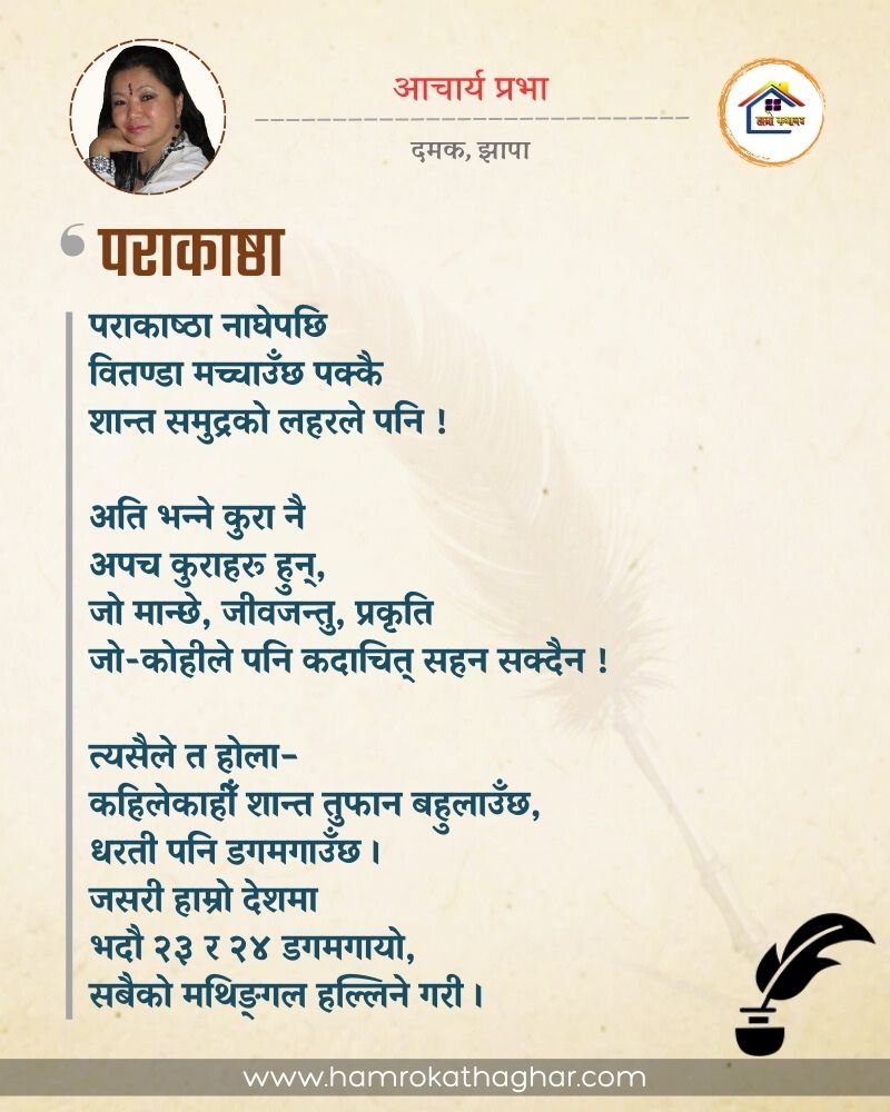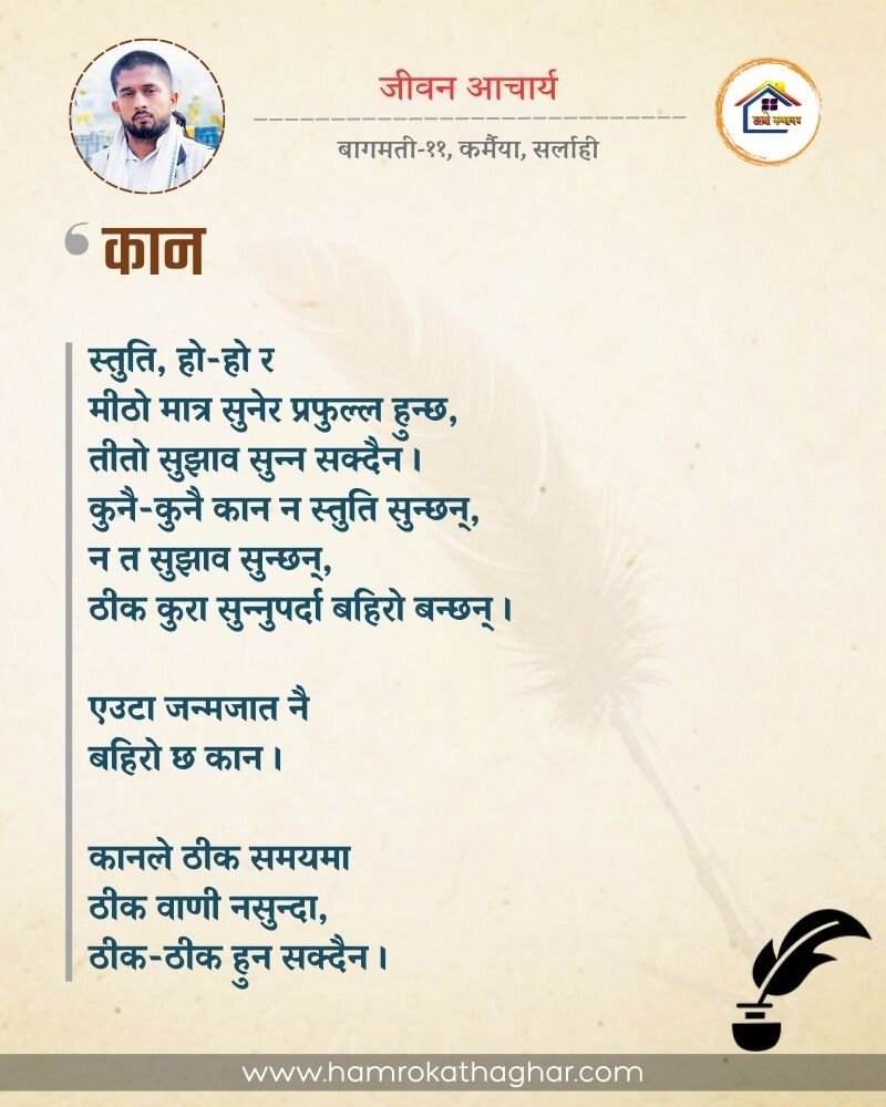 नेपाली भाषा साहित्यलाई माया गरेर यहाँसम्म आइ, यहाँ प्रकाशित लेख/रचनाहरू पढिदिनु भएकोमा तपाईँलाई धेरै धेरै धन्यवाद। तपाईँले भर्खरै माथि पढेको लेख/रचना कस्तो लाग्यो कमेन्ट बक्समा आफ्नो प्रतिक्रिया राख्न सक्नु हुनेछ। आफ्नो मनमा लागेको प्रतिक्रिया राख्न तपाईँ स्वतन्त्र हुनुहुन्छ। यदि तपाईँ पनि नेपाली भाषा साहित्यमा कलम चलाउनु हुन्छ भने आफ्नो छोटो परिचय र एक प्रति अनुहार चिनिने तस्बिर सहित आफ्ना लेख/रचनाहरू हामीलाई hamrokathaghar@gmail.com मा पठाउन सक्नु हुनेछ। अन्य कुनै पनि जानकारीका लागि +९१८७३८०९३५७३ नम्बरमा ह्वाट्सएप गर्न सक्नु हुनेछ। धन्यवाद । नोट: यहाँ प्रकाशित कुनै पनि लेख/रचनाहरू लेखकको वा 'हाम्रो कथा घर' को अनुमति बिना कुनै पनि माध्यमबाट प्रकाशन प्रसारण गर्न पाइने छैन । अन्यथा, यस्तो गरिएको पाएमा प्रचलित कानुन बमोजिम कारबाही गरिने जानकारी गराउँदछौ।