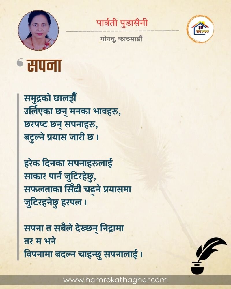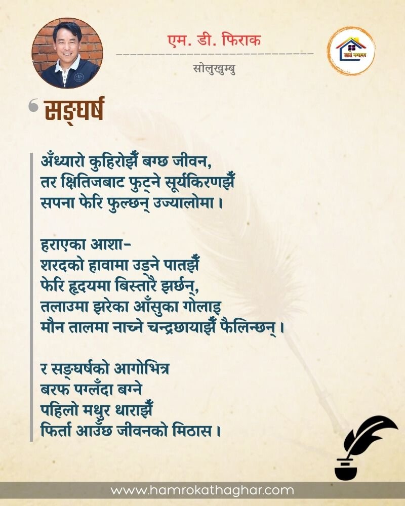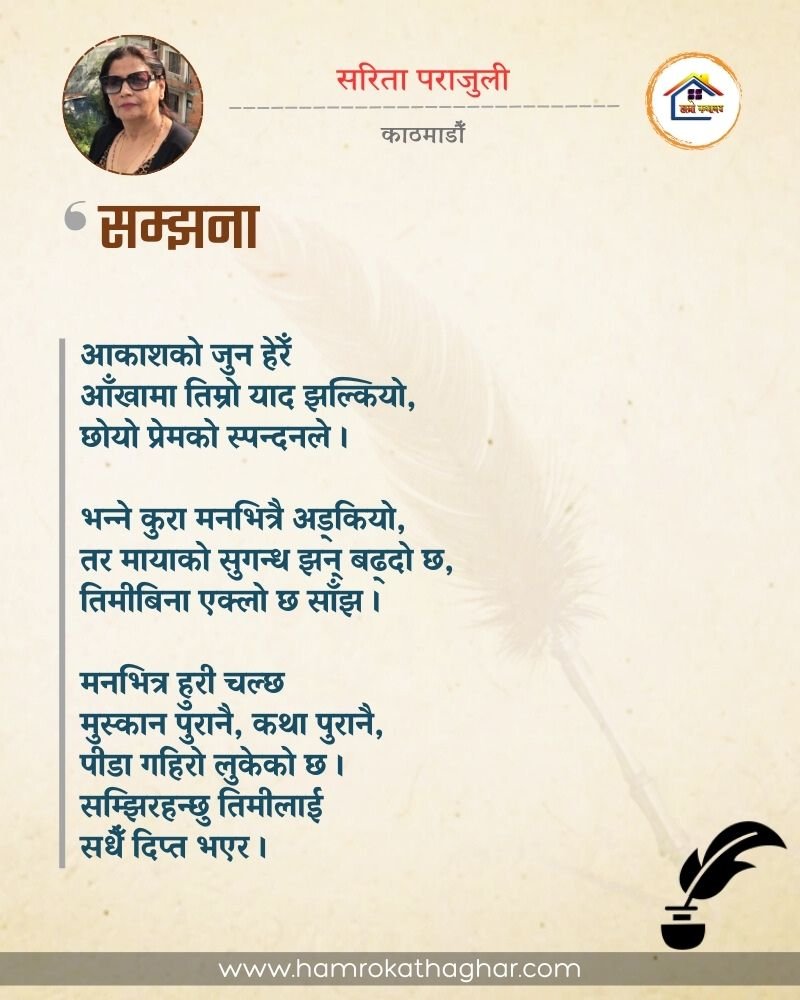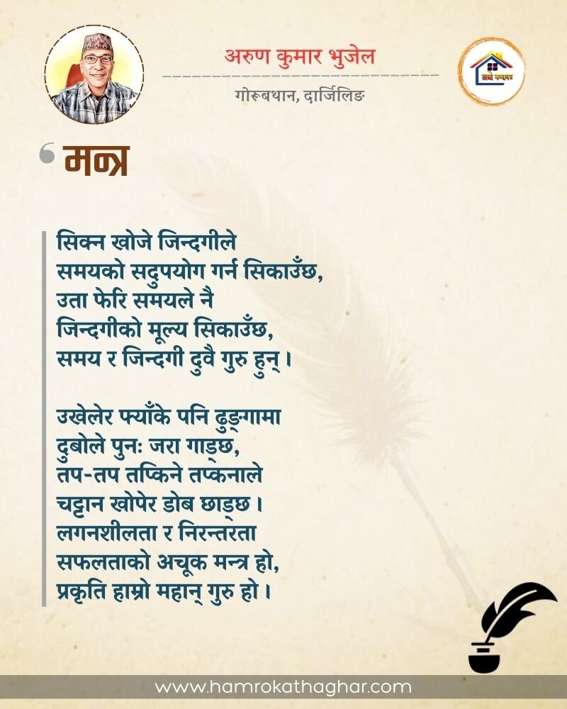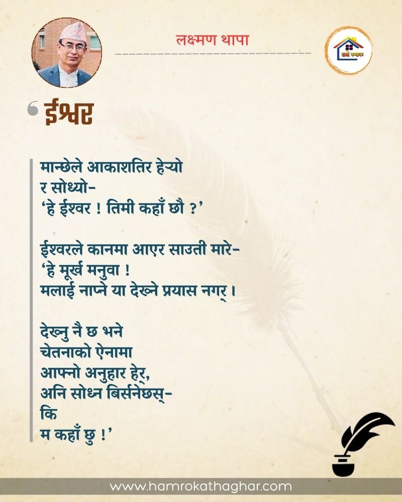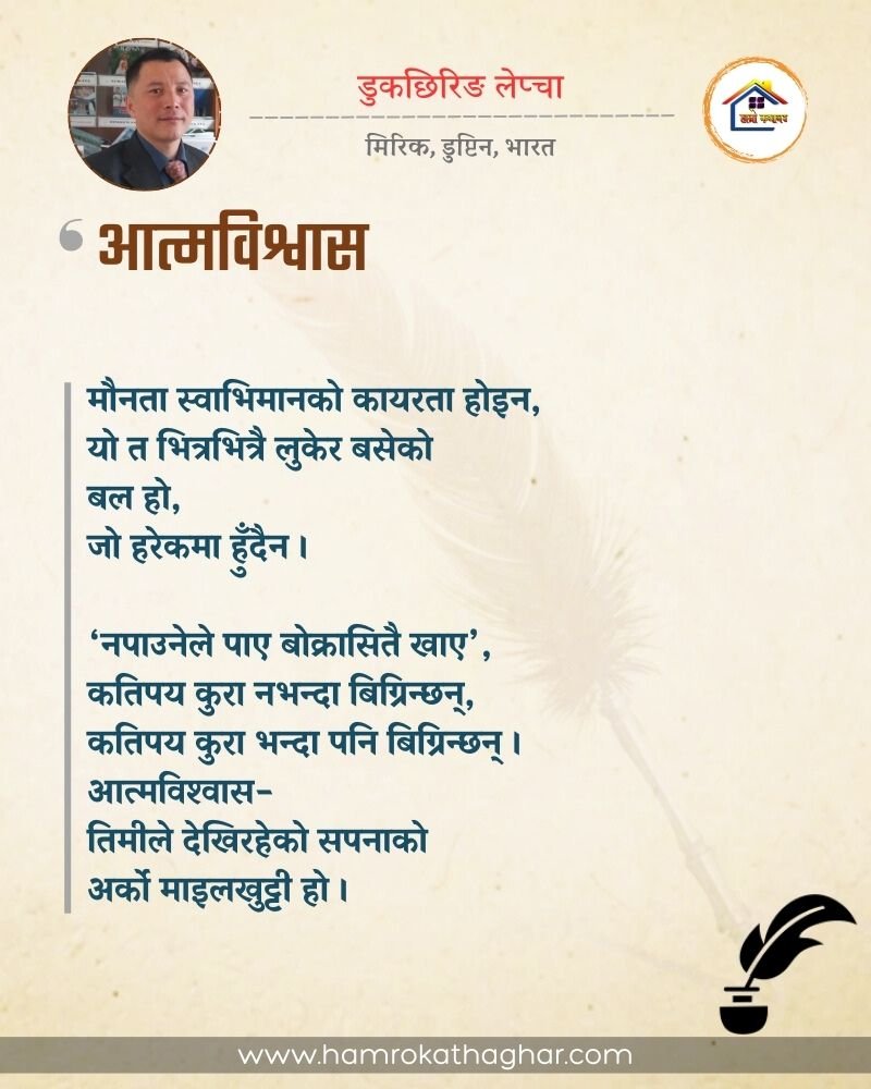 नेपाली भाषा साहित्यलाई माया गरेर यहाँसम्म आइ, यहाँ प्रकाशित लेख/रचनाहरू पढिदिनु भएकोमा तपाईँलाई धेरै धेरै धन्यवाद। तपाईँले भर्खरै माथि पढेको लेख/रचना कस्तो लाग्यो कमेन्ट बक्समा आफ्नो प्रतिक्रिया राख्न सक्नु हुनेछ। आफ्नो मनमा लागेको प्रतिक्रिया राख्न तपाईँ स्वतन्त्र हुनुहुन्छ। यदि तपाईँ पनि नेपाली भाषा साहित्यमा कलम चलाउनु हुन्छ भने आफ्नो छोटो परिचय र एक प्रति अनुहार चिनिने तस्बिर सहित आफ्ना लेख/रचनाहरू हामीलाई hamrokathaghar@gmail.com मा पठाउन सक्नु हुनेछ। अन्य कुनै पनि जानकारीका लागि +९१८७३८०९३५७३ नम्बरमा ह्वाट्सएप गर्न सक्नु हुनेछ। धन्यवाद । नोट: यहाँ प्रकाशित कुनै पनि लेख/रचनाहरू लेखकको वा 'हाम्रो कथा घर' को अनुमति बिना कुनै पनि माध्यमबाट प्रकाशन प्रसारण गर्न पाइने छैन । अन्यथा, यस्तो गरिएको पाएमा प्रचलित कानुन बमोजिम कारबाही गरिने जानकारी गराउँदछौ।