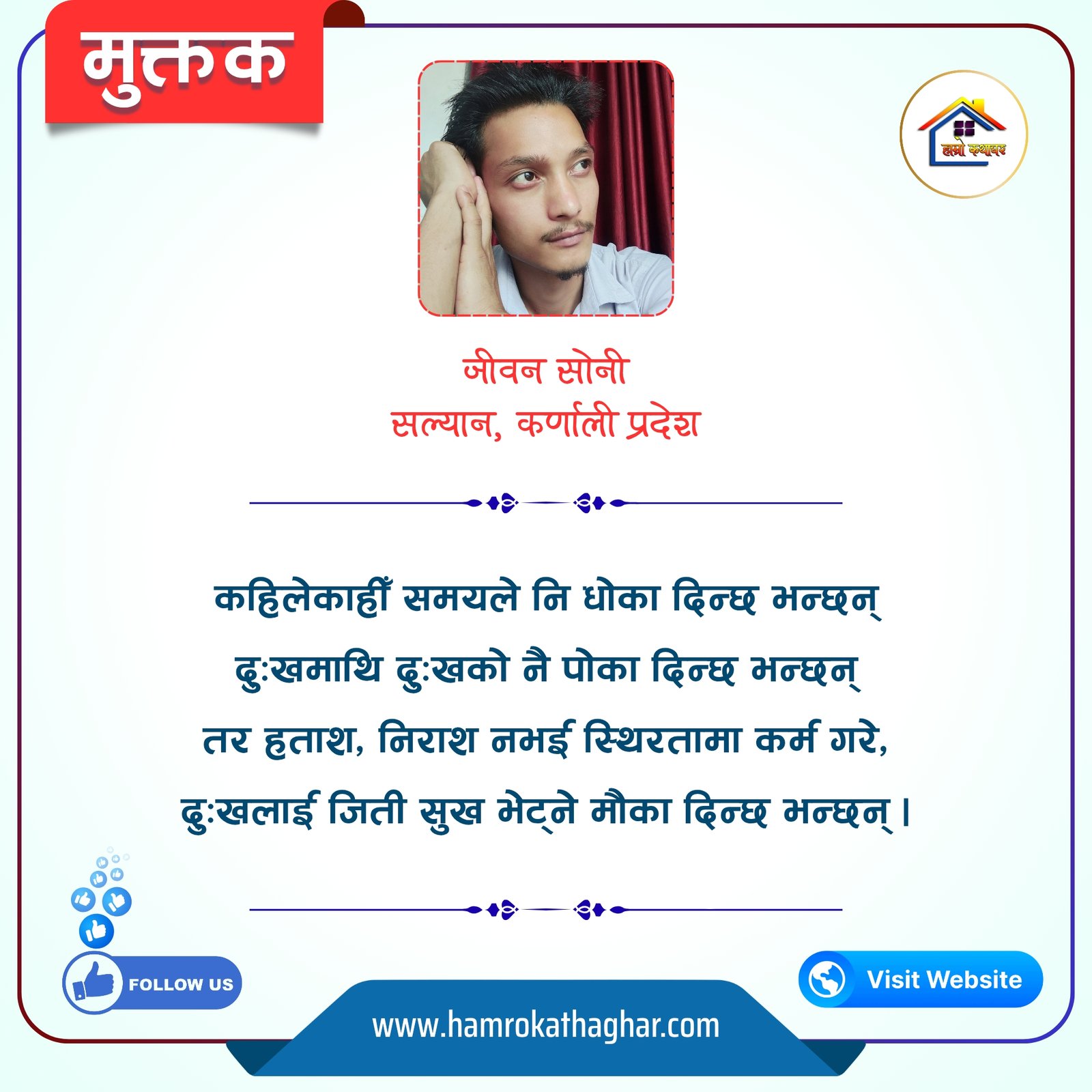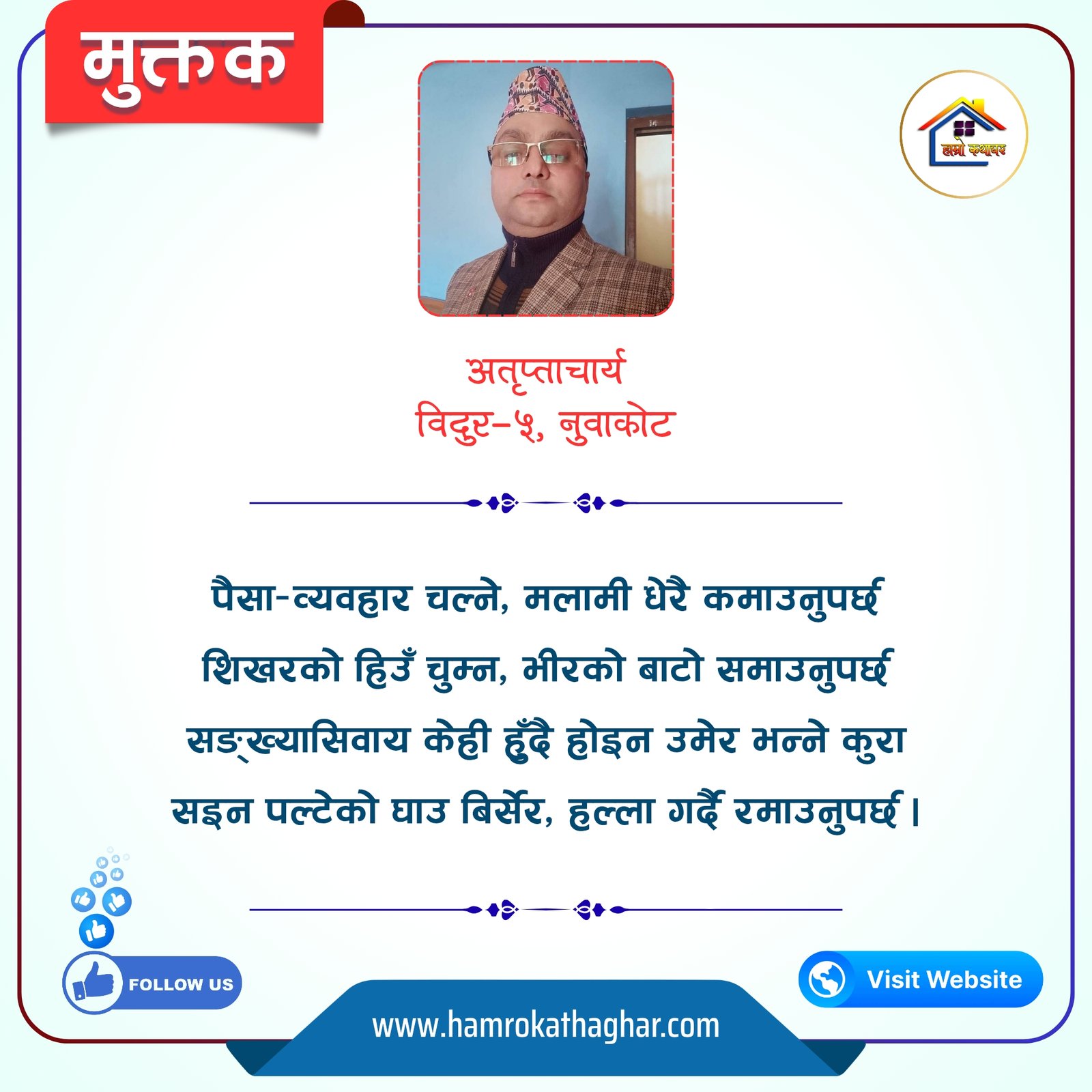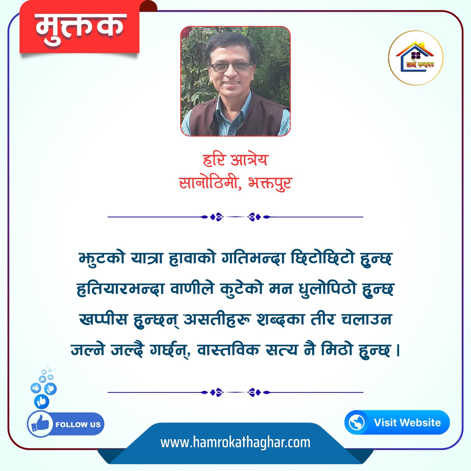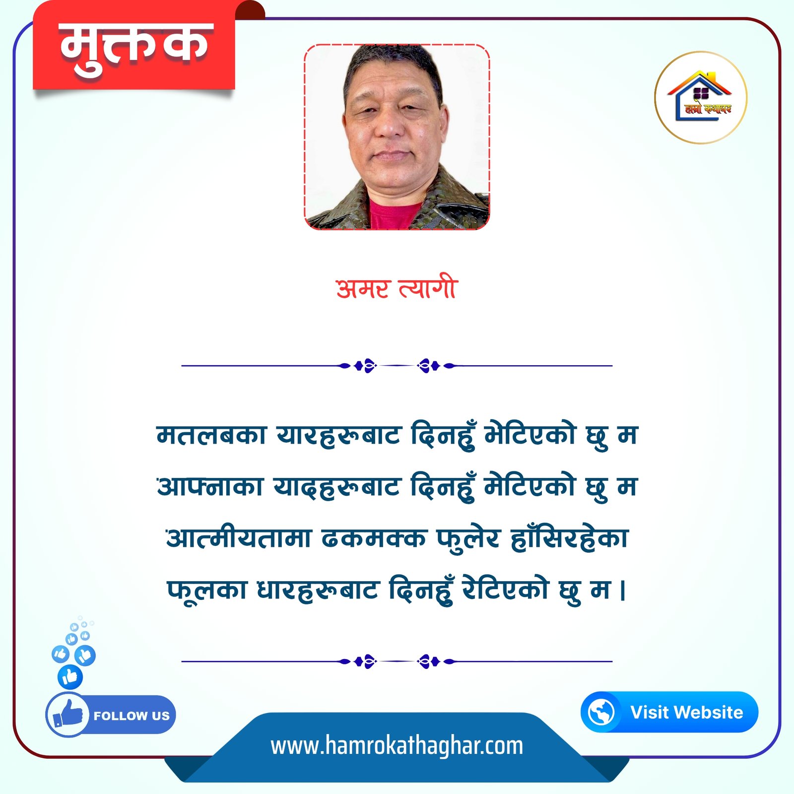 नेपाली भाषा साहित्यलाई माया गरेर यहाँसम्म आइ, यहाँ प्रकाशित लेख/रचनाहरू पढिदिनु भएकोमा तपाईँलाई धेरै धेरै धन्यवाद। तपाईँले भर्खरै माथि पढेको लेख/रचना कस्तो लाग्यो कमेन्ट बक्समा आफ्नो प्रतिक्रिया राख्न सक्नु हुनेछ। आफ्नो मनमा लागेको प्रतिक्रिया राख्न तपाईँ स्वतन्त्र हुनुहुन्छ। यदि तपाईँ पनि नेपाली भाषा साहित्यमा कलम चलाउनु हुन्छ भने आफ्नो छोटो परिचय र एक प्रति अनुहार चिनिने तस्बिर सहित आफ्ना लेख/रचनाहरू हामीलाई hamrokathaghar@gmail.com मा पठाउन सक्नु हुनेछ। अन्य कुनै पनि जानकारीका लागि +९१८७३८०९३५७३ नम्बरमा ह्वाट्सएप गर्न सक्नु हुनेछ। धन्यवाद । नोट: यहाँ प्रकाशित कुनै पनि लेख/रचनाहरू लेखकको वा 'हाम्रो कथा घर' को अनुमति बिना कुनै पनि माध्यमबाट प्रकाशन प्रसारण गर्न पाइने छैन । अन्यथा, यस्तो गरिएको पाएमा प्रचलित कानुन बमोजिम कारबाही गरिने जानकारी गराउँदछौ।
