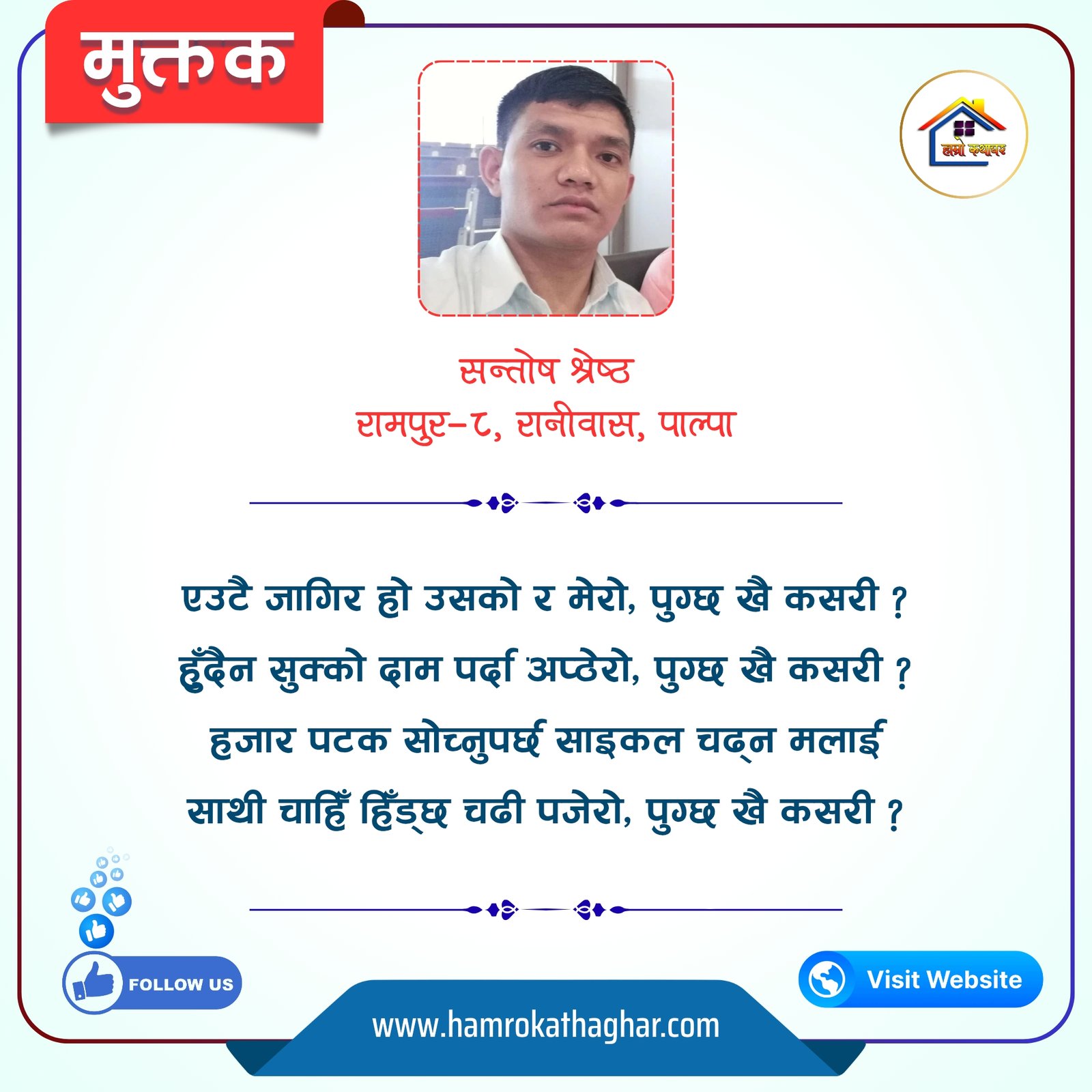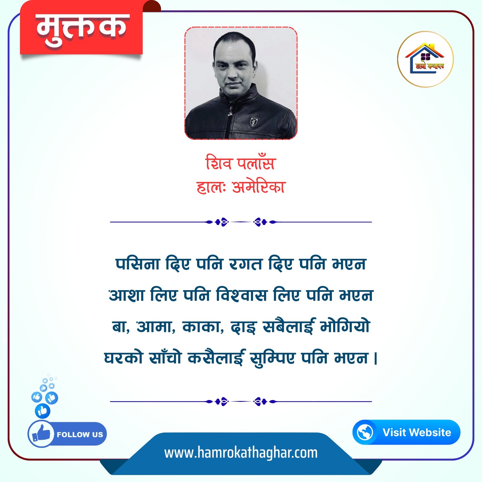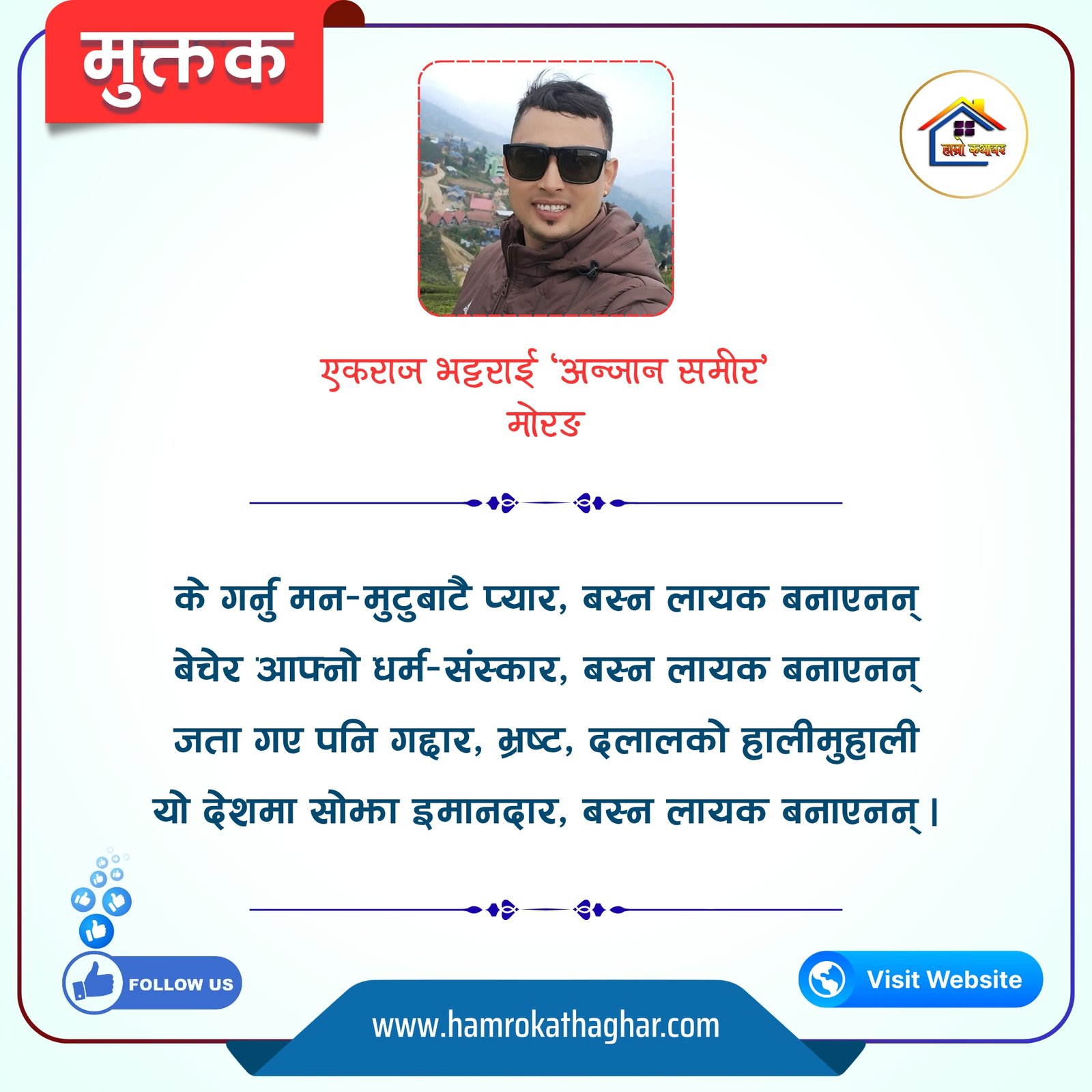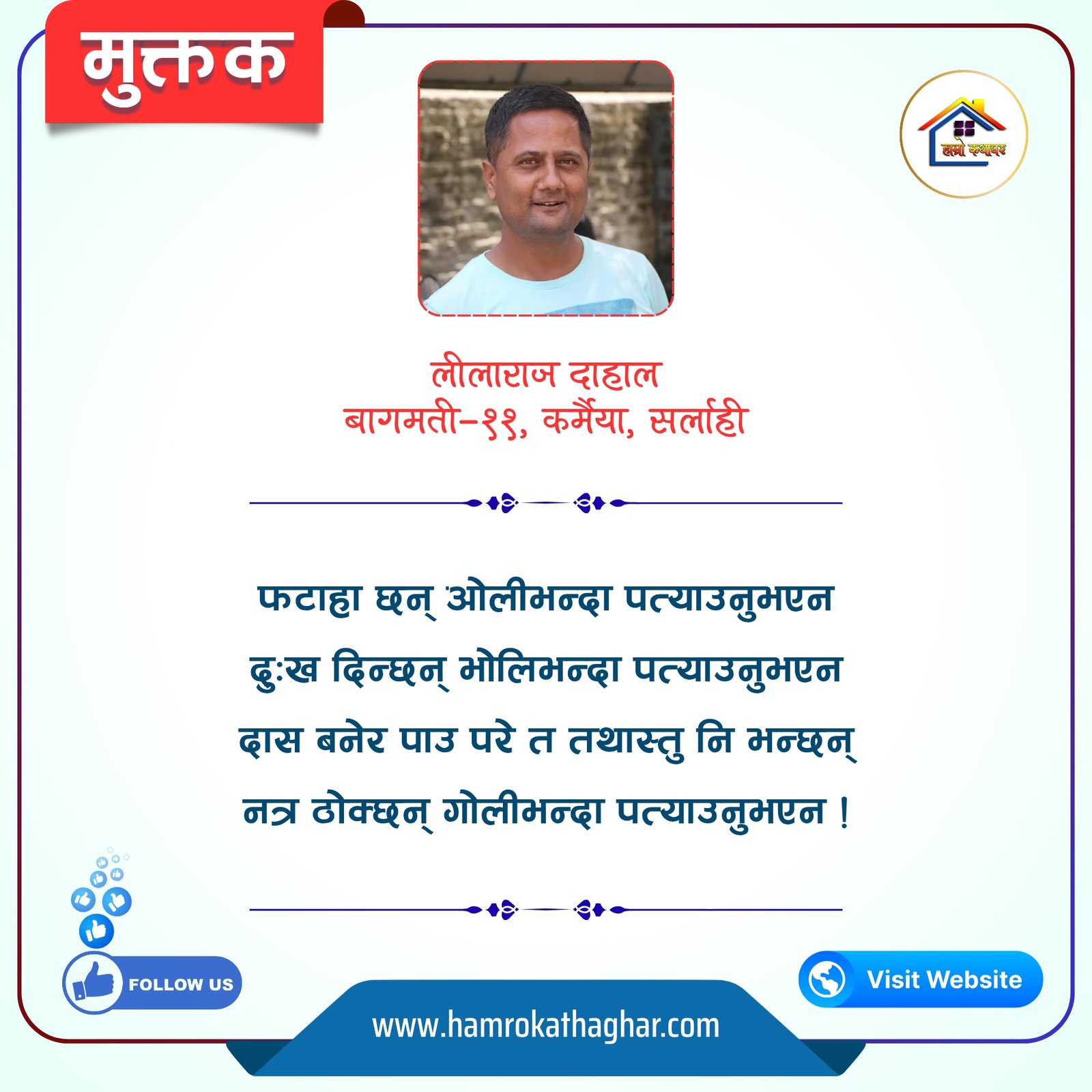नेपाली भाषा साहित्यलाई माया गरेर यहाँसम्म आइ, यहाँ प्रकाशित लेख/रचनाहरू पढिदिनु भएकोमा तपाईँलाई धेरै धेरै धन्यवाद। तपाईँले भर्खरै माथि पढेको लेख/रचना कस्तो लाग्यो कमेन्ट बक्समा आफ्नो प्रतिक्रिया राख्न सक्नु हुनेछ। आफ्नो मनमा लागेको प्रतिक्रिया राख्न तपाईँ स्वतन्त्र हुनुहुन्छ। यदि तपाईँ पनि नेपाली भाषा साहित्यमा कलम चलाउनु हुन्छ भने आफ्नो छोटो परिचय र एक प्रति अनुहार चिनिने तस्बिर सहित आफ्ना लेख/रचनाहरू हामीलाई hamrokathaghar@gmail.com मा पठाउन सक्नु हुनेछ। अन्य कुनै पनि जानकारीका लागि +९१८७३८०९३५७३ नम्बरमा ह्वाट्सएप गर्न सक्नु हुनेछ। धन्यवाद । नोट: यहाँ प्रकाशित कुनै पनि लेख/रचनाहरू लेखकको वा 'हाम्रो कथा घर' को अनुमति बिना कुनै पनि माध्यमबाट प्रकाशन प्रसारण गर्न पाइने छैन । अन्यथा, यस्तो गरिएको पाएमा प्रचलित कानुन बमोजिम कारबाही गरिने जानकारी गराउँदछौ।