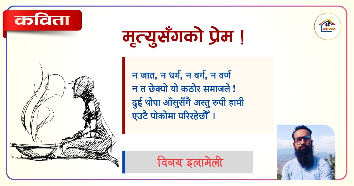 नेपाली भाषा साहित्यलाई माया गरेर यहाँसम्म आइ, यहाँ प्रकाशित लेख/रचनाहरू पढिदिनु भएकोमा तपाईँलाई धेरै धेरै धन्यवाद। तपाईँले भर्खरै माथि पढेको लेख/रचना कस्तो लाग्यो कमेन्ट बक्समा आफ्नो प्रतिक्रिया राख्न सक्नु हुनेछ। आफ्नो मनमा लागेको प्रतिक्रिया राख्न तपाईँ स्वतन्त्र हुनुहुन्छ। यदि तपाईँ पनि नेपाली भाषा साहित्यमा कलम चलाउनु हुन्छ भने आफ्नो छोटो परिचय र एक प्रति अनुहार चिनिने तस्बिर सहित आफ्ना लेख/रचनाहरू हामीलाई hamrokathaghar@gmail.com मा पठाउन सक्नु हुनेछ। अन्य कुनै पनि जानकारीका लागि +९१८७३८०९३५७३ नम्बरमा ह्वाट्सएप गर्न सक्नु हुनेछ। धन्यवाद । नोट: यहाँ प्रकाशित कुनै पनि लेख/रचनाहरू लेखकको वा 'हाम्रो कथा घर' को अनुमति बिना कुनै पनि माध्यमबाट प्रकाशन प्रसारण गर्न पाइने छैन । अन्यथा, यस्तो गरिएको पाएमा प्रचलित कानुन बमोजिम कारबाही गरिने जानकारी गराउँदछौ।