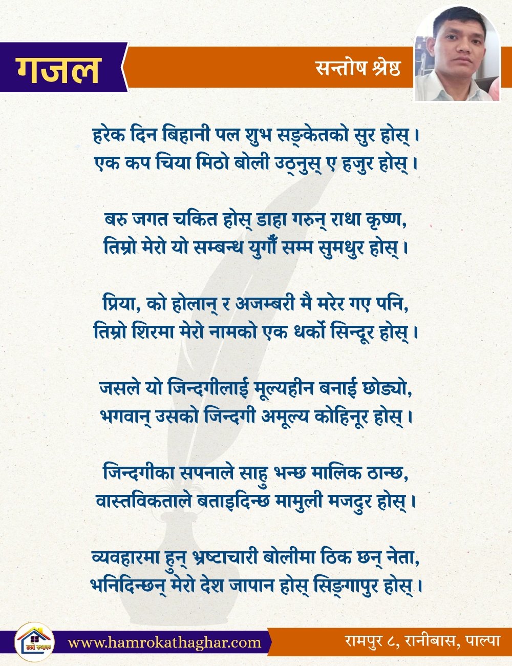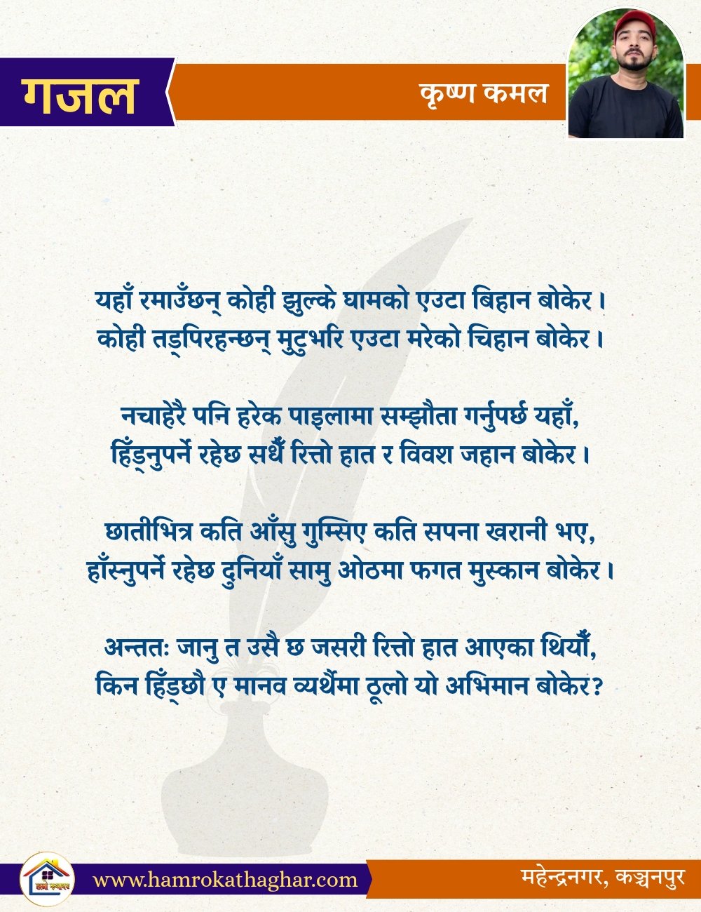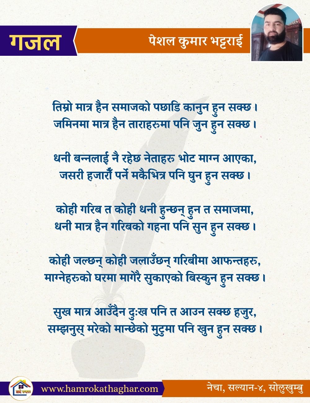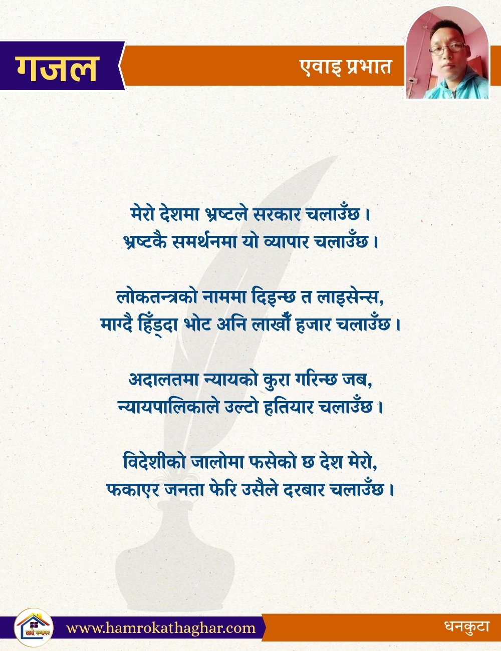 नेपाली भाषा साहित्यलाई माया गरेर यहाँसम्म आइ, यहाँ प्रकाशित लेख/रचनाहरू पढिदिनु भएकोमा तपाईँलाई धेरै धेरै धन्यवाद। तपाईँले भर्खरै माथि पढेको लेख/रचना कस्तो लाग्यो कमेन्ट बक्समा आफ्नो प्रतिक्रिया राख्न सक्नु हुनेछ। आफ्नो मनमा लागेको प्रतिक्रिया राख्न तपाईँ स्वतन्त्र हुनुहुन्छ। यदि तपाईँ पनि नेपाली भाषा साहित्यमा कलम चलाउनु हुन्छ भने आफ्नो छोटो परिचय र एक प्रति अनुहार चिनिने तस्बिर सहित आफ्ना लेख/रचनाहरू हामीलाई hamrokathaghar@gmail.com मा पठाउन सक्नु हुनेछ। अन्य कुनै पनि जानकारीका लागि +९१८७३८०९३५७३ नम्बरमा ह्वाट्सएप गर्न सक्नु हुनेछ। धन्यवाद । नोट: यहाँ प्रकाशित कुनै पनि लेख/रचनाहरू लेखकको वा 'हाम्रो कथा घर' को अनुमति बिना कुनै पनि माध्यमबाट प्रकाशन प्रसारण गर्न पाइने छैन । अन्यथा, यस्तो गरिएको पाएमा प्रचलित कानुन बमोजिम कारबाही गरिने जानकारी गराउँदछौ।