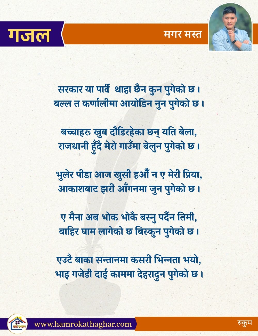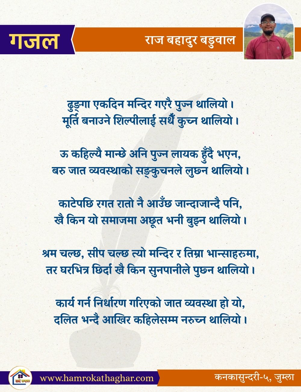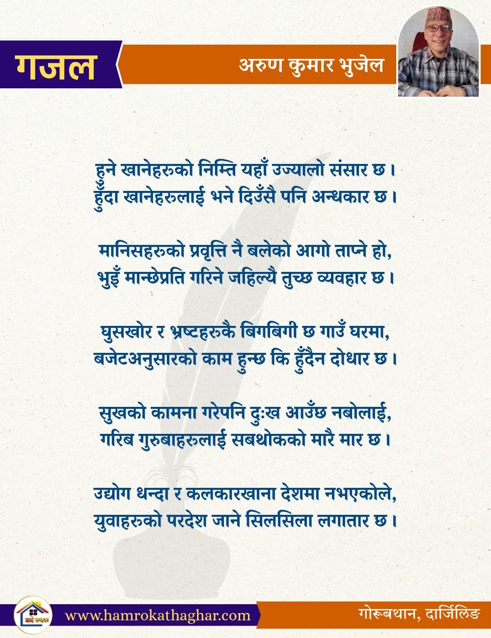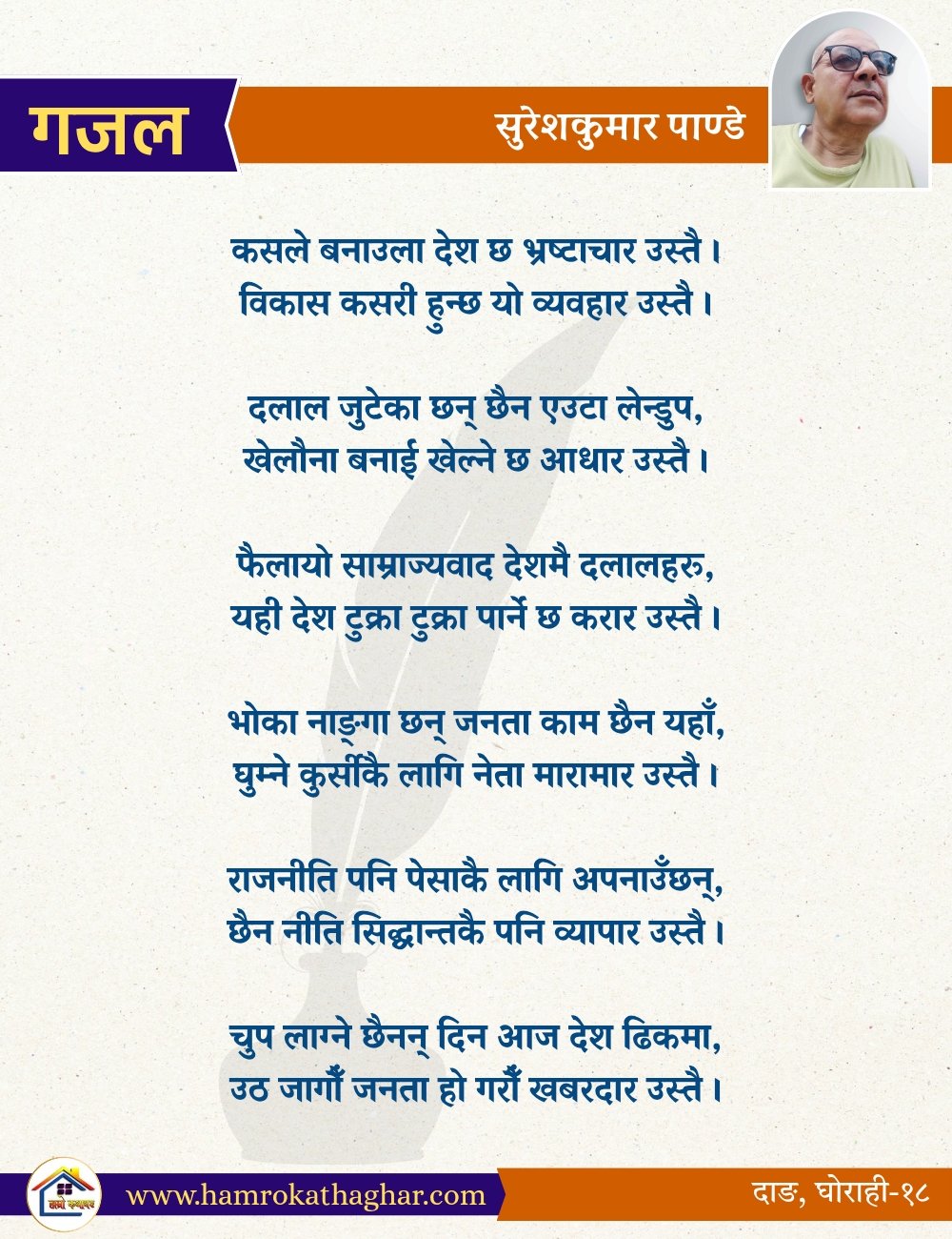 नेपाली भाषा साहित्यलाई माया गरेर यहाँसम्म आइ, यहाँ प्रकाशित लेख/रचनाहरू पढिदिनु भएकोमा तपाईँलाई धेरै धेरै धन्यवाद। तपाईँले भर्खरै माथि पढेको लेख/रचना कस्तो लाग्यो कमेन्ट बक्समा आफ्नो प्रतिक्रिया राख्न सक्नु हुनेछ। आफ्नो मनमा लागेको प्रतिक्रिया राख्न तपाईँ स्वतन्त्र हुनुहुन्छ। यदि तपाईँ पनि नेपाली भाषा साहित्यमा कलम चलाउनु हुन्छ भने आफ्नो छोटो परिचय र एक प्रति अनुहार चिनिने तस्बिर सहित आफ्ना लेख/रचनाहरू हामीलाई hamrokathaghar@gmail.com मा पठाउन सक्नु हुनेछ। अन्य कुनै पनि जानकारीका लागि +९१८७३८०९३५७३ नम्बरमा ह्वाट्सएप गर्न सक्नु हुनेछ। धन्यवाद । नोट: यहाँ प्रकाशित कुनै पनि लेख/रचनाहरू लेखकको वा 'हाम्रो कथा घर' को अनुमति बिना कुनै पनि माध्यमबाट प्रकाशन प्रसारण गर्न पाइने छैन । अन्यथा, यस्तो गरिएको पाएमा प्रचलित कानुन बमोजिम कारबाही गरिने जानकारी गराउँदछौ।