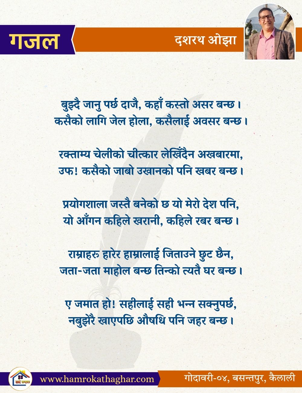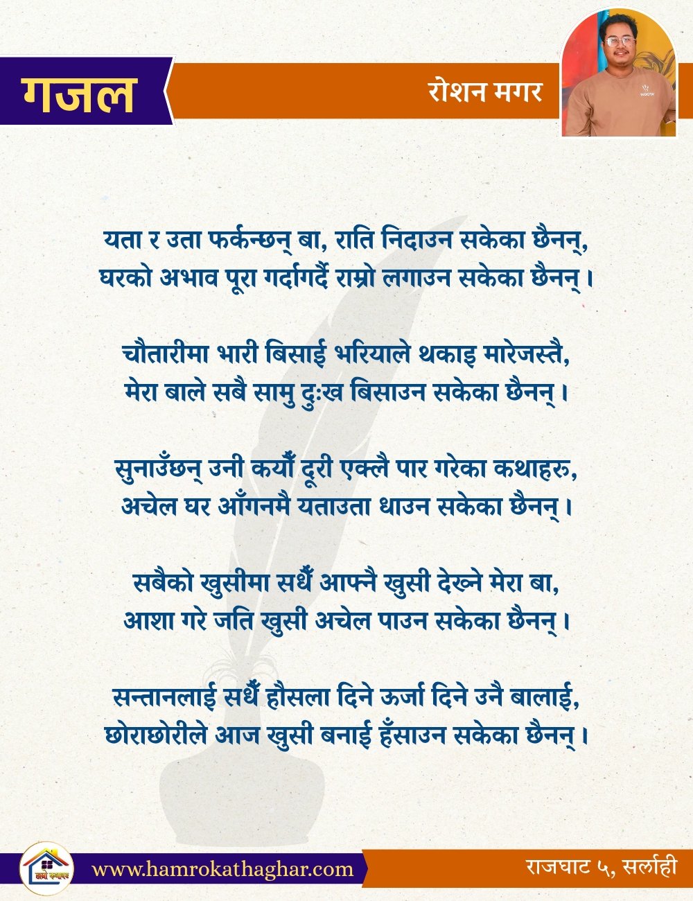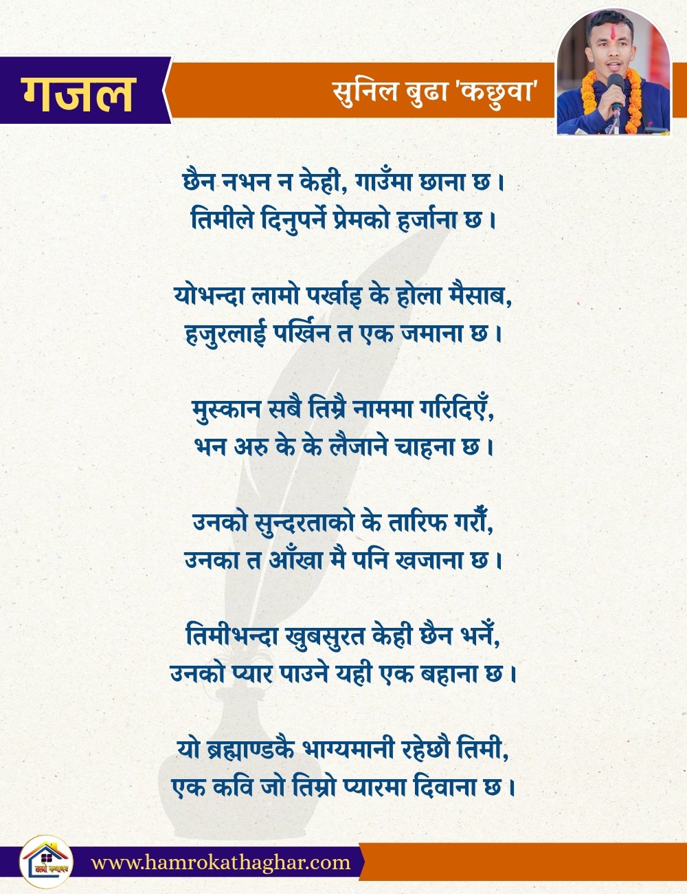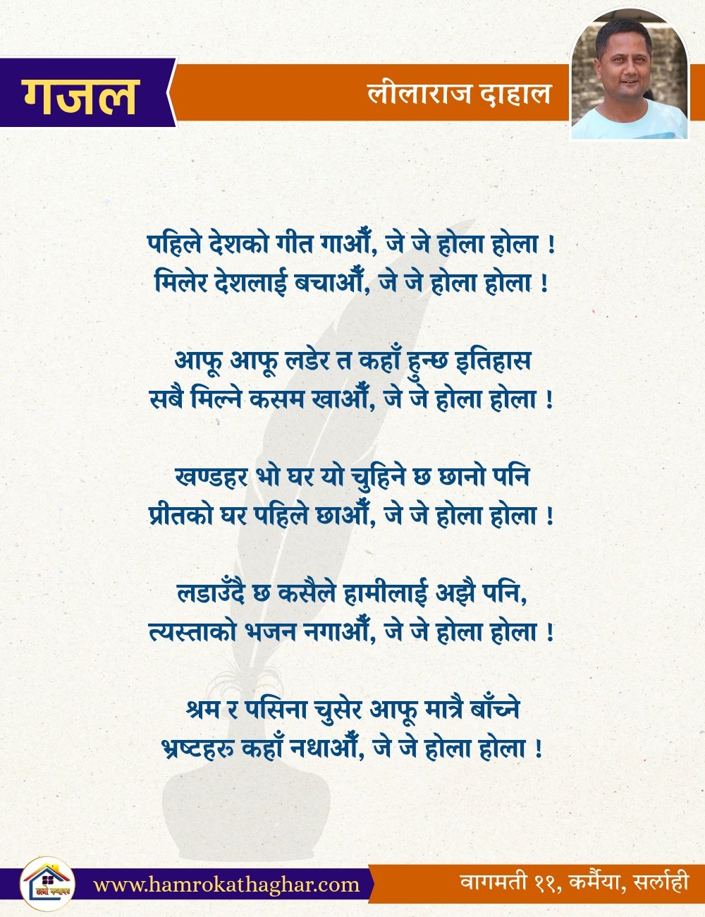 नेपाली भाषा साहित्यलाई माया गरेर यहाँसम्म आइ, यहाँ प्रकाशित लेख/रचनाहरू पढिदिनु भएकोमा तपाईँलाई धेरै धेरै धन्यवाद। तपाईँले भर्खरै माथि पढेको लेख/रचना कस्तो लाग्यो कमेन्ट बक्समा आफ्नो प्रतिक्रिया राख्न सक्नु हुनेछ। आफ्नो मनमा लागेको प्रतिक्रिया राख्न तपाईँ स्वतन्त्र हुनुहुन्छ। यदि तपाईँ पनि नेपाली भाषा साहित्यमा कलम चलाउनु हुन्छ भने आफ्नो छोटो परिचय र एक प्रति अनुहार चिनिने तस्बिर सहित आफ्ना लेख/रचनाहरू हामीलाई hamrokathaghar@gmail.com मा पठाउन सक्नु हुनेछ। अन्य कुनै पनि जानकारीका लागि +९१८७३८०९३५७३ नम्बरमा ह्वाट्सएप गर्न सक्नु हुनेछ। धन्यवाद । नोट: यहाँ प्रकाशित कुनै पनि लेख/रचनाहरू लेखकको वा 'हाम्रो कथा घर' को अनुमति बिना कुनै पनि माध्यमबाट प्रकाशन प्रसारण गर्न पाइने छैन । अन्यथा, यस्तो गरिएको पाएमा प्रचलित कानुन बमोजिम कारबाही गरिने जानकारी गराउँदछौ।