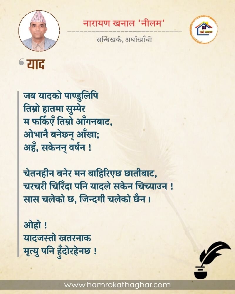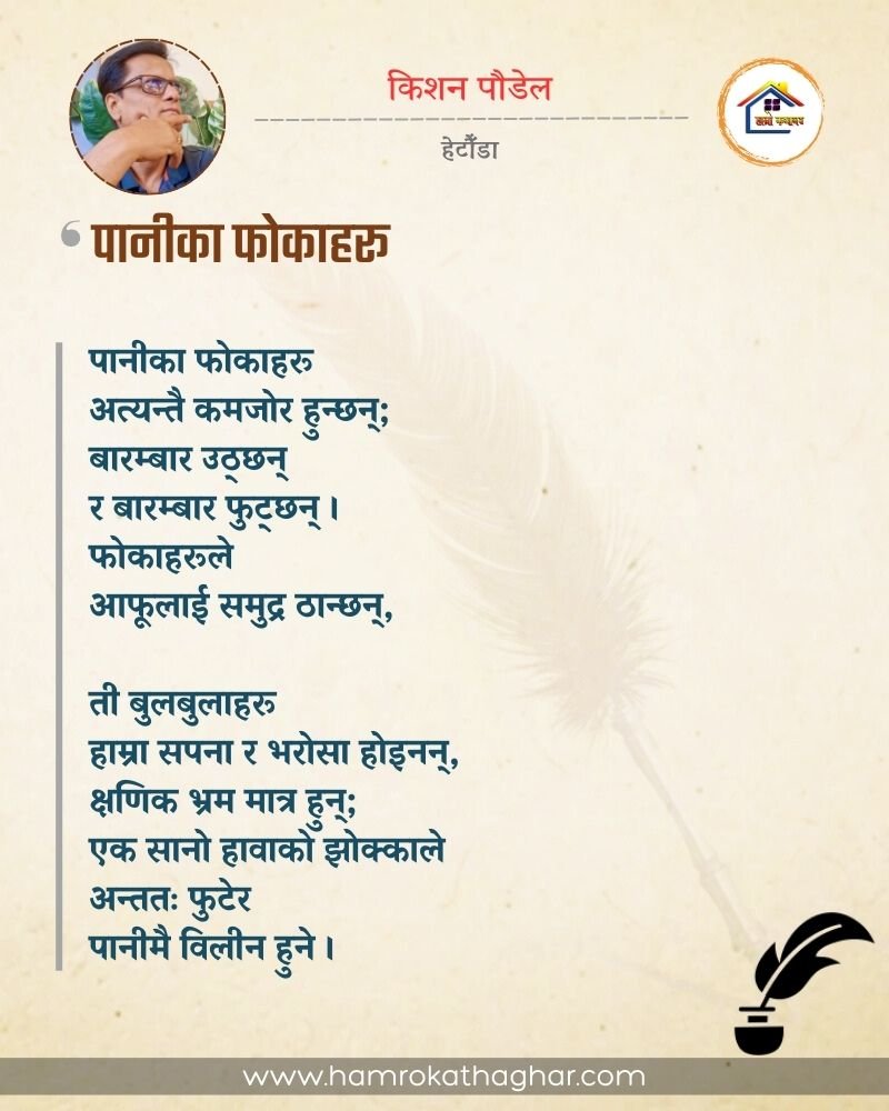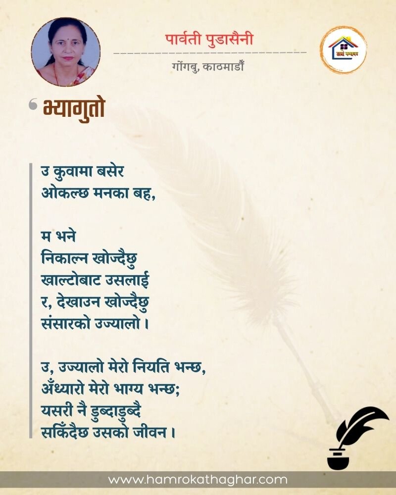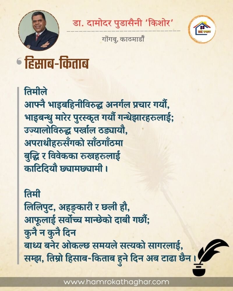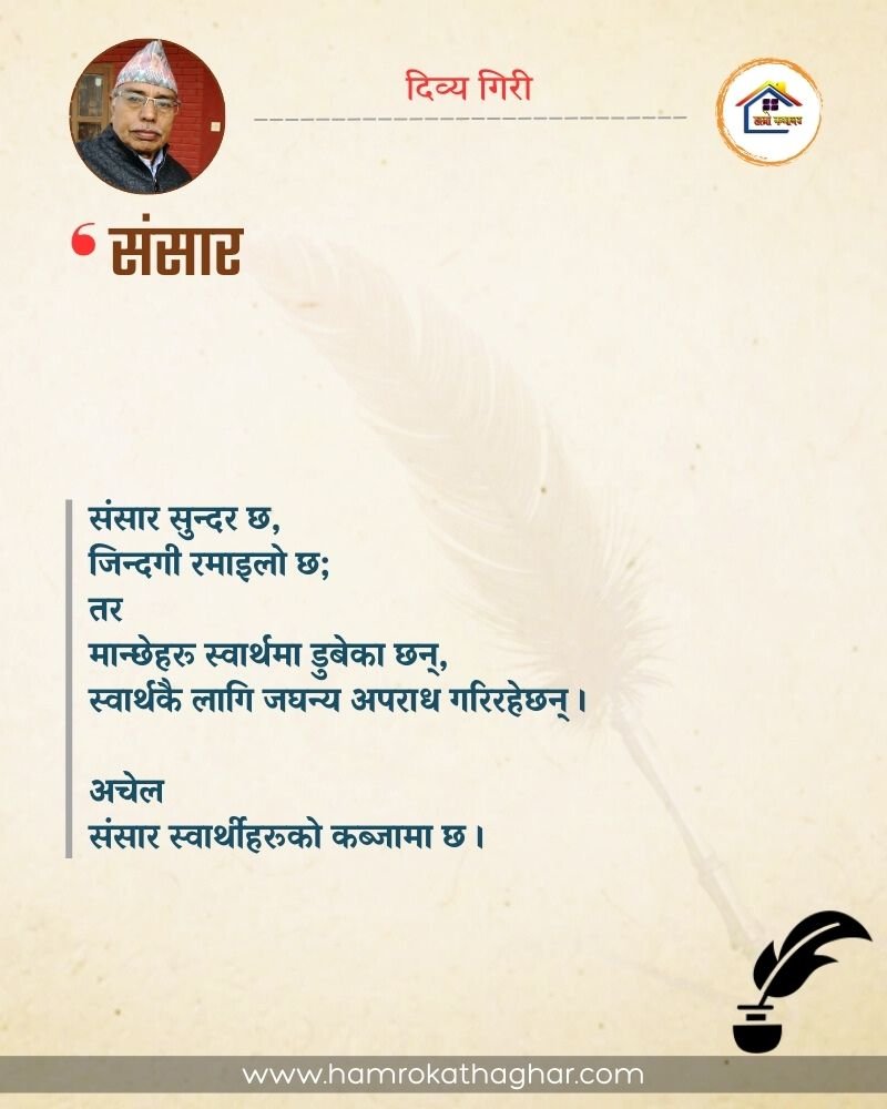 नेपाली भाषा साहित्यलाई माया गरेर यहाँसम्म आइ, यहाँ प्रकाशित लेख/रचनाहरू पढिदिनु भएकोमा तपाईँलाई धेरै धेरै धन्यवाद। तपाईँले भर्खरै माथि पढेको लेख/रचना कस्तो लाग्यो कमेन्ट बक्समा आफ्नो प्रतिक्रिया राख्न सक्नु हुनेछ। आफ्नो मनमा लागेको प्रतिक्रिया राख्न तपाईँ स्वतन्त्र हुनुहुन्छ। यदि तपाईँ पनि नेपाली भाषा साहित्यमा कलम चलाउनु हुन्छ भने आफ्नो छोटो परिचय र एक प्रति अनुहार चिनिने तस्बिर सहित आफ्ना लेख/रचनाहरू हामीलाई hamrokathaghar@gmail.com मा पठाउन सक्नु हुनेछ। अन्य कुनै पनि जानकारीका लागि +९१८७३८०९३५७३ नम्बरमा ह्वाट्सएप गर्न सक्नु हुनेछ। धन्यवाद । नोट: यहाँ प्रकाशित कुनै पनि लेख/रचनाहरू लेखकको वा 'हाम्रो कथा घर' को अनुमति बिना कुनै पनि माध्यमबाट प्रकाशन प्रसारण गर्न पाइने छैन । अन्यथा, यस्तो गरिएको पाएमा प्रचलित कानुन बमोजिम कारबाही गरिने जानकारी गराउँदछौ।