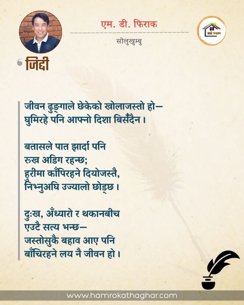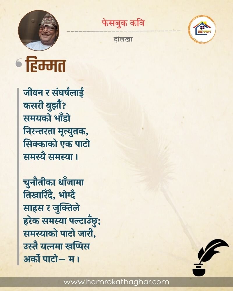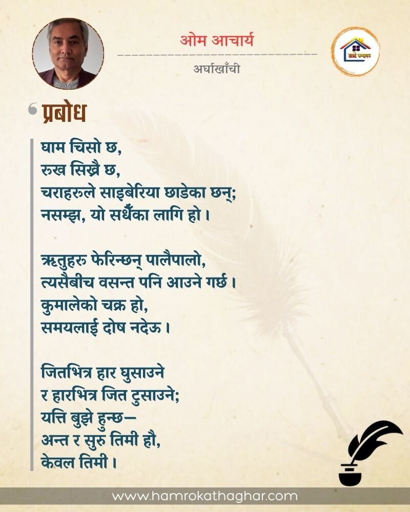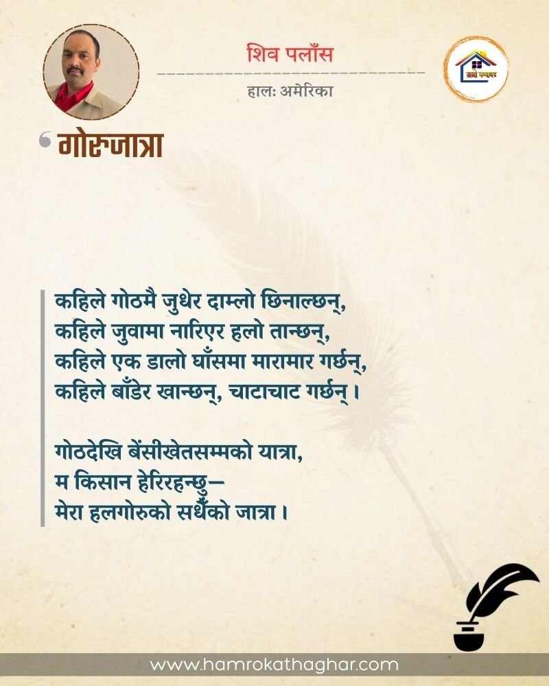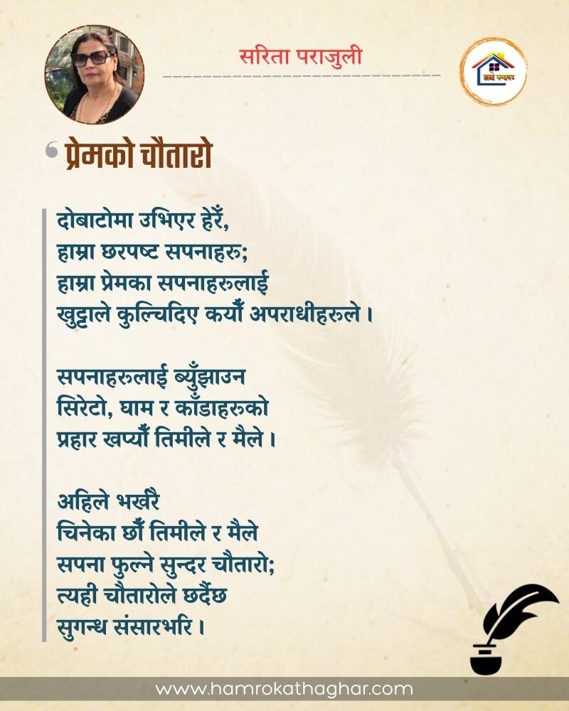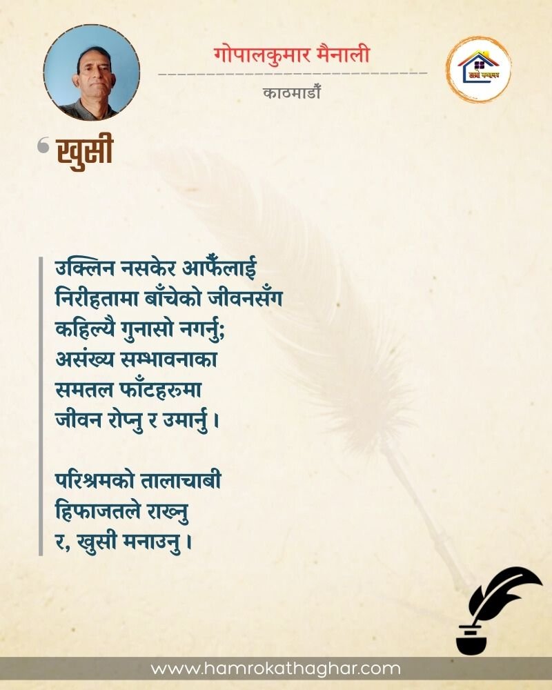 नेपाली भाषा साहित्यलाई माया गरेर यहाँसम्म आइ, यहाँ प्रकाशित लेख/रचनाहरू पढिदिनु भएकोमा तपाईँलाई धेरै धेरै धन्यवाद। तपाईँले भर्खरै माथि पढेको लेख/रचना कस्तो लाग्यो कमेन्ट बक्समा आफ्नो प्रतिक्रिया राख्न सक्नु हुनेछ। आफ्नो मनमा लागेको प्रतिक्रिया राख्न तपाईँ स्वतन्त्र हुनुहुन्छ। यदि तपाईँ पनि नेपाली भाषा साहित्यमा कलम चलाउनु हुन्छ भने आफ्नो छोटो परिचय र एक प्रति अनुहार चिनिने तस्बिर सहित आफ्ना लेख/रचनाहरू हामीलाई hamrokathaghar@gmail.com मा पठाउन सक्नु हुनेछ। अन्य कुनै पनि जानकारीका लागि +९१८७३८०९३५७३ नम्बरमा ह्वाट्सएप गर्न सक्नु हुनेछ। धन्यवाद । नोट: यहाँ प्रकाशित कुनै पनि लेख/रचनाहरू लेखकको वा 'हाम्रो कथा घर' को अनुमति बिना कुनै पनि माध्यमबाट प्रकाशन प्रसारण गर्न पाइने छैन । अन्यथा, यस्तो गरिएको पाएमा प्रचलित कानुन बमोजिम कारबाही गरिने जानकारी गराउँदछौ।