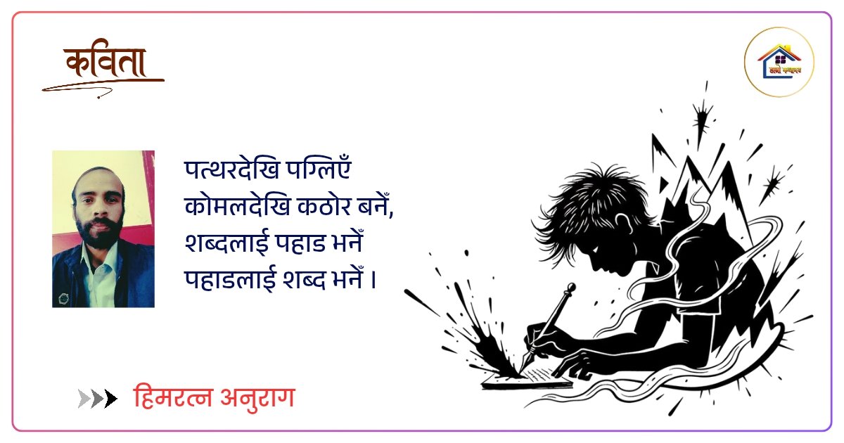 नेपाली भाषा साहित्यलाई माया गरेर यहाँसम्म आइ, यहाँ प्रकाशित लेख/रचनाहरू पढिदिनु भएकोमा तपाईँलाई धेरै धेरै धन्यवाद। तपाईँले भर्खरै माथि पढेको लेख/रचना कस्तो लाग्यो कमेन्ट बक्समा आफ्नो प्रतिक्रिया राख्न सक्नु हुनेछ। आफ्नो मनमा लागेको प्रतिक्रिया राख्न तपाईँ स्वतन्त्र हुनुहुन्छ। यदि तपाईँ पनि नेपाली भाषा साहित्यमा कलम चलाउनु हुन्छ भने आफ्नो छोटो परिचय र एक प्रति अनुहार चिनिने तस्बिर सहित आफ्ना लेख/रचनाहरू हामीलाई hamrokathaghar@gmail.com मा पठाउन सक्नु हुनेछ। अन्य कुनै पनि जानकारीका लागि +९१८७३८०९३५७३ नम्बरमा ह्वाट्सएप गर्न सक्नु हुनेछ। धन्यवाद । नोट: यहाँ प्रकाशित कुनै पनि लेख/रचनाहरू लेखकको वा 'हाम्रो कथा घर' को अनुमति बिना कुनै पनि माध्यमबाट प्रकाशन प्रसारण गर्न पाइने छैन । अन्यथा, यस्तो गरिएको पाएमा प्रचलित कानुन बमोजिम कारबाही गरिने जानकारी गराउँदछौ।
