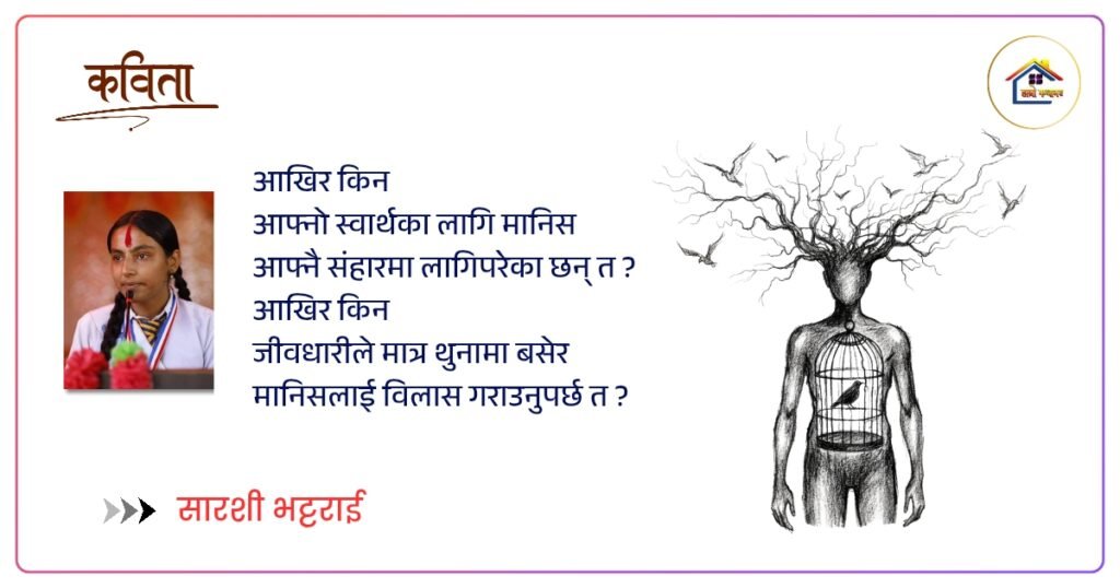नेपाली भाषा साहित्यलाई माया गरेर यहाँसम्म आइ, यहाँ प्रकाशित लेख/रचनाहरू पढिदिनु भएकोमा तपाईँलाई धेरै धेरै धन्यवाद। तपाईँले भर्खरै माथि पढेको लेख/रचना कस्तो लाग्यो कमेन्ट बक्समा आफ्नो प्रतिक्रिया राख्न सक्नु हुनेछ। आफ्नो मनमा लागेको प्रतिक्रिया राख्न तपाईँ स्वतन्त्र हुनुहुन्छ। यदि तपाईँ पनि नेपाली भाषा साहित्यमा कलम चलाउनु हुन्छ भने आफ्नो छोटो परिचय र एक प्रति अनुहार चिनिने तस्बिर सहित आफ्ना लेख/रचनाहरू हामीलाई hamrokathaghar@gmail.com मा पठाउन सक्नु हुनेछ। अन्य कुनै पनि जानकारीका लागि +९१८७३८०९३५७३ नम्बरमा ह्वाट्सएप गर्न सक्नु हुनेछ। धन्यवाद । नोट: यहाँ प्रकाशित कुनै पनि लेख/रचनाहरू लेखकको वा 'हाम्रो कथा घर' को अनुमति बिना कुनै पनि माध्यमबाट प्रकाशन प्रसारण गर्न पाइने छैन । अन्यथा, यस्तो गरिएको पाएमा प्रचलित कानुन बमोजिम कारबाही गरिने जानकारी गराउँदछौ।