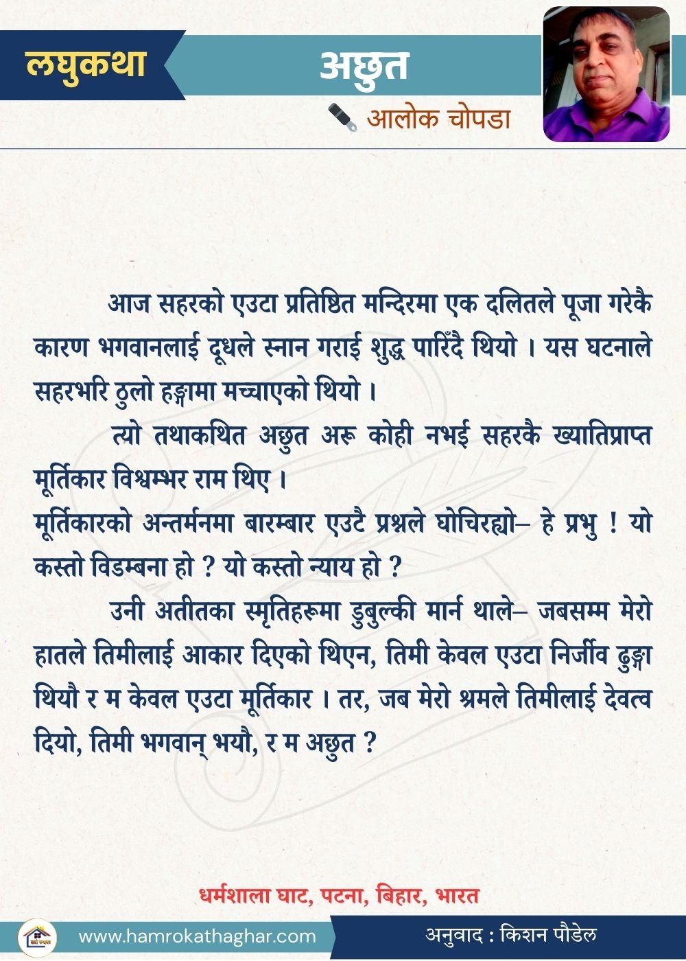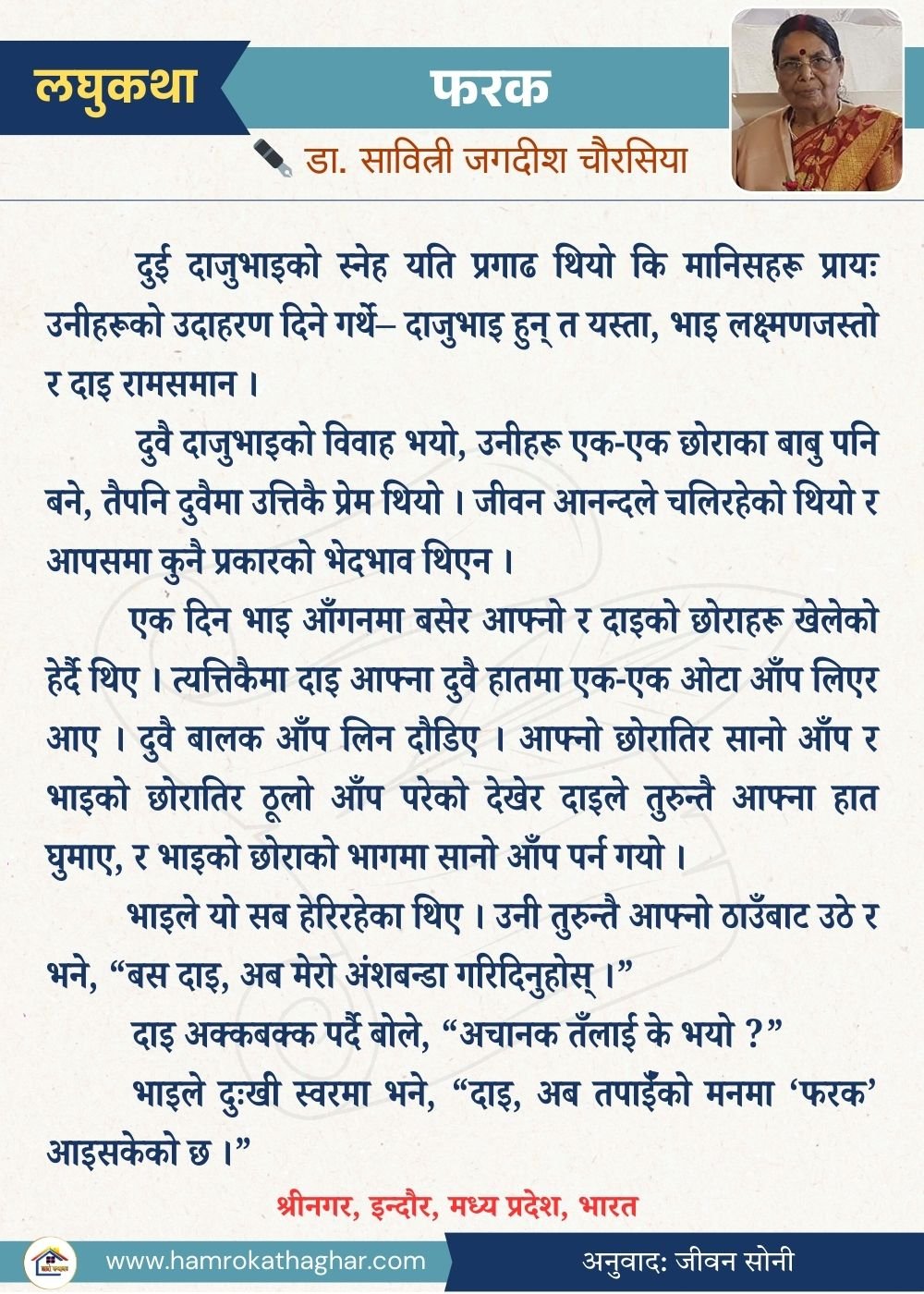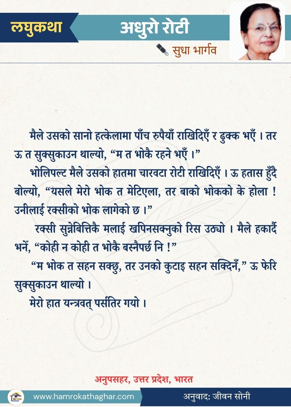 नेपाली भाषा साहित्यलाई माया गरेर यहाँसम्म आइ, यहाँ प्रकाशित लेख/रचनाहरू पढिदिनु भएकोमा तपाईँलाई धेरै धेरै धन्यवाद। तपाईँले भर्खरै माथि पढेको लेख/रचना कस्तो लाग्यो कमेन्ट बक्समा आफ्नो प्रतिक्रिया राख्न सक्नु हुनेछ। आफ्नो मनमा लागेको प्रतिक्रिया राख्न तपाईँ स्वतन्त्र हुनुहुन्छ। यदि तपाईँ पनि नेपाली भाषा साहित्यमा कलम चलाउनु हुन्छ भने आफ्नो छोटो परिचय र एक प्रति अनुहार चिनिने तस्बिर सहित आफ्ना लेख/रचनाहरू हामीलाई hamrokathaghar@gmail.com मा पठाउन सक्नु हुनेछ। अन्य कुनै पनि जानकारीका लागि +९१८७३८०९३५७३ नम्बरमा ह्वाट्सएप गर्न सक्नु हुनेछ। धन्यवाद । नोट: यहाँ प्रकाशित कुनै पनि लेख/रचनाहरू लेखकको वा 'हाम्रो कथा घर' को अनुमति बिना कुनै पनि माध्यमबाट प्रकाशन प्रसारण गर्न पाइने छैन । अन्यथा, यस्तो गरिएको पाएमा प्रचलित कानुन बमोजिम कारबाही गरिने जानकारी गराउँदछौ।