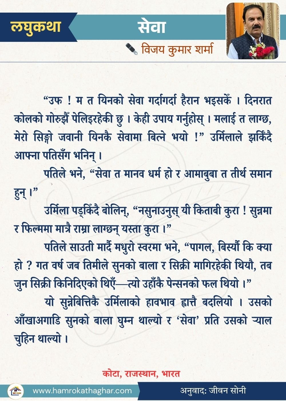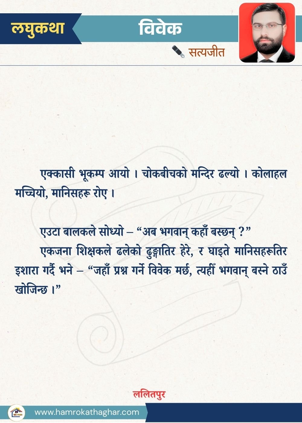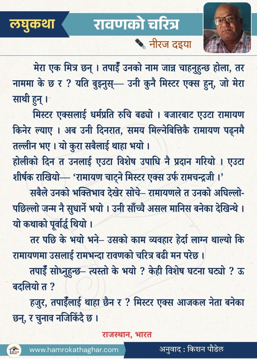 नेपाली भाषा साहित्यलाई माया गरेर यहाँसम्म आइ, यहाँ प्रकाशित लेख/रचनाहरू पढिदिनु भएकोमा तपाईँलाई धेरै धेरै धन्यवाद। तपाईँले भर्खरै माथि पढेको लेख/रचना कस्तो लाग्यो कमेन्ट बक्समा आफ्नो प्रतिक्रिया राख्न सक्नु हुनेछ। आफ्नो मनमा लागेको प्रतिक्रिया राख्न तपाईँ स्वतन्त्र हुनुहुन्छ। यदि तपाईँ पनि नेपाली भाषा साहित्यमा कलम चलाउनु हुन्छ भने आफ्नो छोटो परिचय र एक प्रति अनुहार चिनिने तस्बिर सहित आफ्ना लेख/रचनाहरू हामीलाई hamrokathaghar@gmail.com मा पठाउन सक्नु हुनेछ। अन्य कुनै पनि जानकारीका लागि +९१८७३८०९३५७३ नम्बरमा ह्वाट्सएप गर्न सक्नु हुनेछ। धन्यवाद । नोट: यहाँ प्रकाशित कुनै पनि लेख/रचनाहरू लेखकको वा 'हाम्रो कथा घर' को अनुमति बिना कुनै पनि माध्यमबाट प्रकाशन प्रसारण गर्न पाइने छैन । अन्यथा, यस्तो गरिएको पाएमा प्रचलित कानुन बमोजिम कारबाही गरिने जानकारी गराउँदछौ।