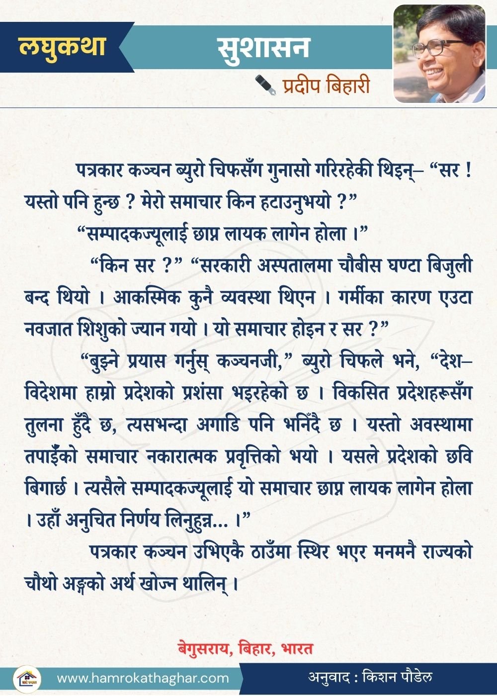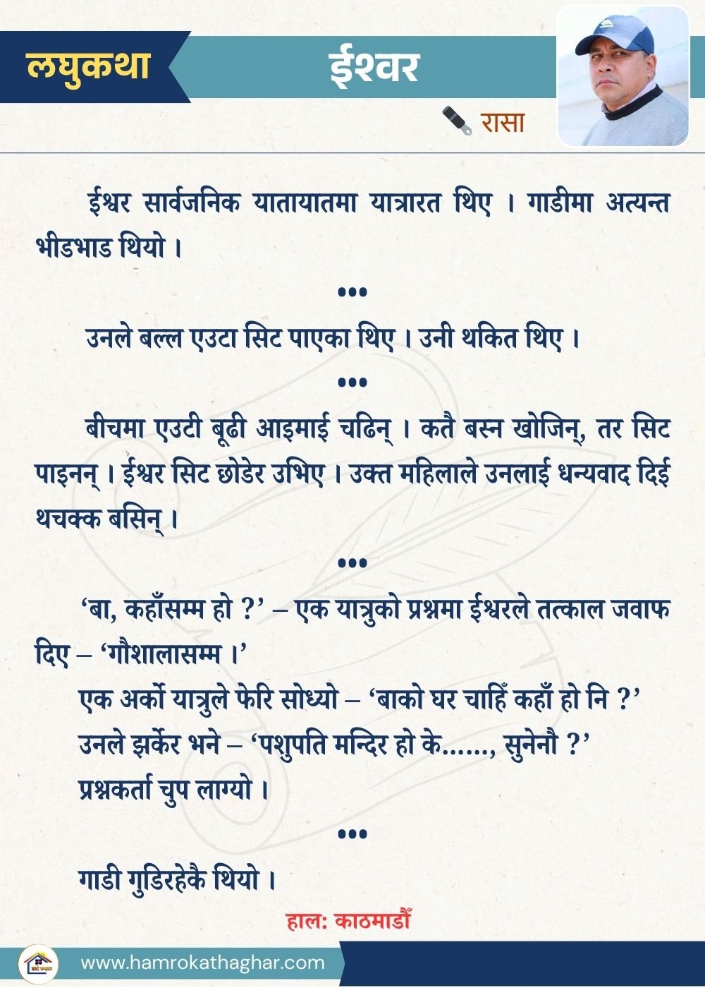 हाम्रो कथाघरको यस ‘स्मार्ट लघुकथा’ स्तम्भका संयोजक तथा सम्पादक हेटौँडाका कवि एवम् लघुकथाकार किशन पौडेल हुनुहुन्छ। यस स्तम्भमा नेपाली लघुकथाका साथै देश-विदेशका लेखकहरूका छोटा, गहन र मानवीय संवेदनाले ओतप्रोत सामाजिक विषयका लघुकथाहरू प्रकाशन गरिनेछ।