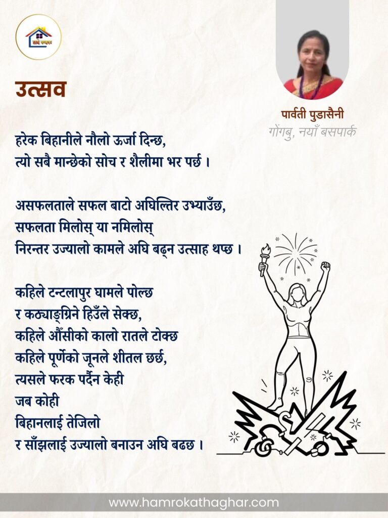 नेपाली भाषा साहित्यलाई माया गरेर यहाँसम्म आइ, यहाँ प्रकाशित लेख/रचनाहरू पढिदिनु भएकोमा तपाईँलाई धेरै धेरै धन्यवाद। तपाईँले भर्खरै माथि पढेको लेख/रचना कस्तो लाग्यो कमेन्ट बक्समा आफ्नो प्रतिक्रिया राख्न सक्नु हुनेछ। आफ्नो मनमा लागेको प्रतिक्रिया राख्न तपाईँ स्वतन्त्र हुनुहुन्छ। यदि तपाईँ पनि नेपाली भाषा साहित्यमा कलम चलाउनु हुन्छ भने आफ्नो छोटो परिचय र एक प्रति अनुहार चिनिने तस्बिर सहित आफ्ना लेख/रचनाहरू हामीलाई hamrokathaghar@gmail.com मा पठाउन सक्नु हुनेछ। अन्य कुनै पनि जानकारीका लागि +९१८७३८०९३५७३ नम्बरमा ह्वाट्सएप गर्न सक्नु हुनेछ। धन्यवाद । नोट: यहाँ प्रकाशित कुनै पनि लेख/रचनाहरू लेखकको वा 'हाम्रो कथा घर' को अनुमति बिना कुनै पनि माध्यमबाट प्रकाशन प्रसारण गर्न पाइने छैन । अन्यथा, यस्तो गरिएको पाएमा प्रचलित कानुन बमोजिम कारबाही गरिने जानकारी गराउँदछौ।