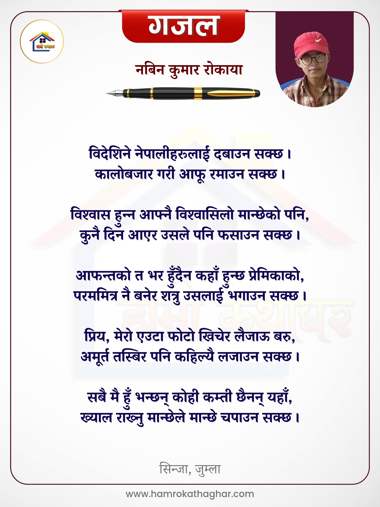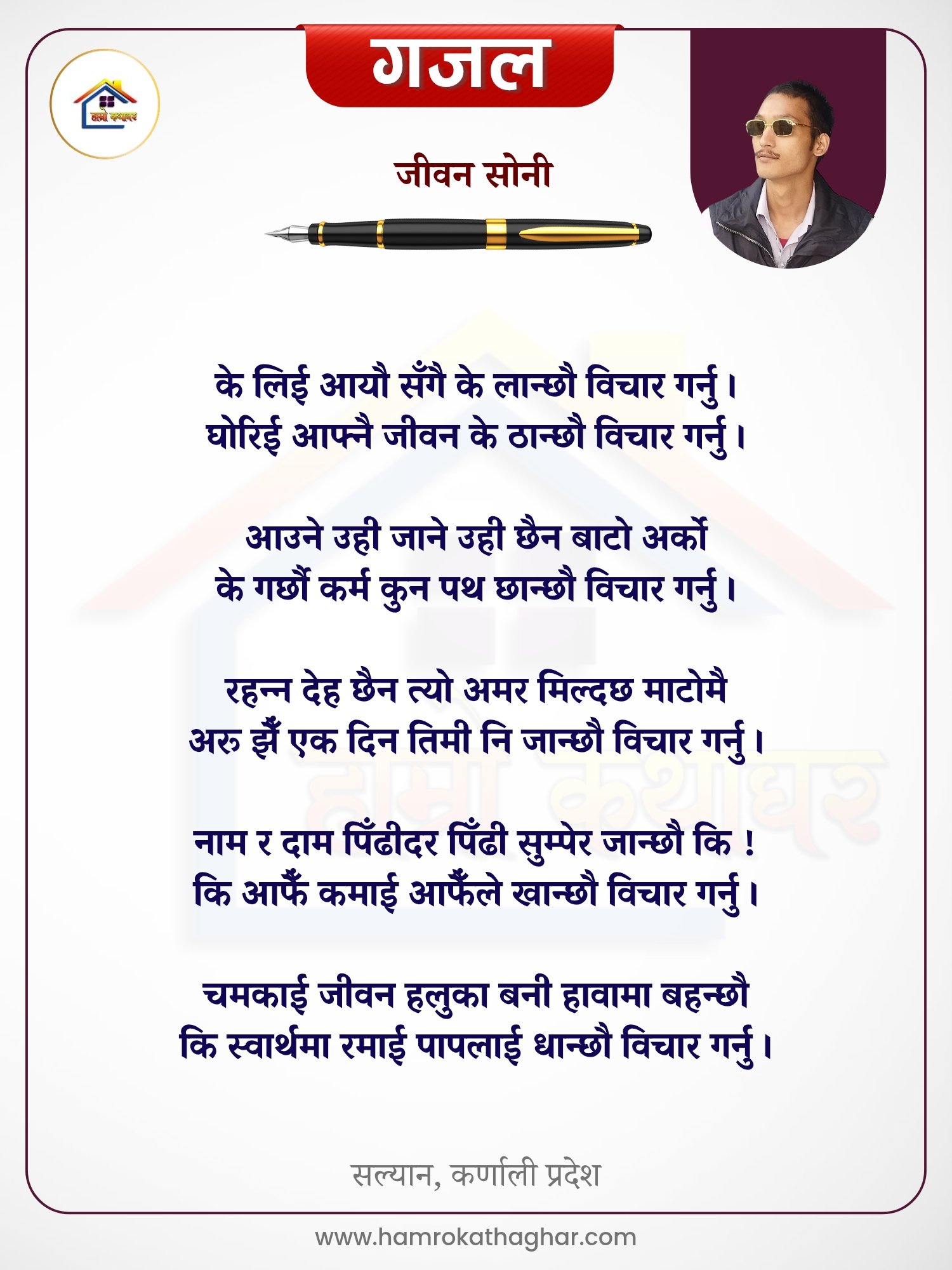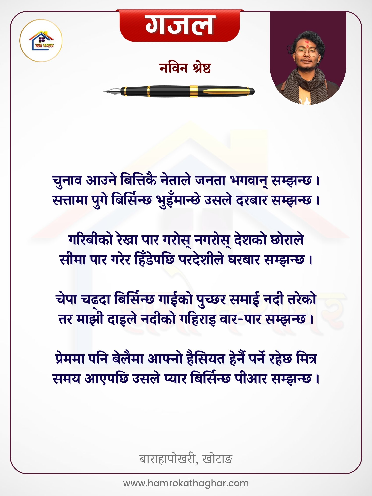 नेपाली भाषा साहित्यलाई माया गरेर यहाँसम्म आइ, यहाँ प्रकाशित लेख/रचनाहरू पढिदिनु भएकोमा तपाईँलाई धेरै धेरै धन्यवाद। तपाईँले भर्खरै माथि पढेको लेख/रचना कस्तो लाग्यो कमेन्ट बक्समा आफ्नो प्रतिक्रिया राख्न सक्नु हुनेछ। आफ्नो मनमा लागेको प्रतिक्रिया राख्न तपाईँ स्वतन्त्र हुनुहुन्छ। यदि तपाईँ पनि नेपाली भाषा साहित्यमा कलम चलाउनु हुन्छ भने आफ्नो छोटो परिचय र एक प्रति अनुहार चिनिने तस्बिर सहित आफ्ना लेख/रचनाहरू हामीलाई hamrokathaghar@gmail.com मा पठाउन सक्नु हुनेछ। अन्य कुनै पनि जानकारीका लागि +९१८७३८०९३५७३ नम्बरमा ह्वाट्सएप गर्न सक्नु हुनेछ। धन्यवाद । नोट: यहाँ प्रकाशित कुनै पनि लेख/रचनाहरू लेखकको वा 'हाम्रो कथा घर' को अनुमति बिना कुनै पनि माध्यमबाट प्रकाशन प्रसारण गर्न पाइने छैन । अन्यथा, यस्तो गरिएको पाएमा प्रचलित कानुन बमोजिम कारबाही गरिने जानकारी गराउँदछौ।