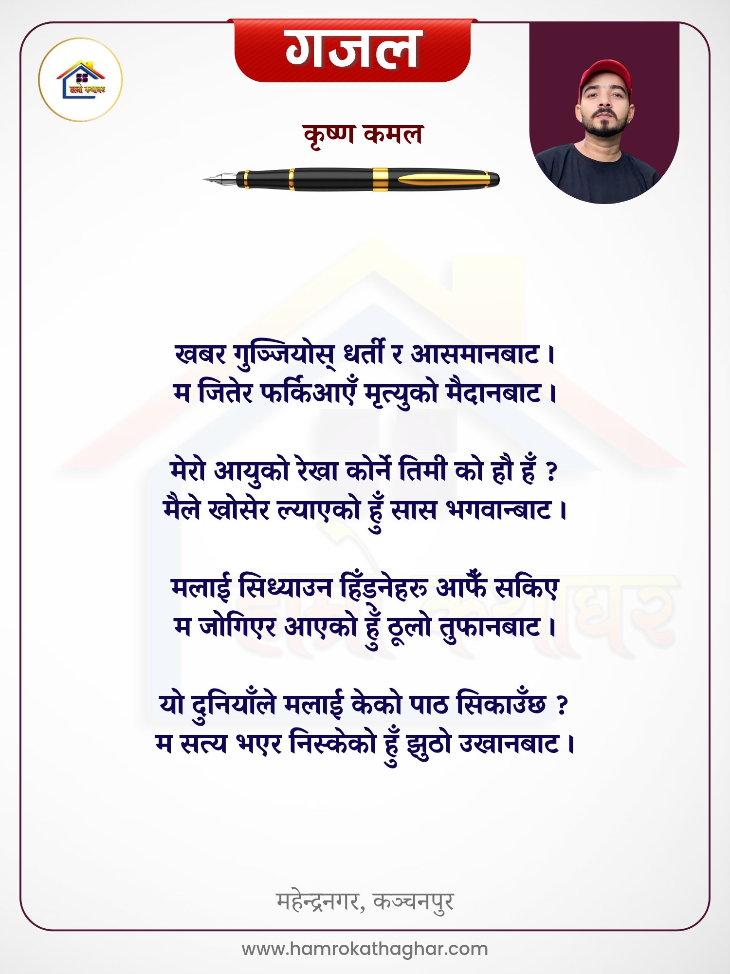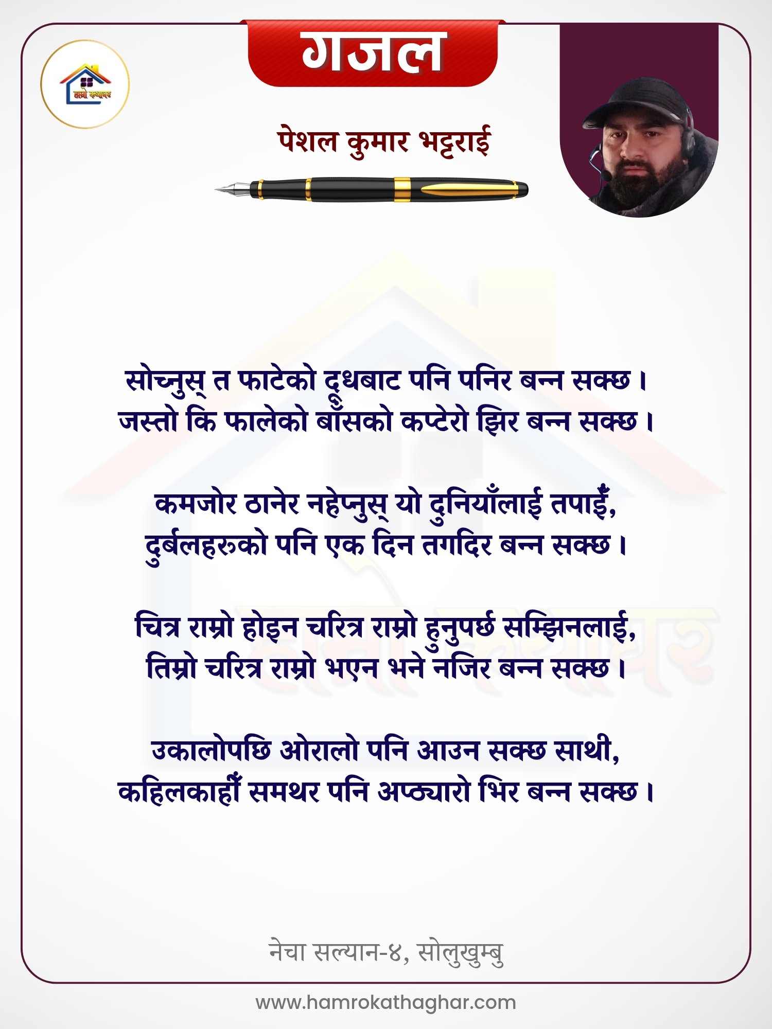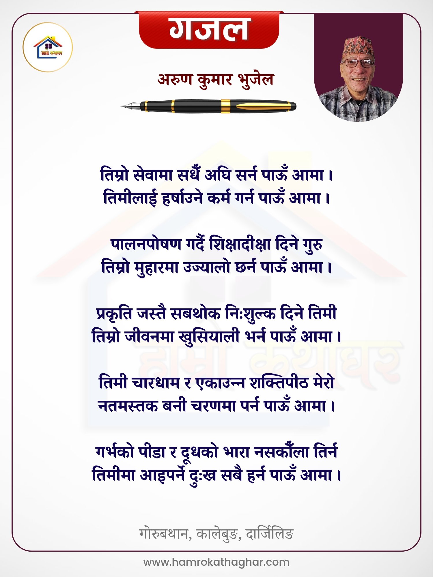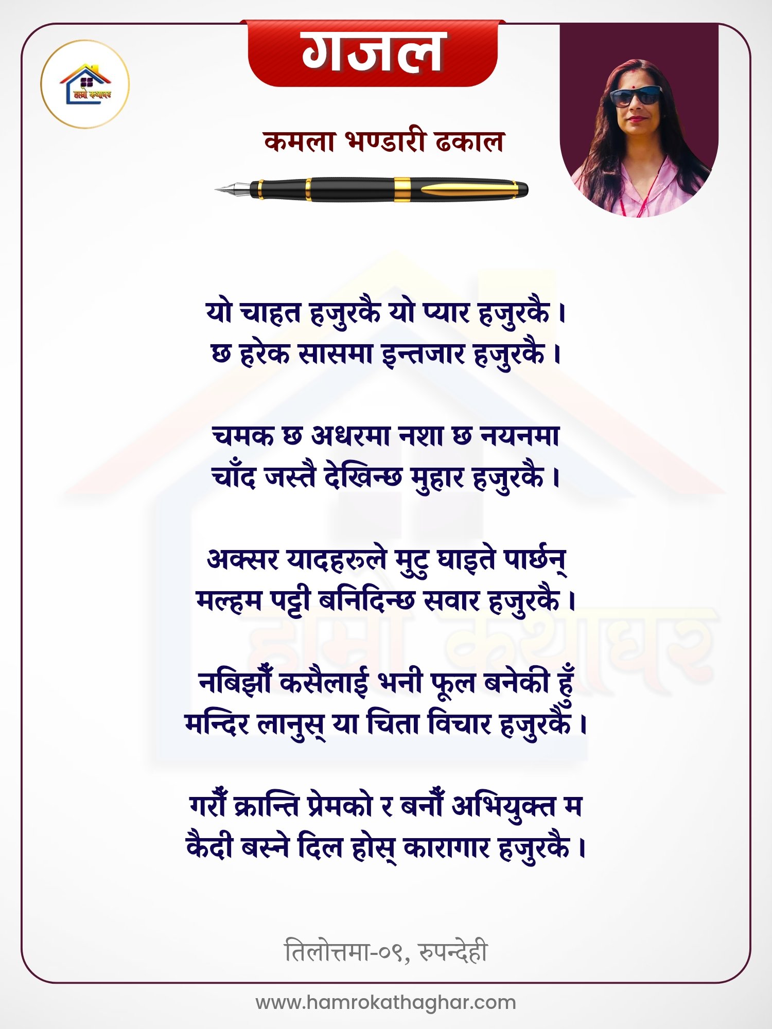 नेपाली भाषा साहित्यलाई माया गरेर यहाँसम्म आइ, यहाँ प्रकाशित लेख/रचनाहरू पढिदिनु भएकोमा तपाईँलाई धेरै धेरै धन्यवाद। तपाईँले भर्खरै माथि पढेको लेख/रचना कस्तो लाग्यो कमेन्ट बक्समा आफ्नो प्रतिक्रिया राख्न सक्नु हुनेछ। आफ्नो मनमा लागेको प्रतिक्रिया राख्न तपाईँ स्वतन्त्र हुनुहुन्छ। यदि तपाईँ पनि नेपाली भाषा साहित्यमा कलम चलाउनु हुन्छ भने आफ्नो छोटो परिचय र एक प्रति अनुहार चिनिने तस्बिर सहित आफ्ना लेख/रचनाहरू हामीलाई hamrokathaghar@gmail.com मा पठाउन सक्नु हुनेछ। अन्य कुनै पनि जानकारीका लागि +९१८७३८०९३५७३ नम्बरमा ह्वाट्सएप गर्न सक्नु हुनेछ। धन्यवाद । नोट: यहाँ प्रकाशित कुनै पनि लेख/रचनाहरू लेखकको वा 'हाम्रो कथा घर' को अनुमति बिना कुनै पनि माध्यमबाट प्रकाशन प्रसारण गर्न पाइने छैन । अन्यथा, यस्तो गरिएको पाएमा प्रचलित कानुन बमोजिम कारबाही गरिने जानकारी गराउँदछौ।