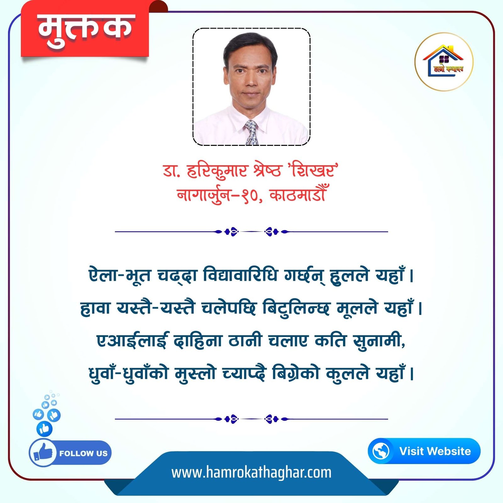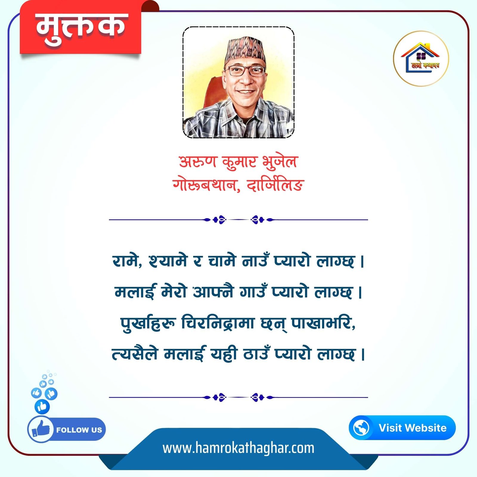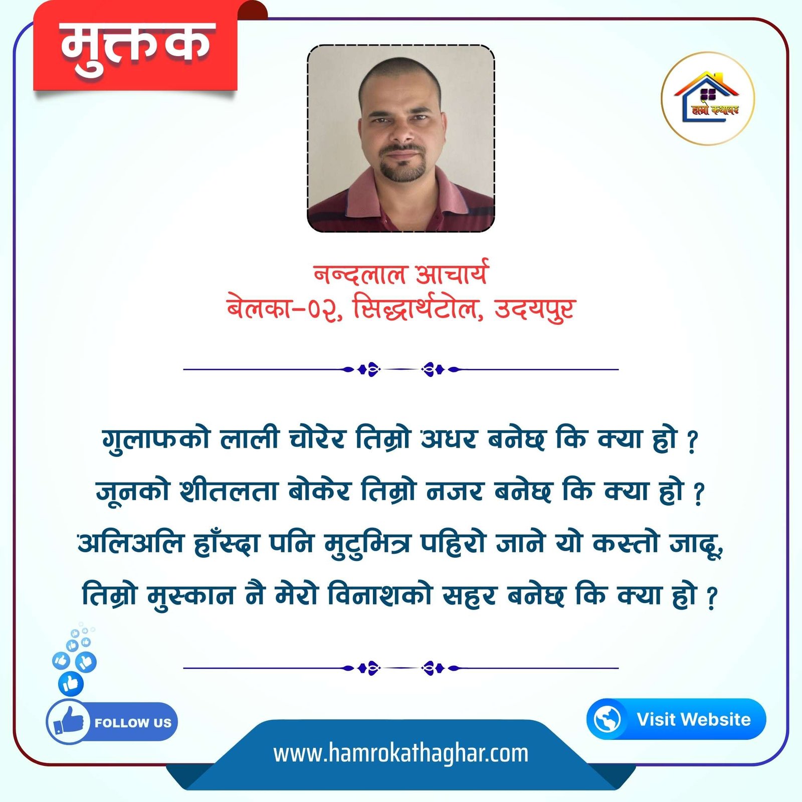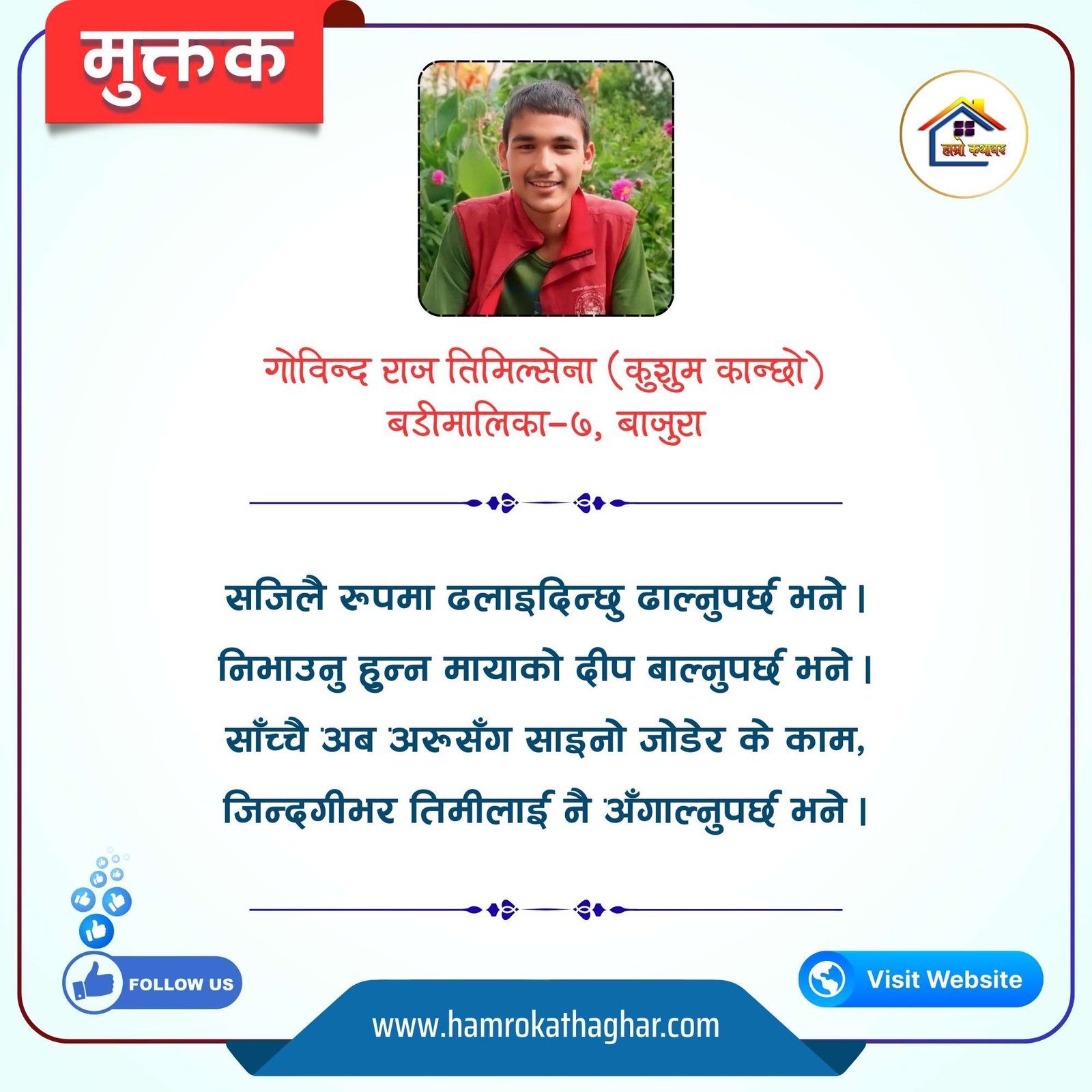 नेपाली भाषा साहित्यलाई माया गरेर यहाँसम्म आइ, यहाँ प्रकाशित लेख/रचनाहरू पढिदिनु भएकोमा तपाईँलाई धेरै धेरै धन्यवाद। तपाईँले भर्खरै माथि पढेको लेख/रचना कस्तो लाग्यो कमेन्ट बक्समा आफ्नो प्रतिक्रिया राख्न सक्नु हुनेछ। आफ्नो मनमा लागेको प्रतिक्रिया राख्न तपाईँ स्वतन्त्र हुनुहुन्छ। यदि तपाईँ पनि नेपाली भाषा साहित्यमा कलम चलाउनु हुन्छ भने आफ्नो छोटो परिचय र एक प्रति अनुहार चिनिने तस्बिर सहित आफ्ना लेख/रचनाहरू हामीलाई hamrokathaghar@gmail.com मा पठाउन सक्नु हुनेछ। अन्य कुनै पनि जानकारीका लागि +९१८७३८०९३५७३ नम्बरमा ह्वाट्सएप गर्न सक्नु हुनेछ। धन्यवाद । नोट: यहाँ प्रकाशित कुनै पनि लेख/रचनाहरू लेखकको वा 'हाम्रो कथा घर' को अनुमति बिना कुनै पनि माध्यमबाट प्रकाशन प्रसारण गर्न पाइने छैन । अन्यथा, यस्तो गरिएको पाएमा प्रचलित कानुन बमोजिम कारबाही गरिने जानकारी गराउँदछौ।