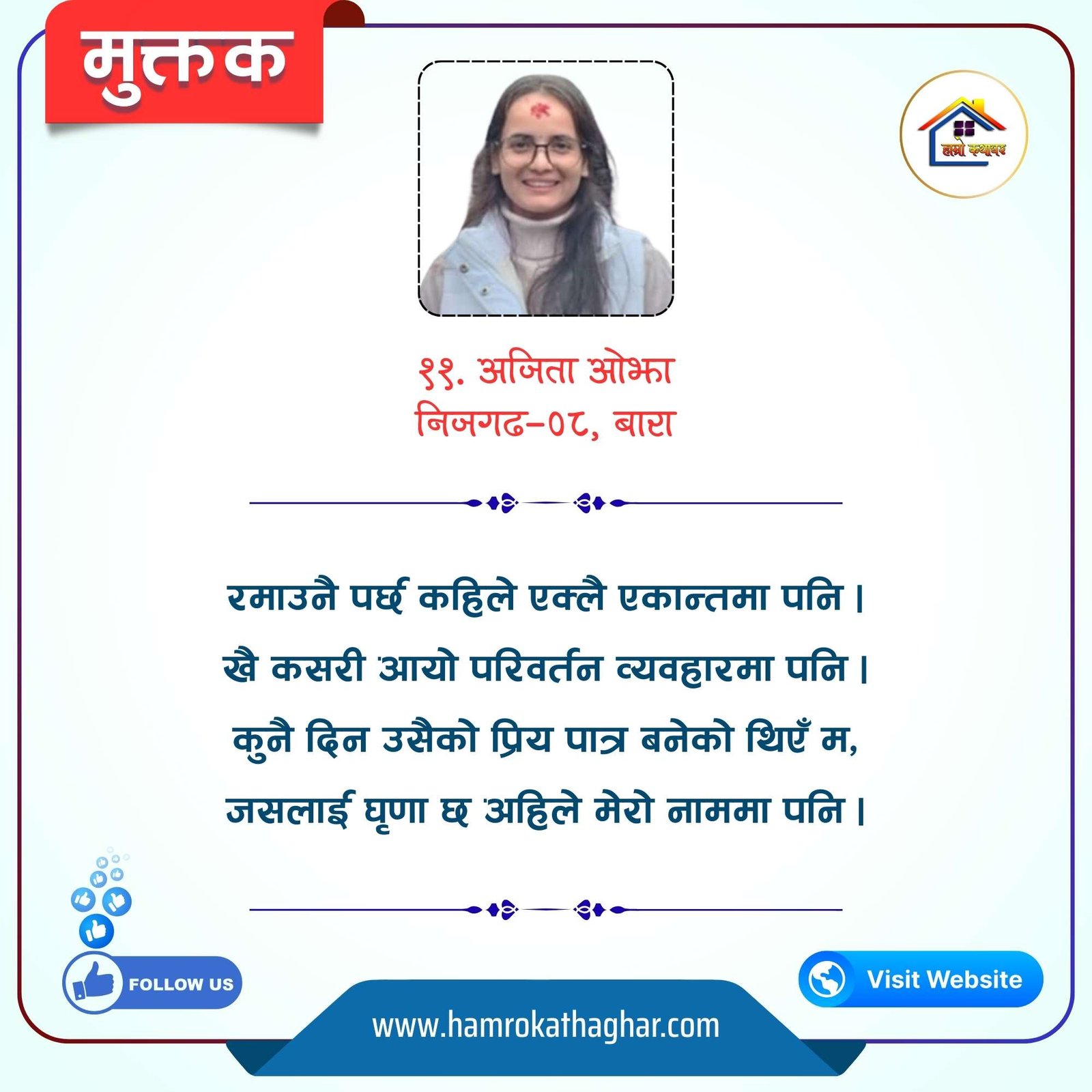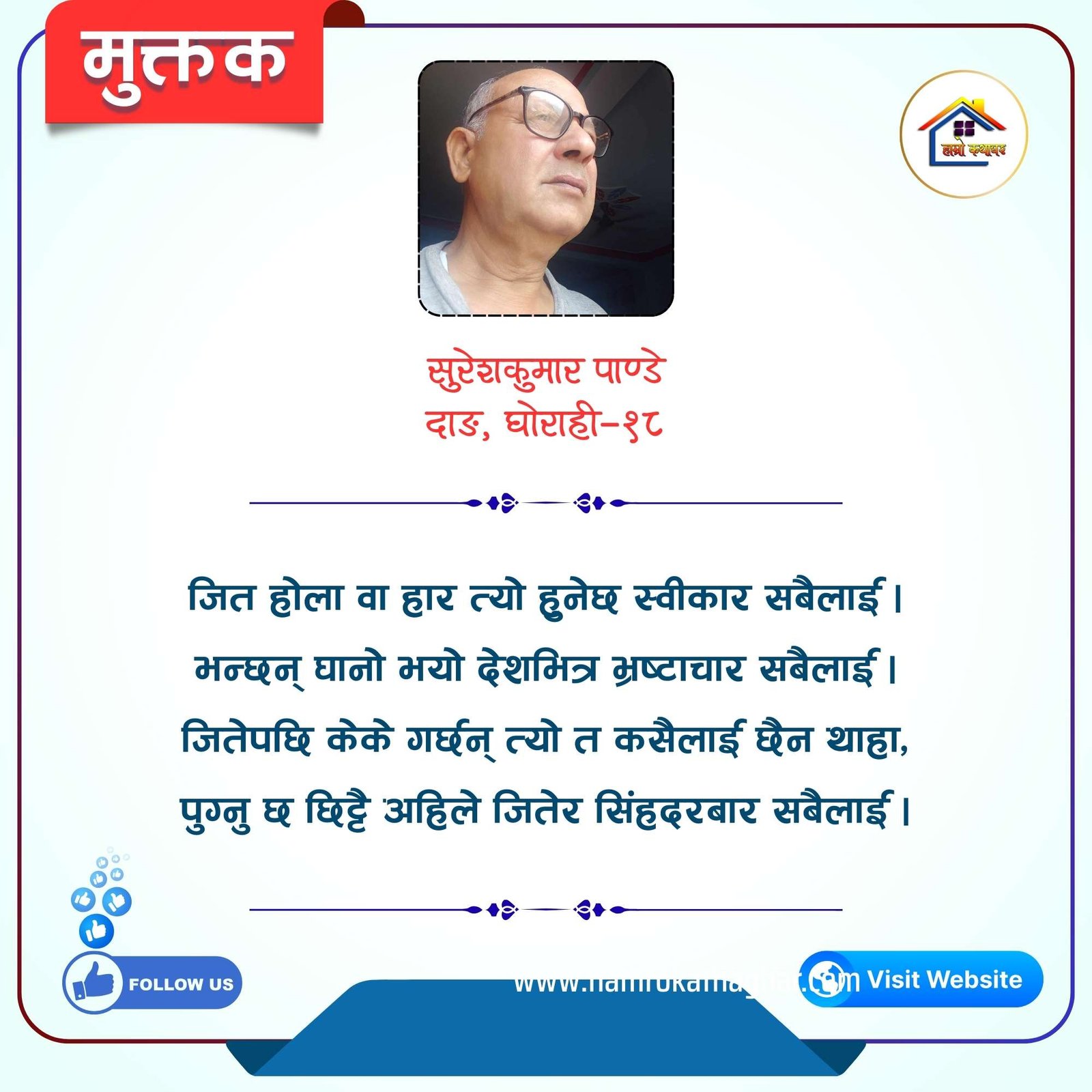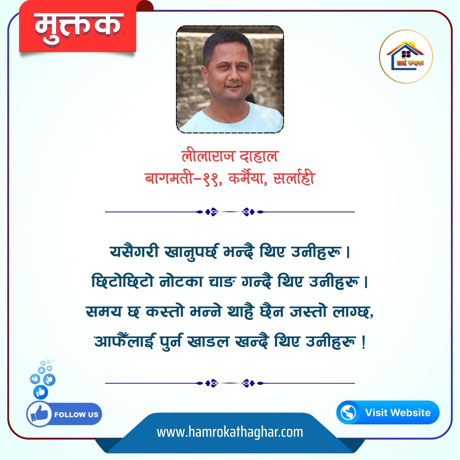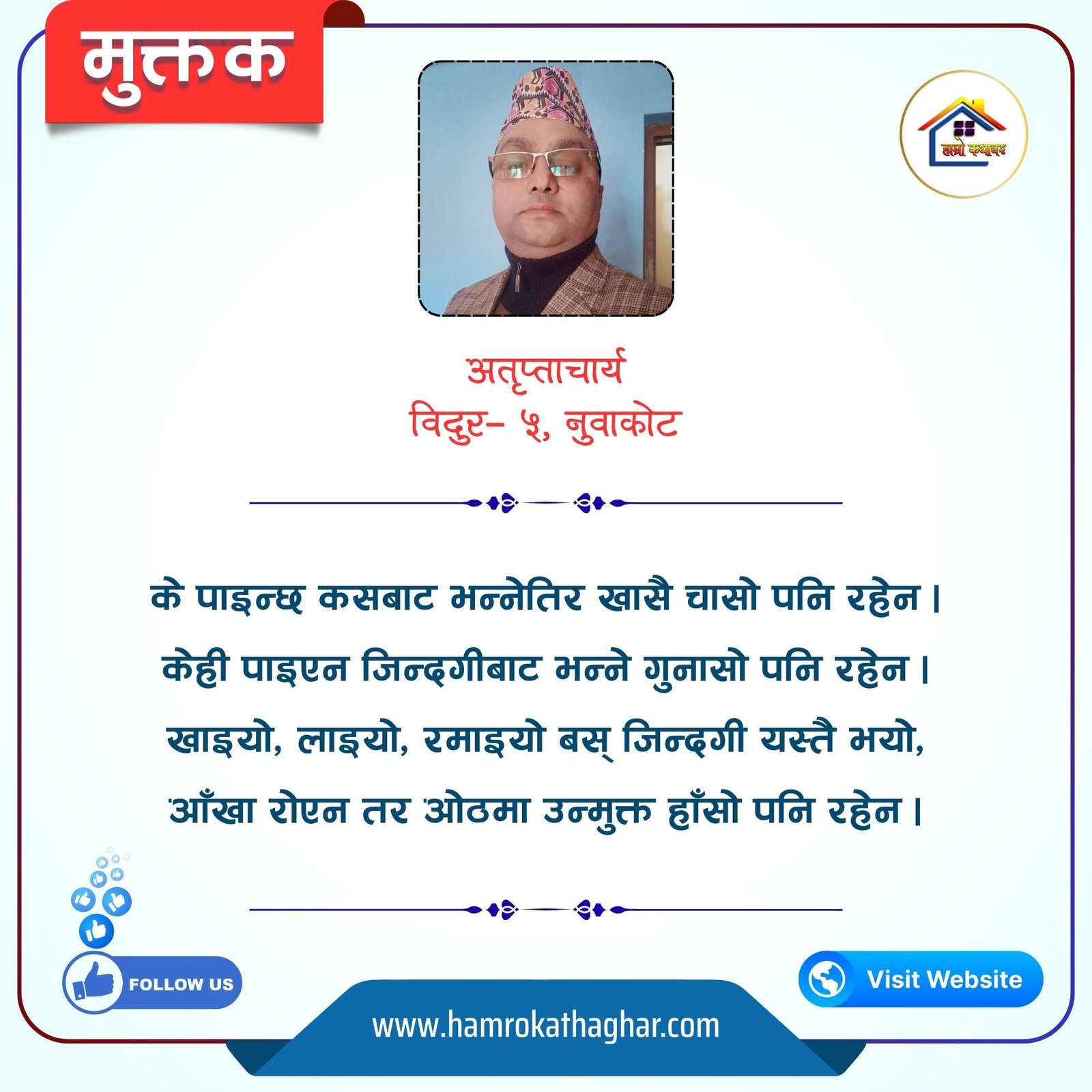 नेपाली भाषा साहित्यलाई माया गरेर यहाँसम्म आइ, यहाँ प्रकाशित लेख/रचनाहरू पढिदिनु भएकोमा तपाईँलाई धेरै धेरै धन्यवाद। तपाईँले भर्खरै माथि पढेको लेख/रचना कस्तो लाग्यो कमेन्ट बक्समा आफ्नो प्रतिक्रिया राख्न सक्नु हुनेछ। आफ्नो मनमा लागेको प्रतिक्रिया राख्न तपाईँ स्वतन्त्र हुनुहुन्छ। यदि तपाईँ पनि नेपाली भाषा साहित्यमा कलम चलाउनु हुन्छ भने आफ्नो छोटो परिचय र एक प्रति अनुहार चिनिने तस्बिर सहित आफ्ना लेख/रचनाहरू हामीलाई hamrokathaghar@gmail.com मा पठाउन सक्नु हुनेछ। अन्य कुनै पनि जानकारीका लागि +९१८७३८०९३५७३ नम्बरमा ह्वाट्सएप गर्न सक्नु हुनेछ। धन्यवाद । नोट: यहाँ प्रकाशित कुनै पनि लेख/रचनाहरू लेखकको वा 'हाम्रो कथा घर' को अनुमति बिना कुनै पनि माध्यमबाट प्रकाशन प्रसारण गर्न पाइने छैन । अन्यथा, यस्तो गरिएको पाएमा प्रचलित कानुन बमोजिम कारबाही गरिने जानकारी गराउँदछौ।