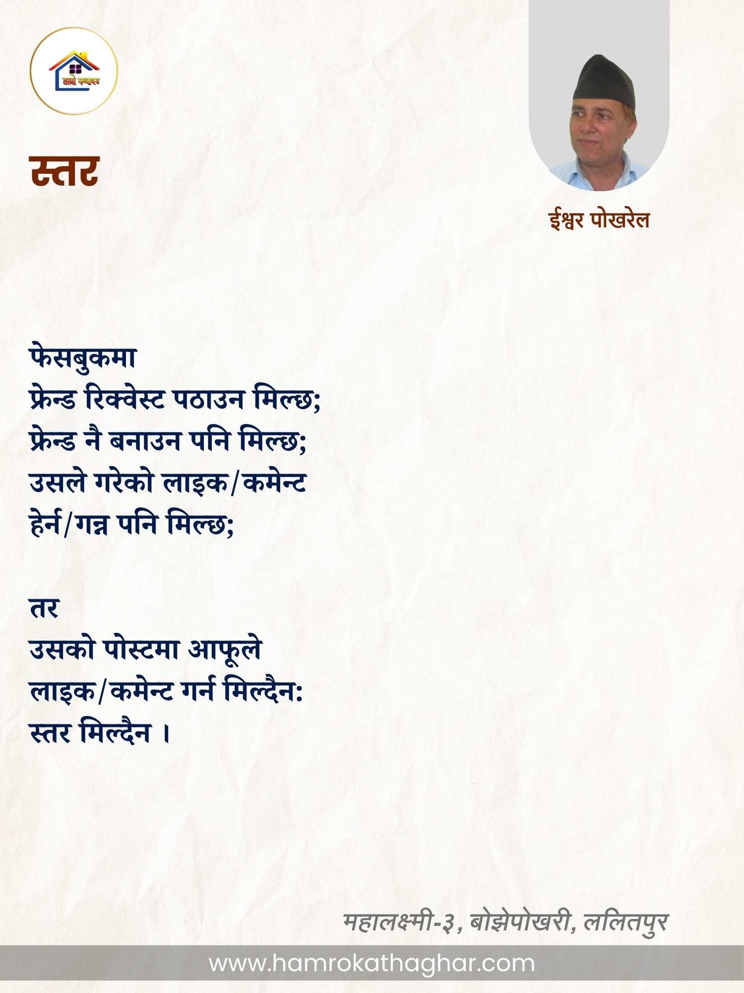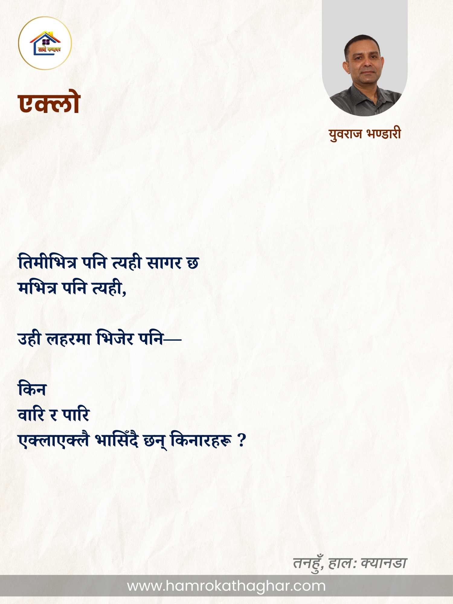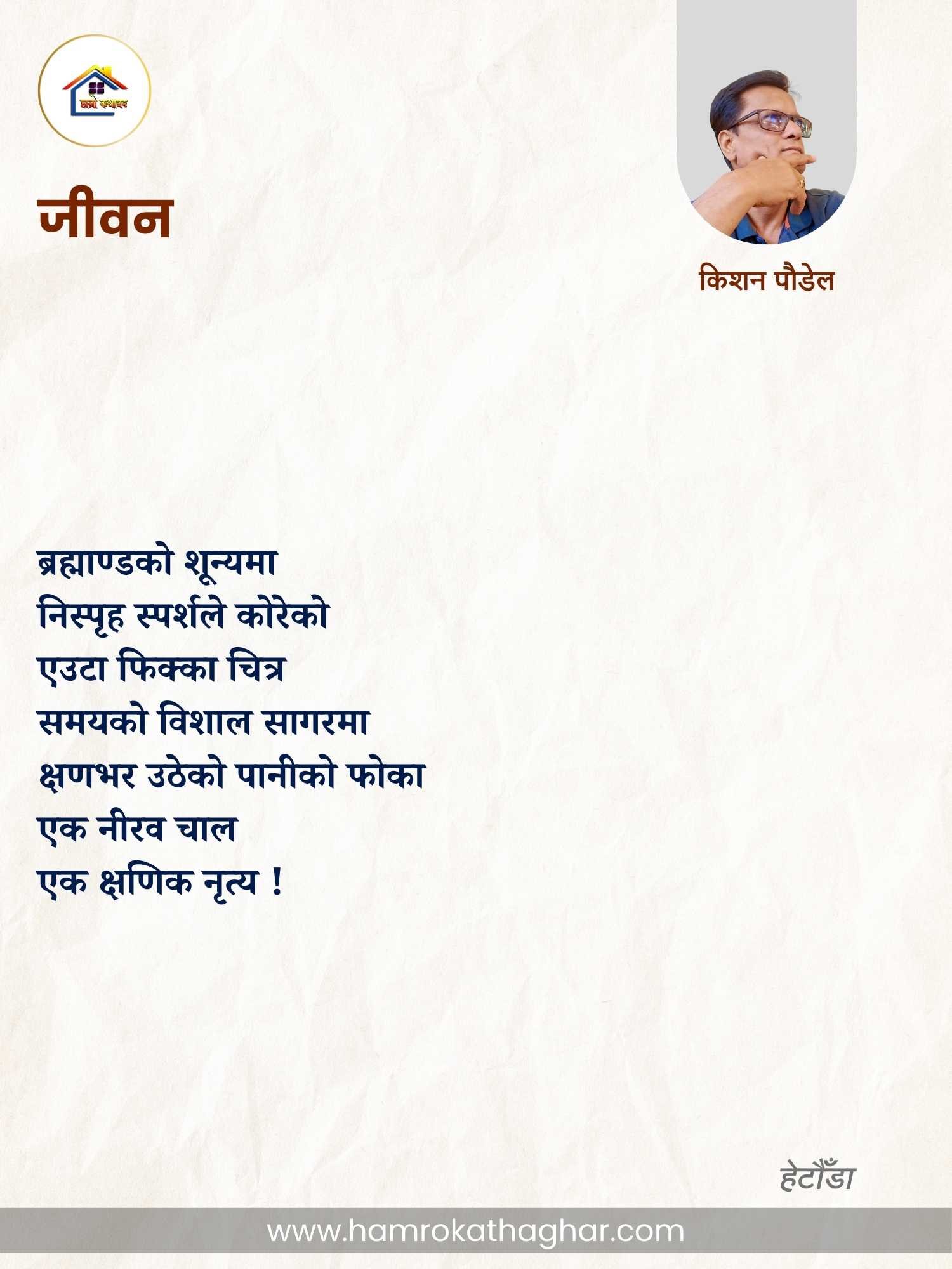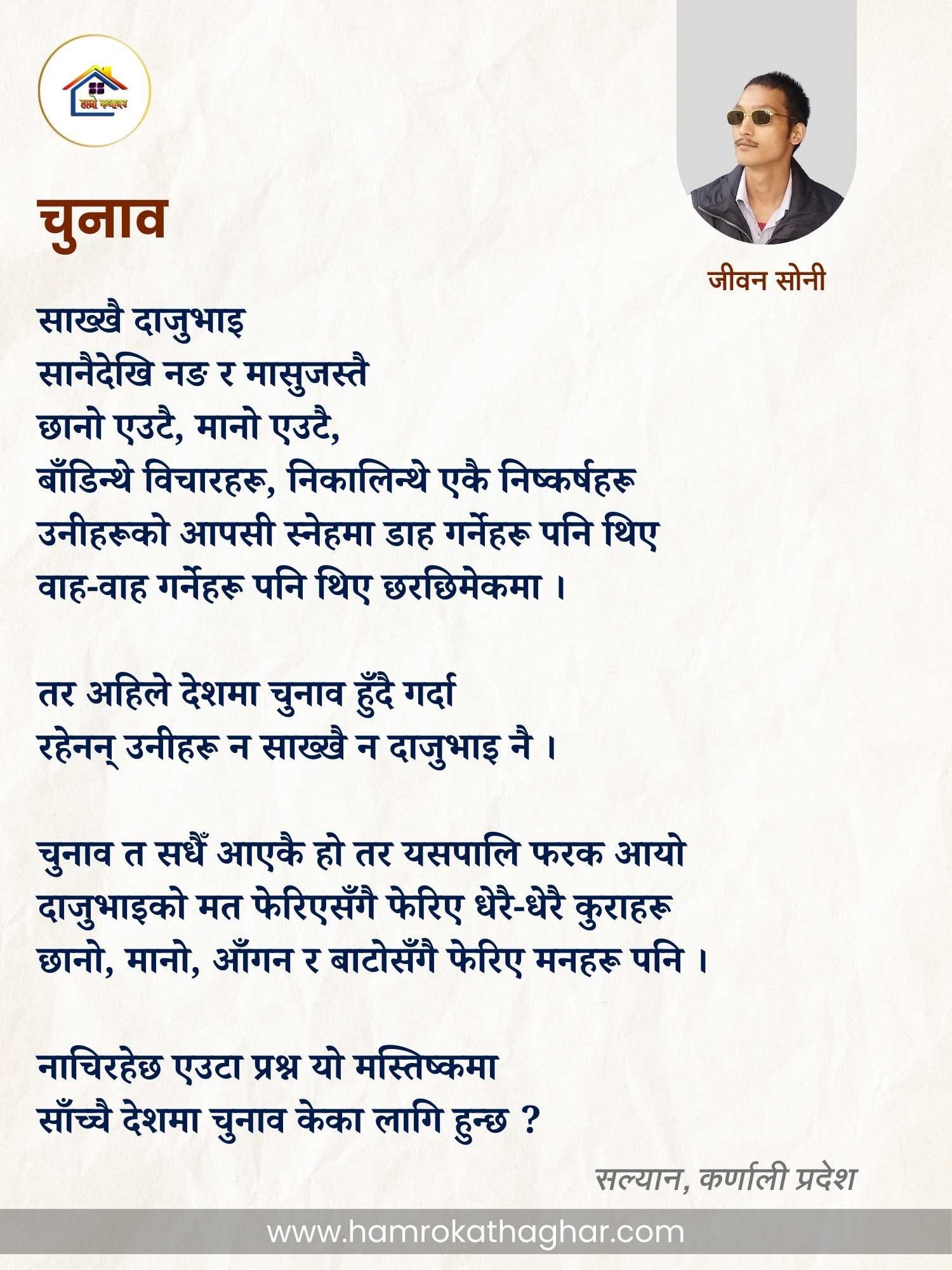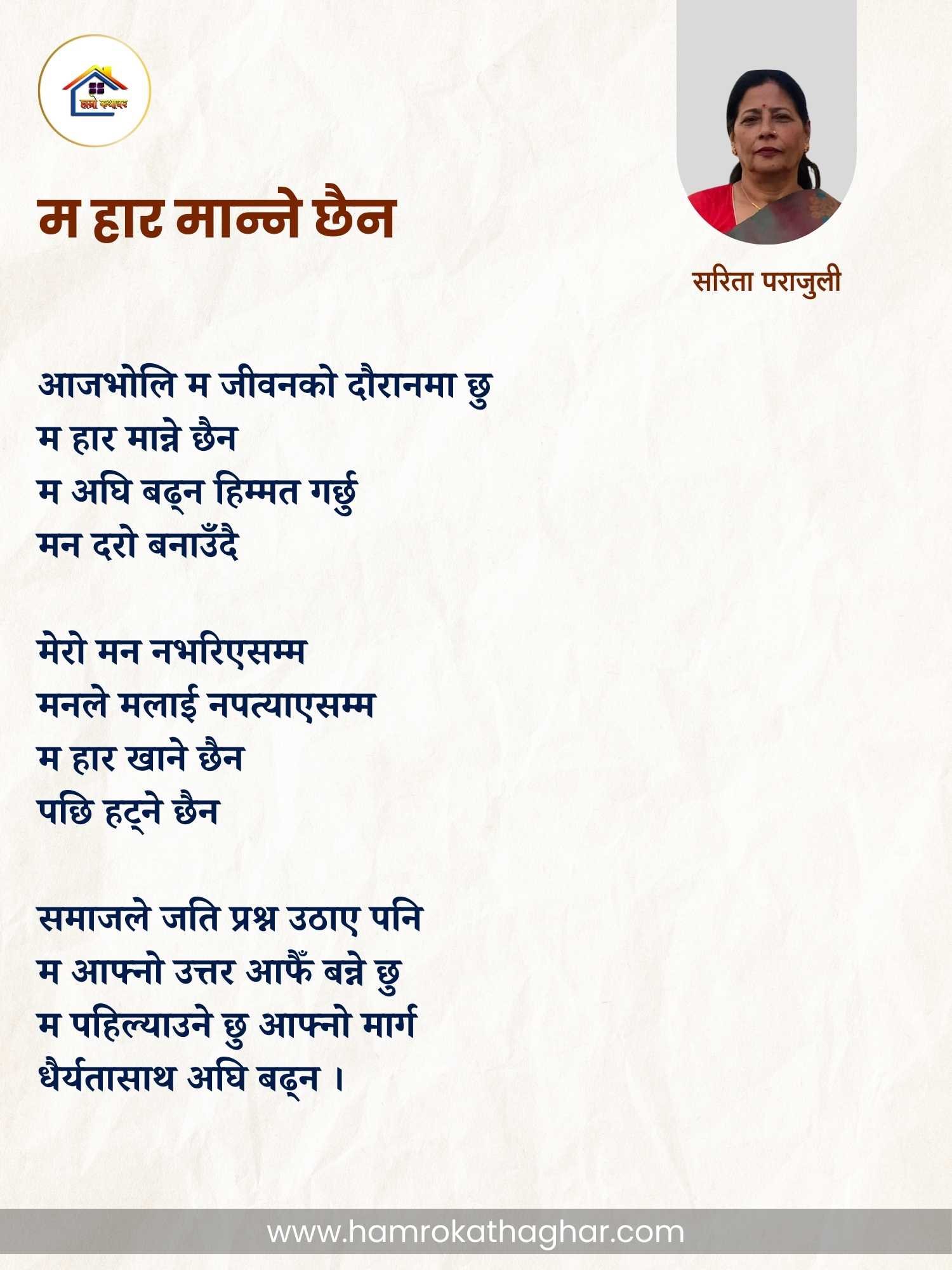 नेपाली भाषा साहित्यलाई माया गरेर यहाँसम्म आइ, यहाँ प्रकाशित लेख/रचनाहरू पढिदिनु भएकोमा तपाईँलाई धेरै धेरै धन्यवाद। तपाईँले भर्खरै माथि पढेको लेख/रचना कस्तो लाग्यो कमेन्ट बक्समा आफ्नो प्रतिक्रिया राख्न सक्नु हुनेछ। आफ्नो मनमा लागेको प्रतिक्रिया राख्न तपाईँ स्वतन्त्र हुनुहुन्छ। यदि तपाईँ पनि नेपाली भाषा साहित्यमा कलम चलाउनु हुन्छ भने आफ्नो छोटो परिचय र एक प्रति अनुहार चिनिने तस्बिर सहित आफ्ना लेख/रचनाहरू हामीलाई hamrokathaghar@gmail.com मा पठाउन सक्नु हुनेछ। अन्य कुनै पनि जानकारीका लागि +९१८७३८०९३५७३ नम्बरमा ह्वाट्सएप गर्न सक्नु हुनेछ। धन्यवाद । नोट: यहाँ प्रकाशित कुनै पनि लेख/रचनाहरू लेखकको वा 'हाम्रो कथा घर' को अनुमति बिना कुनै पनि माध्यमबाट प्रकाशन प्रसारण गर्न पाइने छैन । अन्यथा, यस्तो गरिएको पाएमा प्रचलित कानुन बमोजिम कारबाही गरिने जानकारी गराउँदछौ।