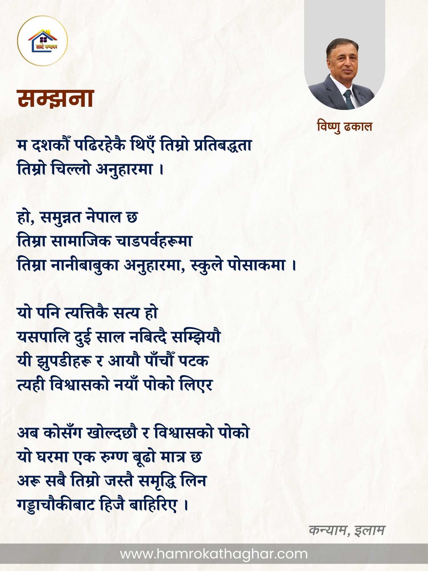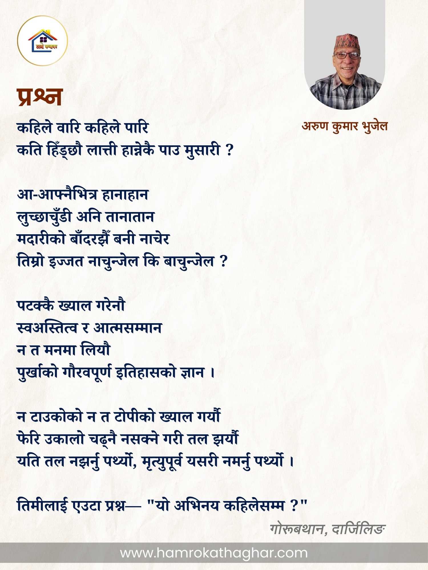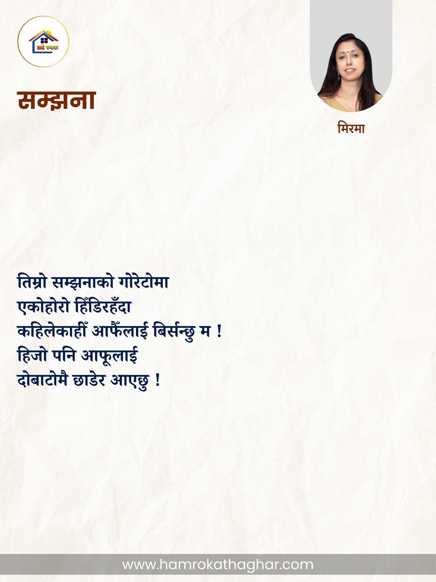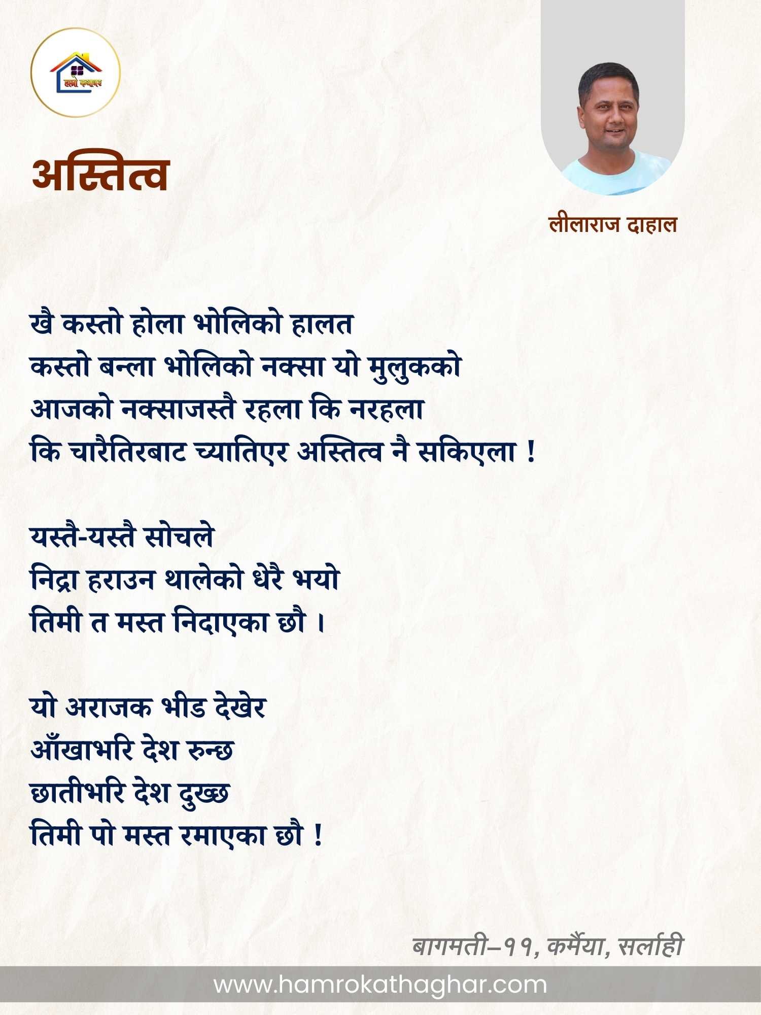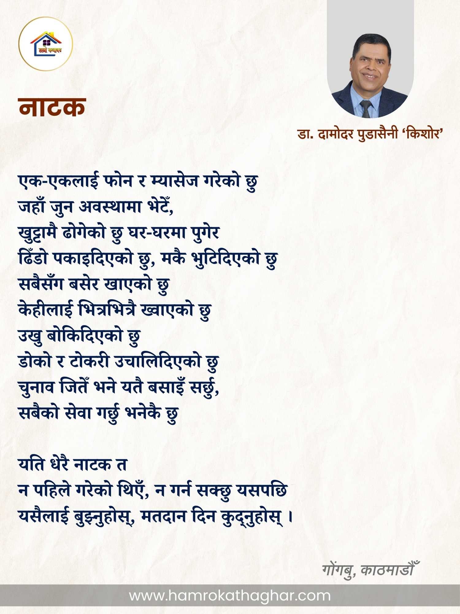 नेपाली भाषा साहित्यलाई माया गरेर यहाँसम्म आइ, यहाँ प्रकाशित लेख/रचनाहरू पढिदिनु भएकोमा तपाईँलाई धेरै धेरै धन्यवाद। तपाईँले भर्खरै माथि पढेको लेख/रचना कस्तो लाग्यो कमेन्ट बक्समा आफ्नो प्रतिक्रिया राख्न सक्नु हुनेछ। आफ्नो मनमा लागेको प्रतिक्रिया राख्न तपाईँ स्वतन्त्र हुनुहुन्छ। यदि तपाईँ पनि नेपाली भाषा साहित्यमा कलम चलाउनु हुन्छ भने आफ्नो छोटो परिचय र एक प्रति अनुहार चिनिने तस्बिर सहित आफ्ना लेख/रचनाहरू हामीलाई hamrokathaghar@gmail.com मा पठाउन सक्नु हुनेछ। अन्य कुनै पनि जानकारीका लागि +९१८७३८०९३५७३ नम्बरमा ह्वाट्सएप गर्न सक्नु हुनेछ। धन्यवाद । नोट: यहाँ प्रकाशित कुनै पनि लेख/रचनाहरू लेखकको वा 'हाम्रो कथा घर' को अनुमति बिना कुनै पनि माध्यमबाट प्रकाशन प्रसारण गर्न पाइने छैन । अन्यथा, यस्तो गरिएको पाएमा प्रचलित कानुन बमोजिम कारबाही गरिने जानकारी गराउँदछौ।