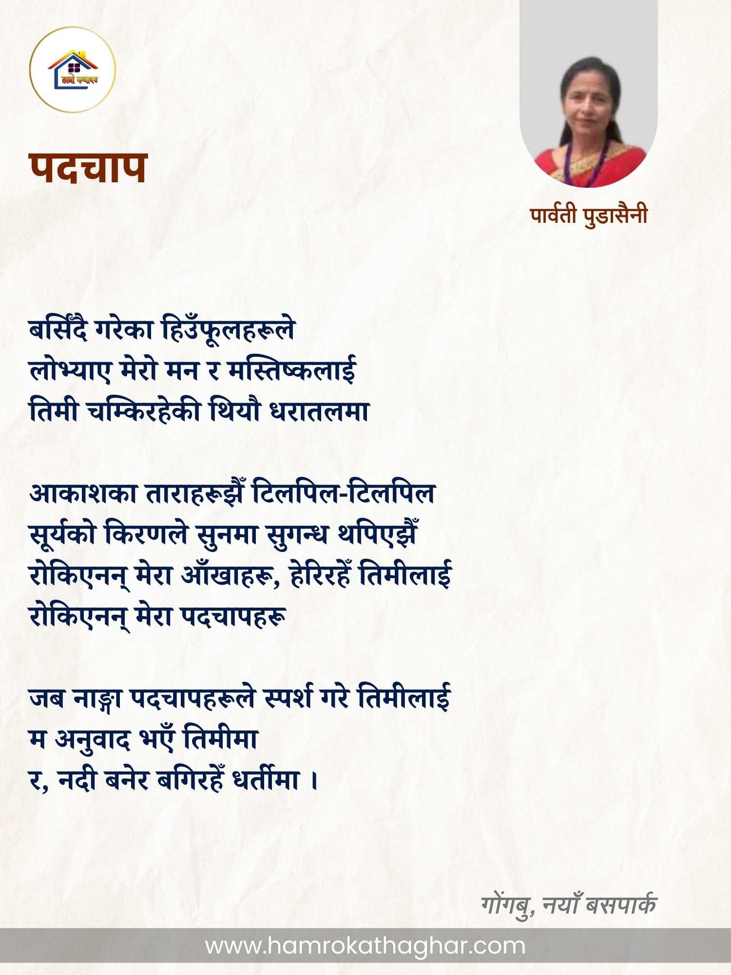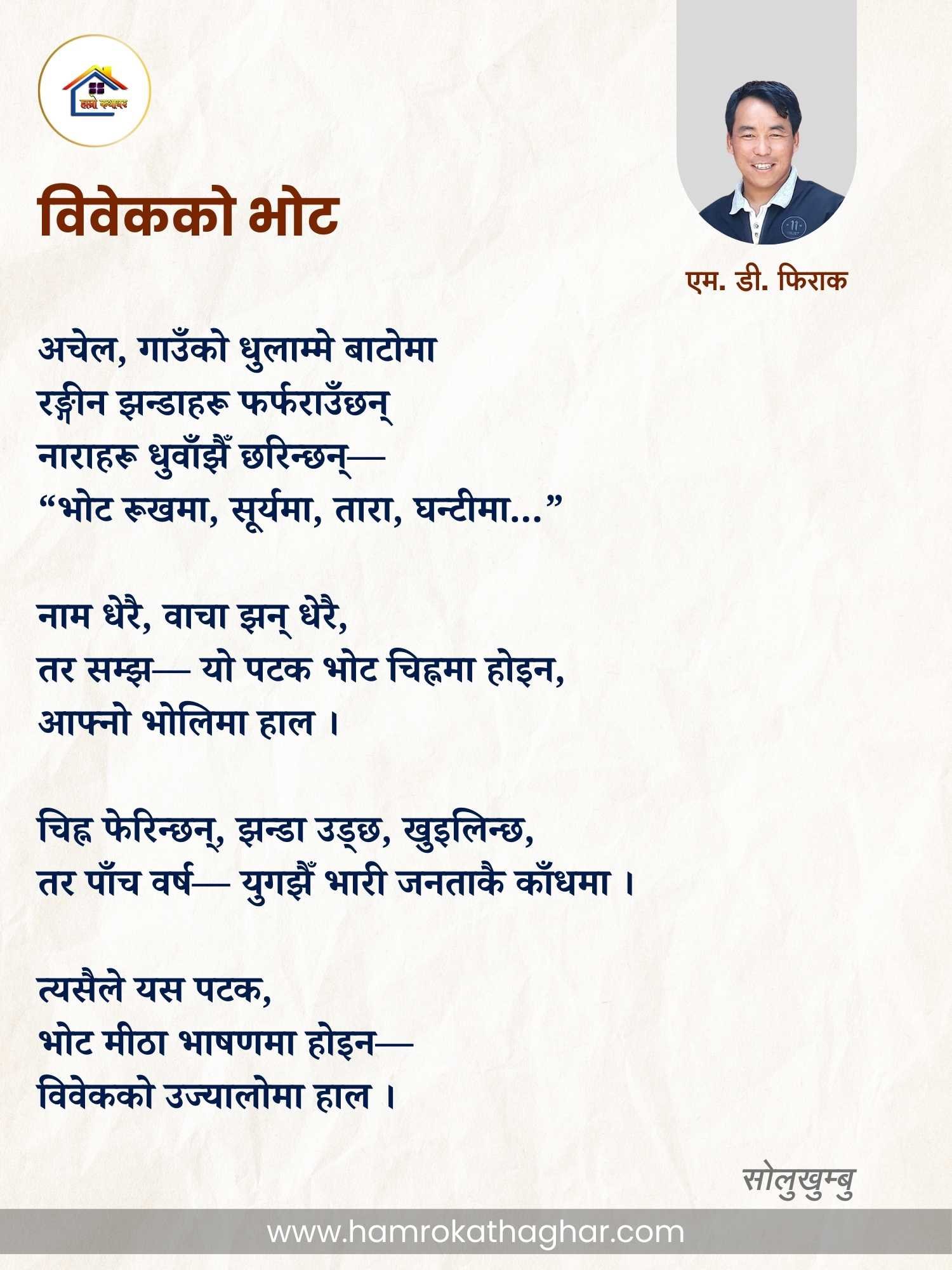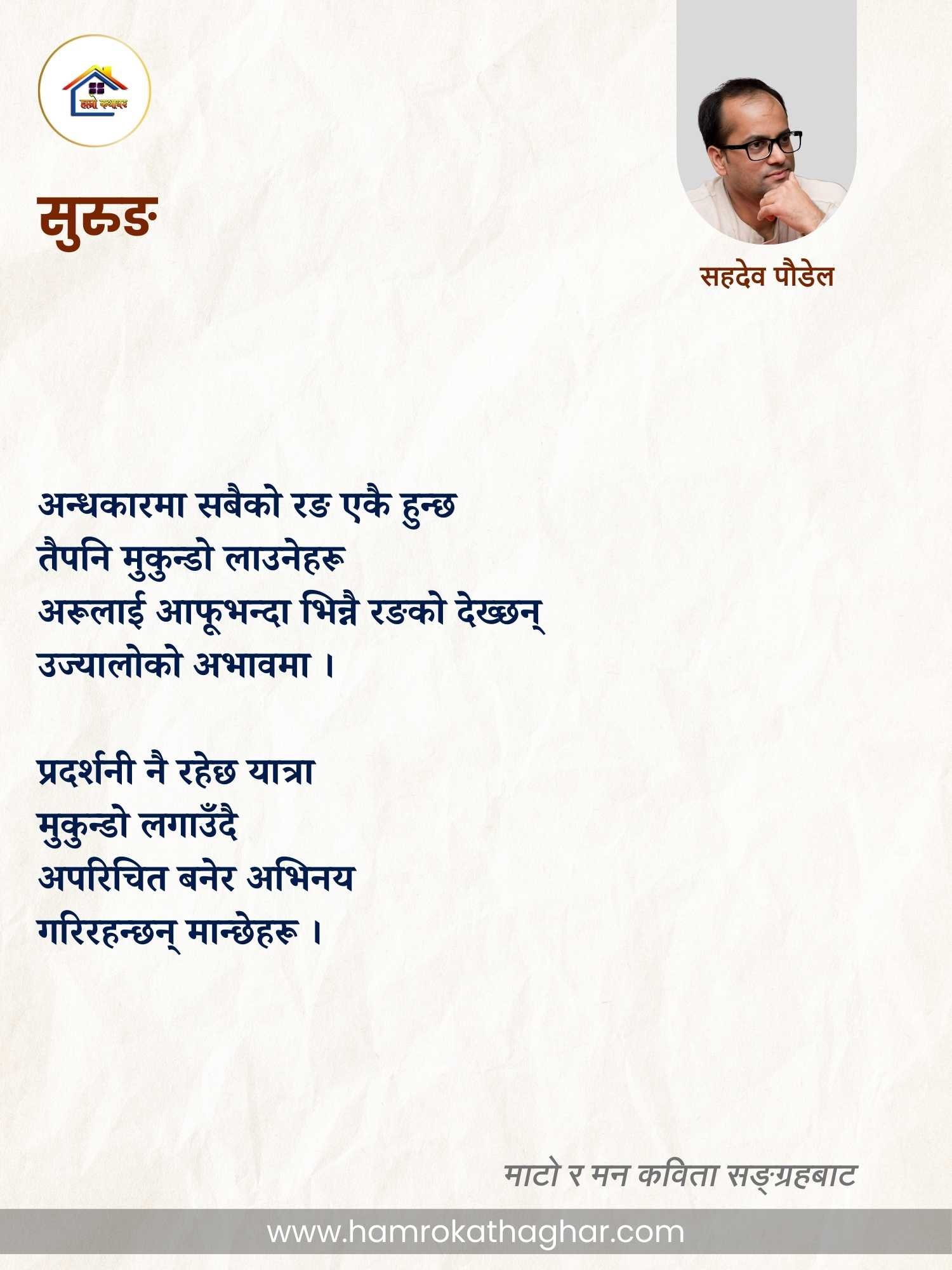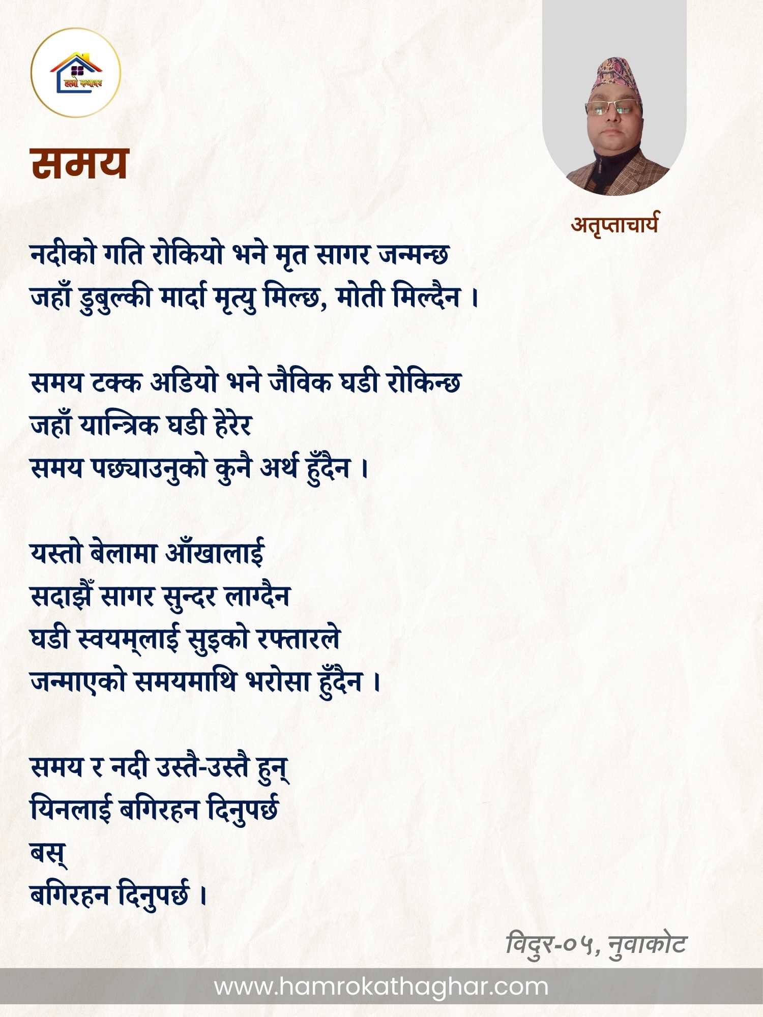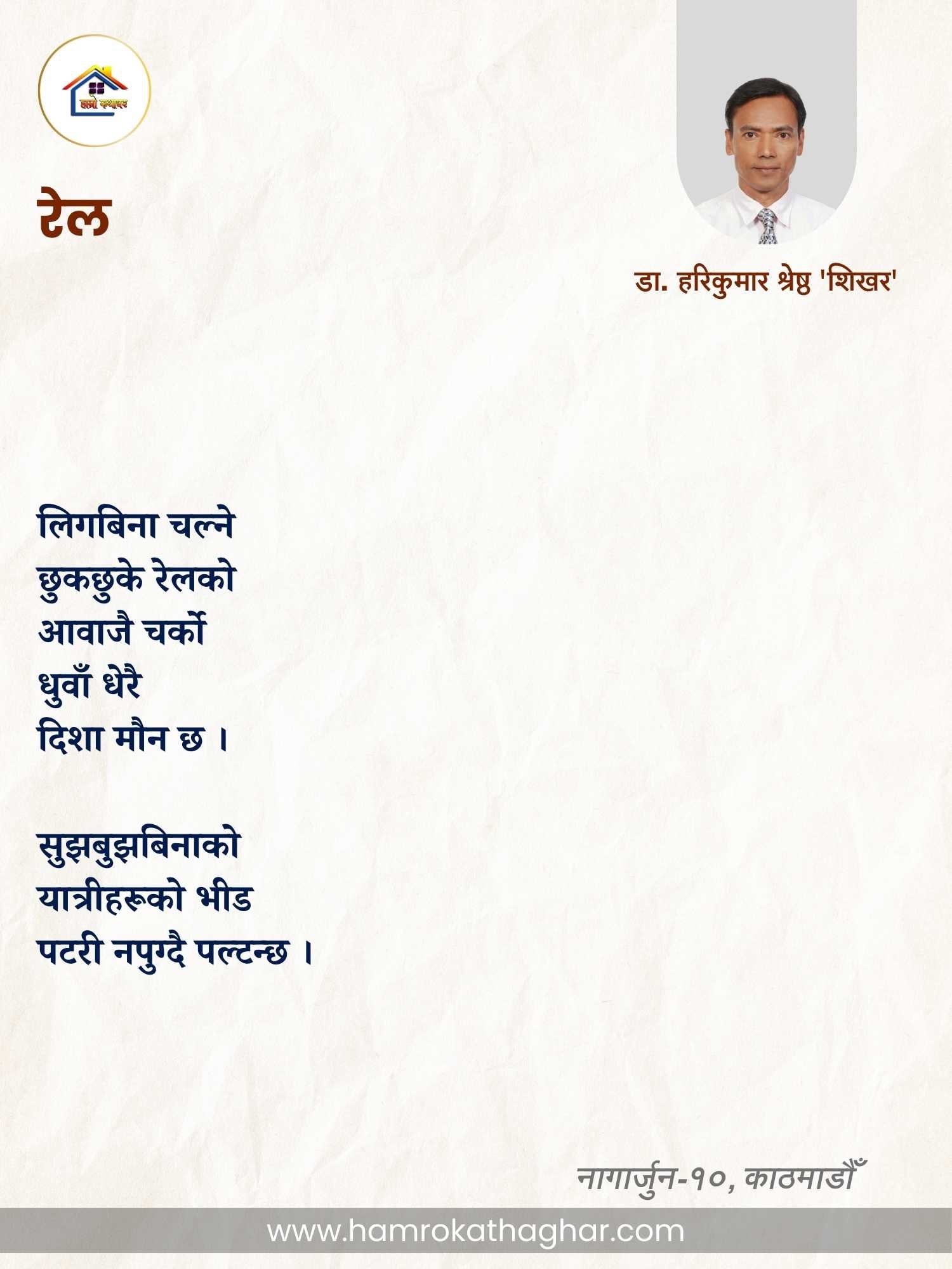 नेपाली भाषा साहित्यलाई माया गरेर यहाँसम्म आइ, यहाँ प्रकाशित लेख/रचनाहरू पढिदिनु भएकोमा तपाईँलाई धेरै धेरै धन्यवाद। तपाईँले भर्खरै माथि पढेको लेख/रचना कस्तो लाग्यो कमेन्ट बक्समा आफ्नो प्रतिक्रिया राख्न सक्नु हुनेछ। आफ्नो मनमा लागेको प्रतिक्रिया राख्न तपाईँ स्वतन्त्र हुनुहुन्छ। यदि तपाईँ पनि नेपाली भाषा साहित्यमा कलम चलाउनु हुन्छ भने आफ्नो छोटो परिचय र एक प्रति अनुहार चिनिने तस्बिर सहित आफ्ना लेख/रचनाहरू हामीलाई hamrokathaghar@gmail.com मा पठाउन सक्नु हुनेछ। अन्य कुनै पनि जानकारीका लागि +९१८७३८०९३५७३ नम्बरमा ह्वाट्सएप गर्न सक्नु हुनेछ। धन्यवाद । नोट: यहाँ प्रकाशित कुनै पनि लेख/रचनाहरू लेखकको वा 'हाम्रो कथा घर' को अनुमति बिना कुनै पनि माध्यमबाट प्रकाशन प्रसारण गर्न पाइने छैन । अन्यथा, यस्तो गरिएको पाएमा प्रचलित कानुन बमोजिम कारबाही गरिने जानकारी गराउँदछौ।