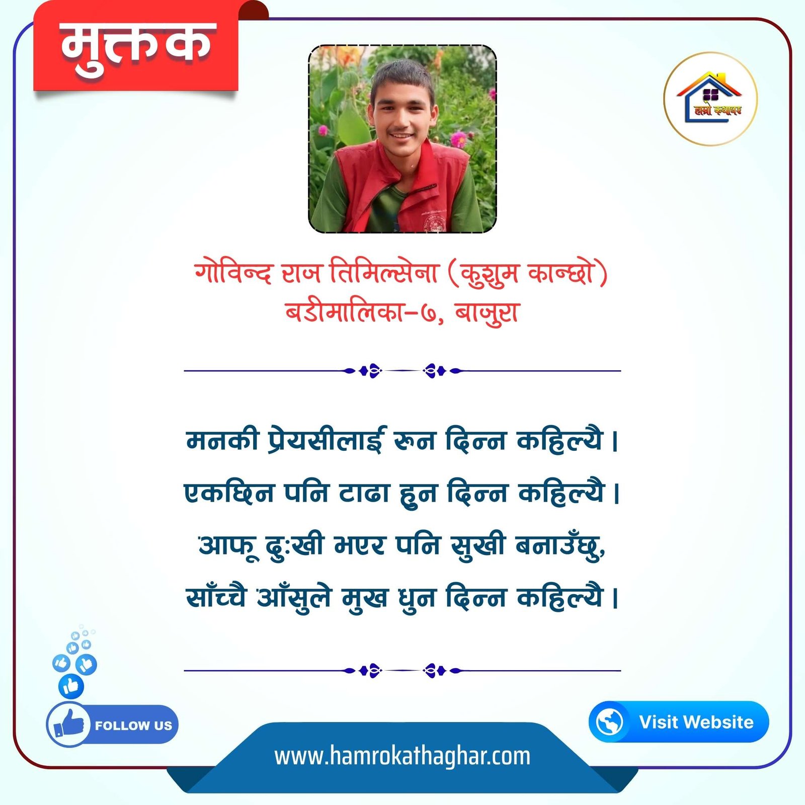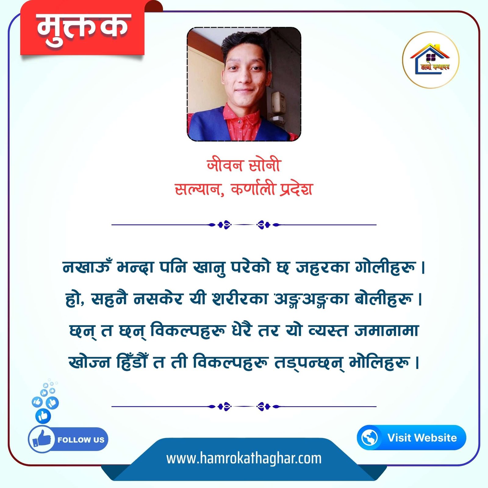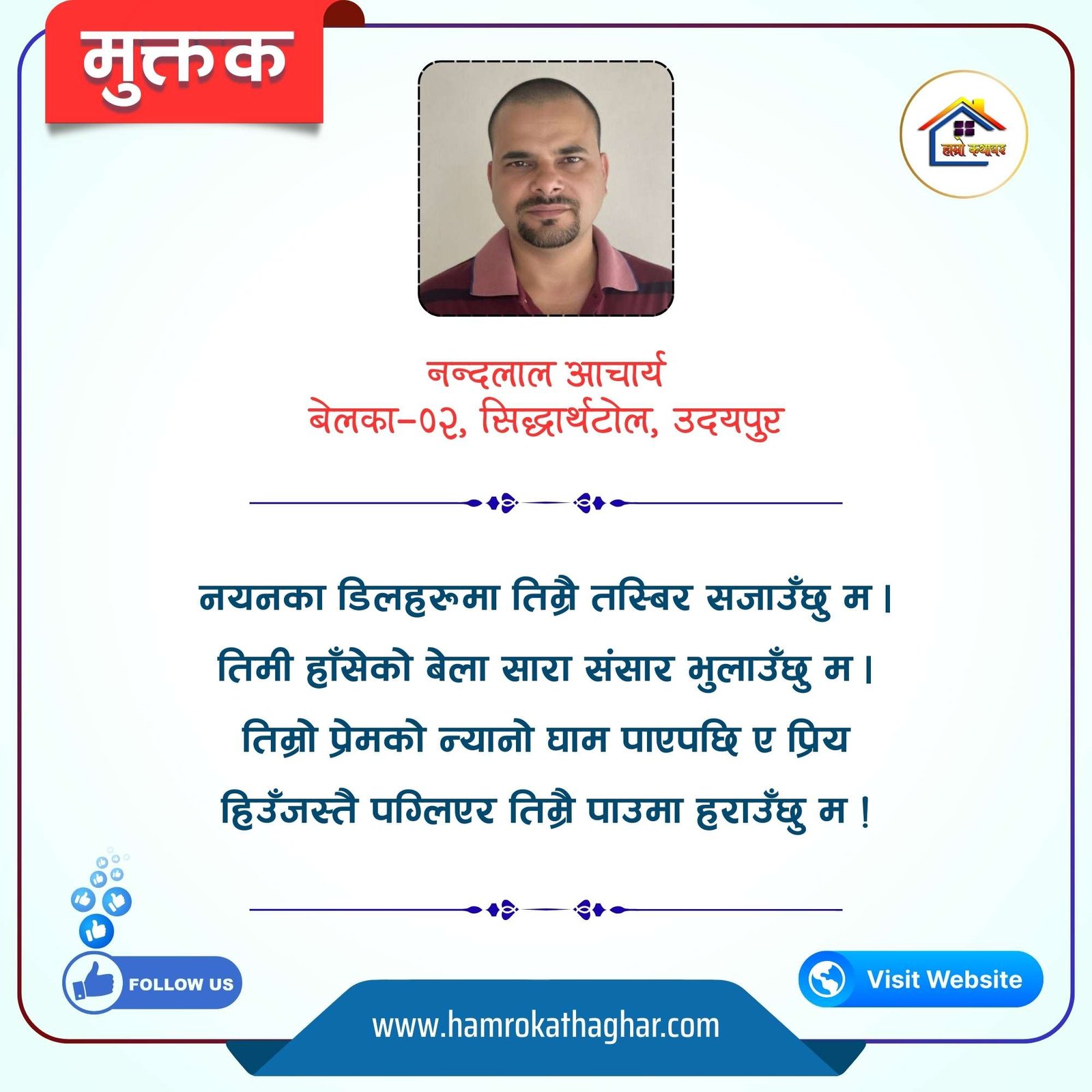 नेपाली भाषा साहित्यलाई माया गरेर यहाँसम्म आइ, यहाँ प्रकाशित लेख/रचनाहरू पढिदिनु भएकोमा तपाईँलाई धेरै धेरै धन्यवाद। तपाईँले भर्खरै माथि पढेको लेख/रचना कस्तो लाग्यो कमेन्ट बक्समा आफ्नो प्रतिक्रिया राख्न सक्नु हुनेछ। आफ्नो मनमा लागेको प्रतिक्रिया राख्न तपाईँ स्वतन्त्र हुनुहुन्छ। यदि तपाईँ पनि नेपाली भाषा साहित्यमा कलम चलाउनु हुन्छ भने आफ्नो छोटो परिचय र एक प्रति अनुहार चिनिने तस्बिर सहित आफ्ना लेख/रचनाहरू हामीलाई hamrokathaghar@gmail.com मा पठाउन सक्नु हुनेछ। अन्य कुनै पनि जानकारीका लागि +९१८७३८०९३५७३ नम्बरमा ह्वाट्सएप गर्न सक्नु हुनेछ। धन्यवाद । नोट: यहाँ प्रकाशित कुनै पनि लेख/रचनाहरू लेखकको वा 'हाम्रो कथा घर' को अनुमति बिना कुनै पनि माध्यमबाट प्रकाशन प्रसारण गर्न पाइने छैन । अन्यथा, यस्तो गरिएको पाएमा प्रचलित कानुन बमोजिम कारबाही गरिने जानकारी गराउँदछौ।