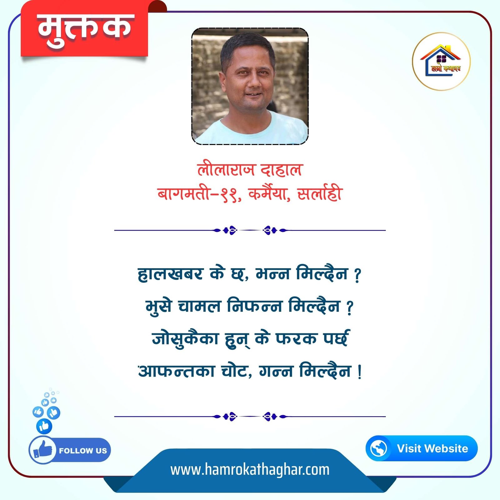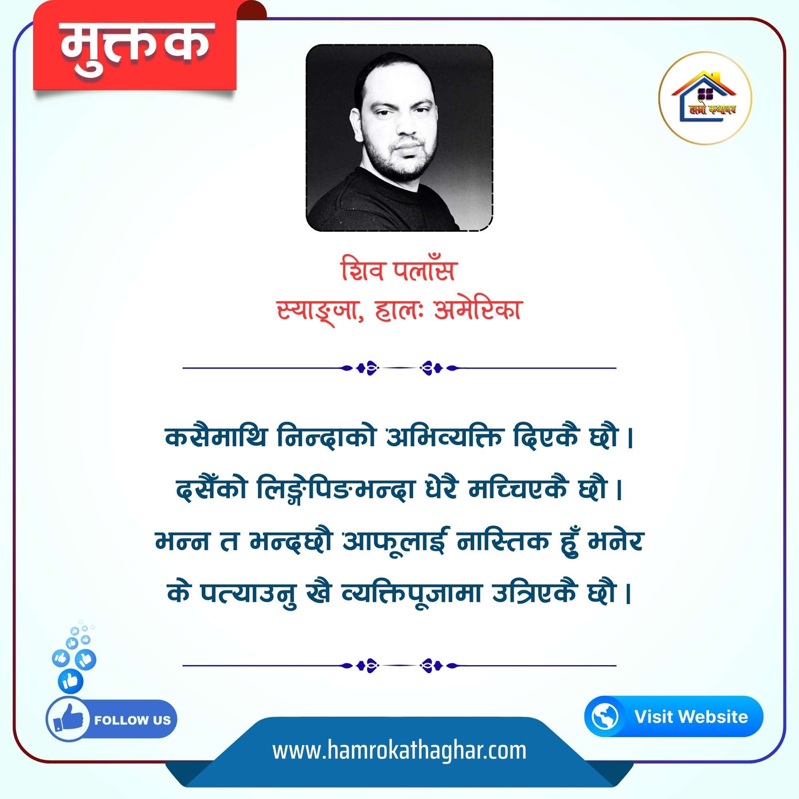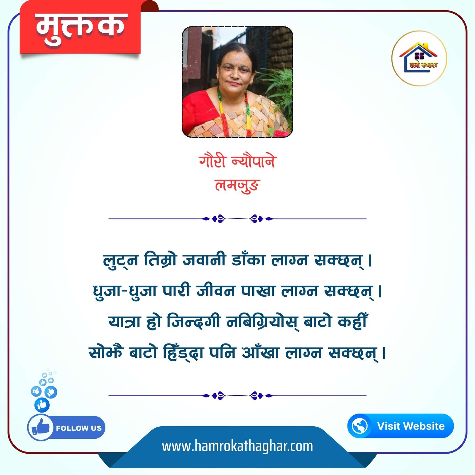 नेपाली भाषा साहित्यलाई माया गरेर यहाँसम्म आइ, यहाँ प्रकाशित लेख/रचनाहरू पढिदिनु भएकोमा तपाईँलाई धेरै धेरै धन्यवाद। तपाईँले भर्खरै माथि पढेको लेख/रचना कस्तो लाग्यो कमेन्ट बक्समा आफ्नो प्रतिक्रिया राख्न सक्नु हुनेछ। आफ्नो मनमा लागेको प्रतिक्रिया राख्न तपाईँ स्वतन्त्र हुनुहुन्छ। यदि तपाईँ पनि नेपाली भाषा साहित्यमा कलम चलाउनु हुन्छ भने आफ्नो छोटो परिचय र एक प्रति अनुहार चिनिने तस्बिर सहित आफ्ना लेख/रचनाहरू हामीलाई hamrokathaghar@gmail.com मा पठाउन सक्नु हुनेछ। अन्य कुनै पनि जानकारीका लागि +९१८७३८०९३५७३ नम्बरमा ह्वाट्सएप गर्न सक्नु हुनेछ। धन्यवाद । नोट: यहाँ प्रकाशित कुनै पनि लेख/रचनाहरू लेखकको वा 'हाम्रो कथा घर' को अनुमति बिना कुनै पनि माध्यमबाट प्रकाशन प्रसारण गर्न पाइने छैन । अन्यथा, यस्तो गरिएको पाएमा प्रचलित कानुन बमोजिम कारबाही गरिने जानकारी गराउँदछौ।