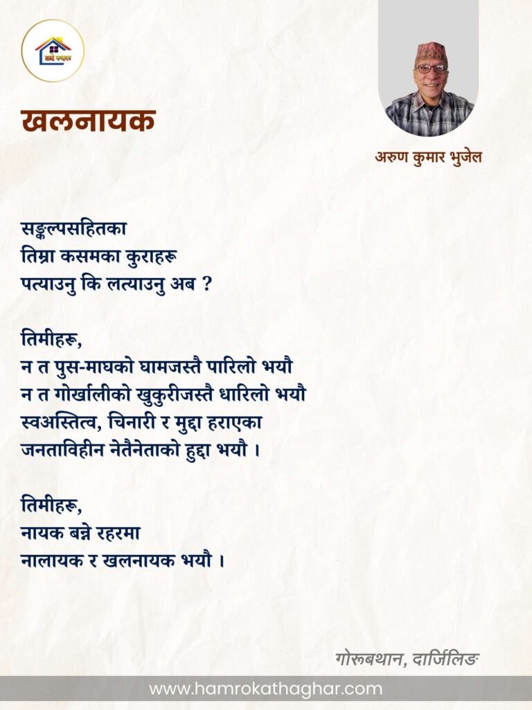 नेपाली भाषा साहित्यलाई माया गरेर यहाँसम्म आइ, यहाँ प्रकाशित लेख/रचनाहरू पढिदिनु भएकोमा तपाईँलाई धेरै धेरै धन्यवाद। तपाईँले भर्खरै माथि पढेको लेख/रचना कस्तो लाग्यो कमेन्ट बक्समा आफ्नो प्रतिक्रिया राख्न सक्नु हुनेछ। आफ्नो मनमा लागेको प्रतिक्रिया राख्न तपाईँ स्वतन्त्र हुनुहुन्छ। यदि तपाईँ पनि नेपाली भाषा साहित्यमा कलम चलाउनु हुन्छ भने आफ्नो छोटो परिचय र एक प्रति अनुहार चिनिने तस्बिर सहित आफ्ना लेख/रचनाहरू हामीलाई hamrokathaghar@gmail.com मा पठाउन सक्नु हुनेछ। अन्य कुनै पनि जानकारीका लागि +९१८७३८०९३५७३ नम्बरमा ह्वाट्सएप गर्न सक्नु हुनेछ। धन्यवाद । नोट: यहाँ प्रकाशित कुनै पनि लेख/रचनाहरू लेखकको वा 'हाम्रो कथा घर' को अनुमति बिना कुनै पनि माध्यमबाट प्रकाशन प्रसारण गर्न पाइने छैन । अन्यथा, यस्तो गरिएको पाएमा प्रचलित कानुन बमोजिम कारबाही गरिने जानकारी गराउँदछौ।
