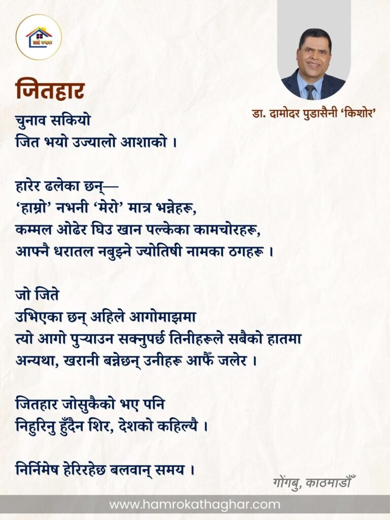 नेपाली भाषा साहित्यलाई माया गरेर यहाँसम्म आइ, यहाँ प्रकाशित लेख/रचनाहरू पढिदिनु भएकोमा तपाईँलाई धेरै धेरै धन्यवाद। तपाईँले भर्खरै माथि पढेको लेख/रचना कस्तो लाग्यो कमेन्ट बक्समा आफ्नो प्रतिक्रिया राख्न सक्नु हुनेछ। आफ्नो मनमा लागेको प्रतिक्रिया राख्न तपाईँ स्वतन्त्र हुनुहुन्छ। यदि तपाईँ पनि नेपाली भाषा साहित्यमा कलम चलाउनु हुन्छ भने आफ्नो छोटो परिचय र एक प्रति अनुहार चिनिने तस्बिर सहित आफ्ना लेख/रचनाहरू हामीलाई hamrokathaghar@gmail.com मा पठाउन सक्नु हुनेछ। अन्य कुनै पनि जानकारीका लागि +९१८७३८०९३५७३ नम्बरमा ह्वाट्सएप गर्न सक्नु हुनेछ। धन्यवाद । नोट: यहाँ प्रकाशित कुनै पनि लेख/रचनाहरू लेखकको वा 'हाम्रो कथा घर' को अनुमति बिना कुनै पनि माध्यमबाट प्रकाशन प्रसारण गर्न पाइने छैन । अन्यथा, यस्तो गरिएको पाएमा प्रचलित कानुन बमोजिम कारबाही गरिने जानकारी गराउँदछौ।