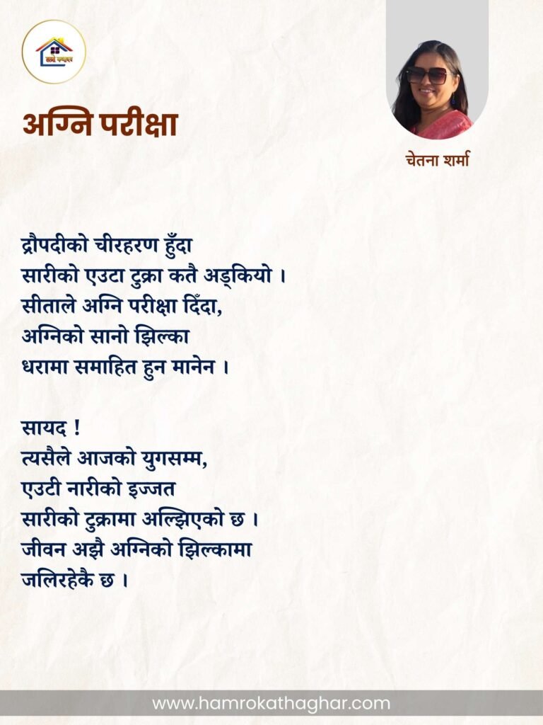 नेपाली भाषा साहित्यलाई माया गरेर यहाँसम्म आइ, यहाँ प्रकाशित लेख/रचनाहरू पढिदिनु भएकोमा तपाईँलाई धेरै धेरै धन्यवाद। तपाईँले भर्खरै माथि पढेको लेख/रचना कस्तो लाग्यो कमेन्ट बक्समा आफ्नो प्रतिक्रिया राख्न सक्नु हुनेछ। आफ्नो मनमा लागेको प्रतिक्रिया राख्न तपाईँ स्वतन्त्र हुनुहुन्छ। यदि तपाईँ पनि नेपाली भाषा साहित्यमा कलम चलाउनु हुन्छ भने आफ्नो छोटो परिचय र एक प्रति अनुहार चिनिने तस्बिर सहित आफ्ना लेख/रचनाहरू हामीलाई hamrokathaghar@gmail.com मा पठाउन सक्नु हुनेछ। अन्य कुनै पनि जानकारीका लागि +९१८७३८०९३५७३ नम्बरमा ह्वाट्सएप गर्न सक्नु हुनेछ। धन्यवाद । नोट: यहाँ प्रकाशित कुनै पनि लेख/रचनाहरू लेखकको वा 'हाम्रो कथा घर' को अनुमति बिना कुनै पनि माध्यमबाट प्रकाशन प्रसारण गर्न पाइने छैन । अन्यथा, यस्तो गरिएको पाएमा प्रचलित कानुन बमोजिम कारबाही गरिने जानकारी गराउँदछौ।