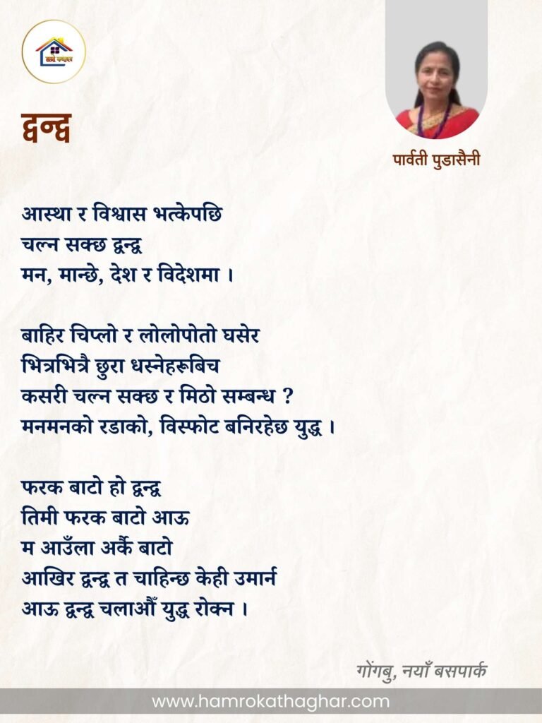 नेपाली भाषा साहित्यलाई माया गरेर यहाँसम्म आइ, यहाँ प्रकाशित लेख/रचनाहरू पढिदिनु भएकोमा तपाईँलाई धेरै धेरै धन्यवाद। तपाईँले भर्खरै माथि पढेको लेख/रचना कस्तो लाग्यो कमेन्ट बक्समा आफ्नो प्रतिक्रिया राख्न सक्नु हुनेछ। आफ्नो मनमा लागेको प्रतिक्रिया राख्न तपाईँ स्वतन्त्र हुनुहुन्छ। यदि तपाईँ पनि नेपाली भाषा साहित्यमा कलम चलाउनु हुन्छ भने आफ्नो छोटो परिचय र एक प्रति अनुहार चिनिने तस्बिर सहित आफ्ना लेख/रचनाहरू हामीलाई hamrokathaghar@gmail.com मा पठाउन सक्नु हुनेछ। अन्य कुनै पनि जानकारीका लागि +९१८७३८०९३५७३ नम्बरमा ह्वाट्सएप गर्न सक्नु हुनेछ। धन्यवाद । नोट: यहाँ प्रकाशित कुनै पनि लेख/रचनाहरू लेखकको वा 'हाम्रो कथा घर' को अनुमति बिना कुनै पनि माध्यमबाट प्रकाशन प्रसारण गर्न पाइने छैन । अन्यथा, यस्तो गरिएको पाएमा प्रचलित कानुन बमोजिम कारबाही गरिने जानकारी गराउँदछौ।