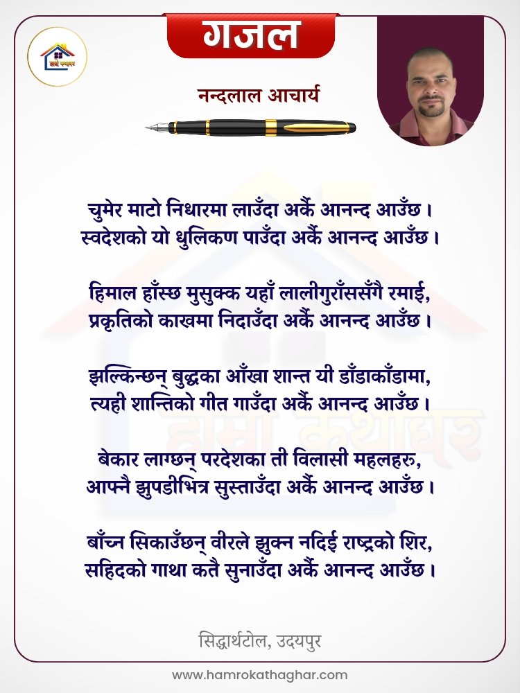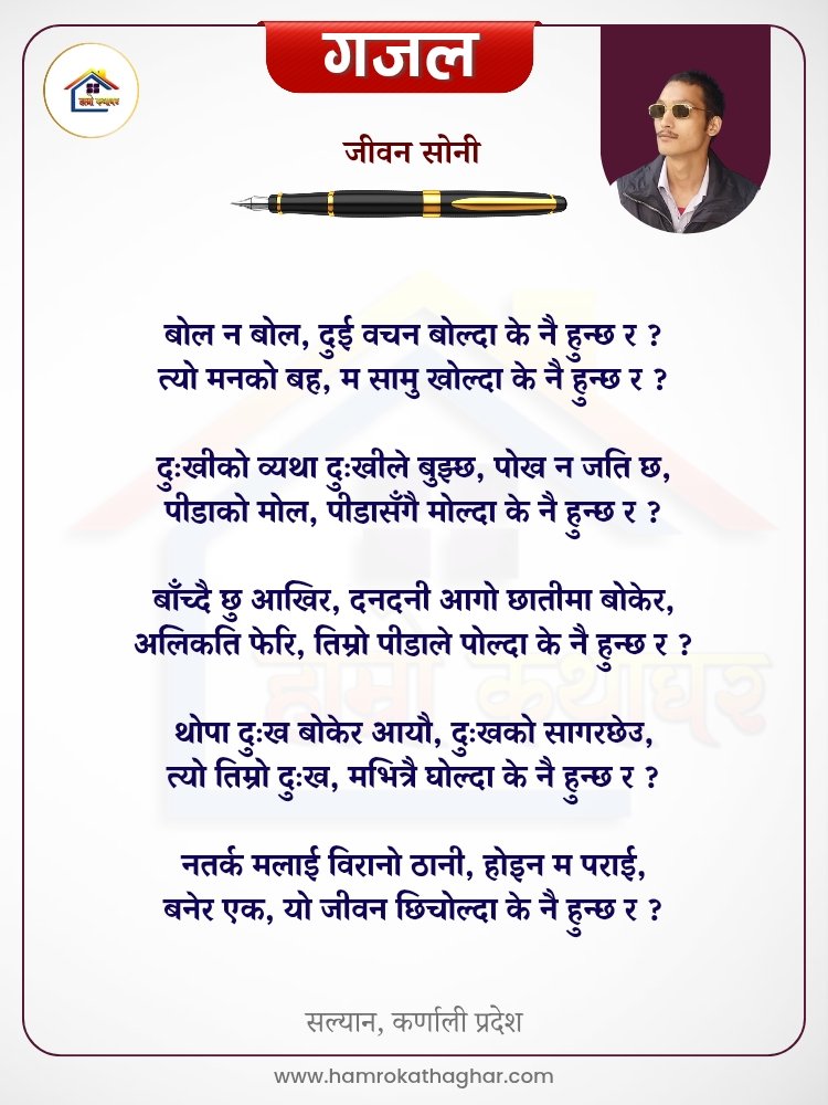 नेपाली भाषा साहित्यलाई माया गरेर यहाँसम्म आइ, यहाँ प्रकाशित लेख/रचनाहरू पढिदिनु भएकोमा तपाईँलाई धेरै धेरै धन्यवाद। तपाईँले भर्खरै माथि पढेको लेख/रचना कस्तो लाग्यो कमेन्ट बक्समा आफ्नो प्रतिक्रिया राख्न सक्नु हुनेछ। आफ्नो मनमा लागेको प्रतिक्रिया राख्न तपाईँ स्वतन्त्र हुनुहुन्छ। यदि तपाईँ पनि नेपाली भाषा साहित्यमा कलम चलाउनु हुन्छ भने आफ्नो छोटो परिचय र एक प्रति अनुहार चिनिने तस्बिर सहित आफ्ना लेख/रचनाहरू हामीलाई hamrokathaghar@gmail.com मा पठाउन सक्नु हुनेछ। अन्य कुनै पनि जानकारीका लागि +९१८७३८०९३५७३ नम्बरमा ह्वाट्सएप गर्न सक्नु हुनेछ। धन्यवाद । नोट: यहाँ प्रकाशित कुनै पनि लेख/रचनाहरू लेखकको वा 'हाम्रो कथा घर' को अनुमति बिना कुनै पनि माध्यमबाट प्रकाशन प्रसारण गर्न पाइने छैन । अन्यथा, यस्तो गरिएको पाएमा प्रचलित कानुन बमोजिम कारबाही गरिने जानकारी गराउँदछौ।